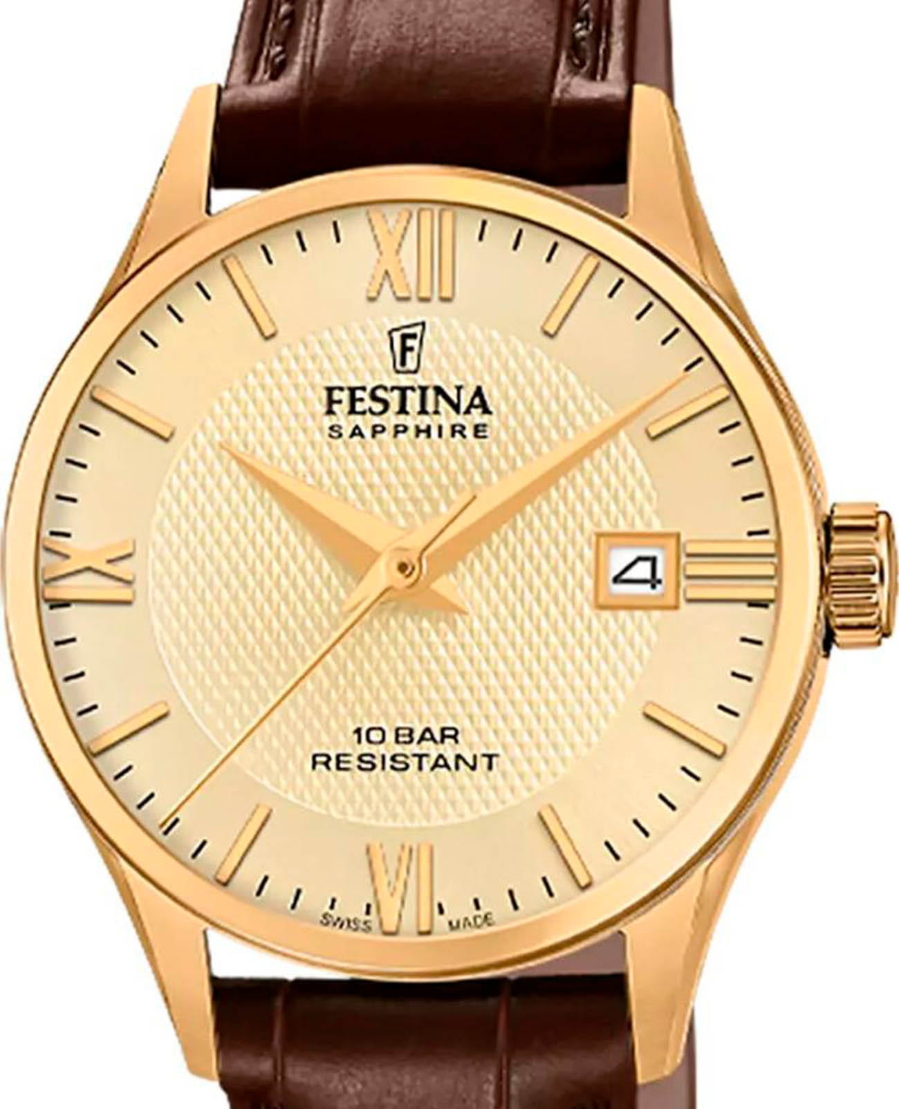 Женские кварцевые часы Festina F20011/6 — классический испанский дизайн с изысканной детализацией. Круглый корпус размером 29 мм из стали с IP-покрытиемIP-покрытиеМетод ионного напыления. Демонстрирует повышенную устойчивость к истиранию, окислению и химическим веществам. Под воздействием высокого давления и температуры около 1500°C молекулы металла надёжно соединяются с частицами корпуса часов., циферблат цвета шампань с декоративным узором Clous de Paris, римскими цифрами и штрихами. Окошко даты расположено в положении 3 часов. Стекло — сапфировоеСапфировое стеклоПрочный и надёжный материал из кристалла сапфира синтетического происхождения, характеризующийся особой твёрдостью и устойчивостью к царапинам и повреждениям.. Механизм — швейцарский кварцевый Ronda 705. Водонепроницаемость 100 м. Ремешок — кожаный на стандартной застёжке. Идеальный выбор для тех, кто ценит испанский стиль и элегантную классику.