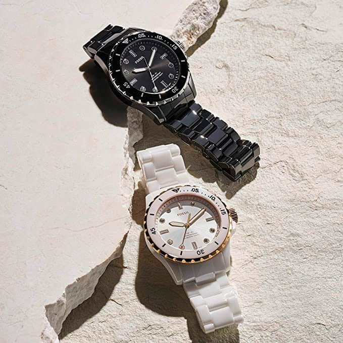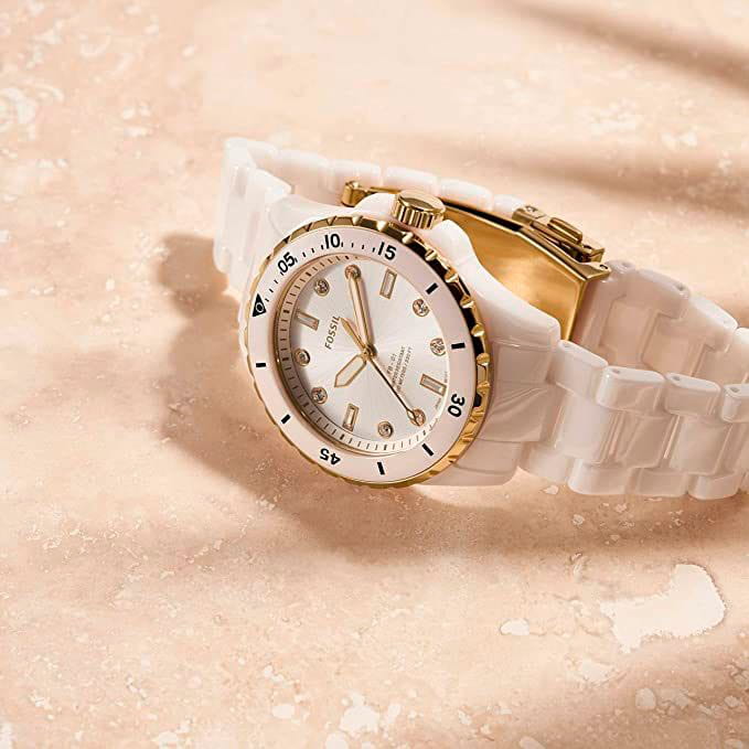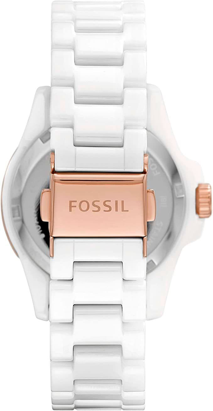 Женские наручные часы Fossil на браслете Fossil FB-01 CE1107, кварцевый механизм с высокой точностью. Класс водозащиты: 100 метров, позволит плавать, нырять и заниматься другими водными видами спорта. Стрелки с люминесцентным покрытиемЛюминесцентное покрытиеПозволяет считывать показания времени в темноте. Производители наносят на стрелки, часовые индексы, безель или поверхность циферблата светонакопительный состав, дающий холодное свечение.. Циферблат украшен кристаллами. Корпус часов изготовлен из стали. Керамический браслет с раскладной застёжкойРаскладная застёжкаТакой тип застёжки используется только на браслетах из металла. Она никогда не раскрывается полностью, происходит разделение на 2 и более частей. Раскладывающая застёжка снизит вероятность потери часов к минимуму..