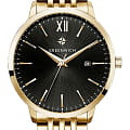 Мужские английские часы Greenwich GW 061.20.11 с минеральным стекломМинеральное стеклоМинеральное стекло представляет собой искусственно выращенный минерал кварца. Такое стекло отличается особой устойчивостью к повреждениям и царапинам. Уступает по некоторым качествам сапфировому стеклу.. Классические мужские часы серии Brig прекрасно подойдут как под костюм, так и под одежду направления casual. В часах установлен точный японский механизм Miyota. Корпус часов изготовлен из нержавеющей гипоаллергенной стали с PVDPVDУльтратонкое покрытие наносится в технике вакуумного напыления, сочетает в себе нитрид титана особой прочности со слоем золота или оксида хрома. Несёт в себе декоративную или защитную функцию. покрытием из желтого золота: он изящно смотрится на руке и не создает неудобств при контакте с одеждой с длинным рукавом. Размер корпуса 41 мм. Полировка на циферблате черного цвета выполнена в виде солнечных лучей. Индексы часов изготовлены вручную и закреплены на двух штифтах. Выпуклая форма рисок создает эффект игры солнечных бликов. Объемные часовая и минутная стрелки имеют мечеобразную форму. В модели представлена дополнительная функция – дата. Ее окошко расположено на уровне трех часов. Циферблат надежно защищен минеральным стеклом. Часы установлены на стальной браслет с надежной застежкой-клипсой. Логотип марки – изображение «розы ветров», символа удачи и новых открытий – расположен на циферблате, заводной головке и внутренней части бралета. Задняя крышка часов украшена изображениями логотипа и корабля, который является символом марки Greenwich.