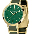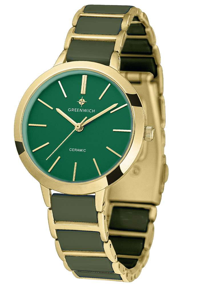 Кварцевые часы Greenwich Fortune GW 331.20.38 созданы для поклонников минимализма. Диаметр круглого корпуса из прочной нержавеющей стали с PVD-покрытиемPVDУльтратонкое покрытие наносится в технике вакуумного напыления, сочетает в себе нитрид титана особой прочности со слоем золота или оксида хрома. Несёт в себе декоративную или защитную функцию. равен 32 мм, а это значит, что их могут смело выбирать даже обладательницы самого изящного запястья. На матовом циферблате хорошо читаются полированные риски и стрелки часов, минут и секунд – они контрастно выделяются на темно-зеленом фоне. Стальной браслет на раскладной застёжкеРаскладная застёжкаТакой тип застёжки используется только на браслетах из металла. Она никогда не раскрывается полностью, происходит разделение на 2 и более частей. Раскладывающая застёжка снизит вероятность потери часов к минимуму. состоит из двух частей: полированное обрамление из нержавеющей стали и звенья из керамики. Благодаря такому сочетанию браслет надолго сохранит первоначальный внешний вид. Минеральное стеклоМинеральное стеклоМинеральное стекло представляет собой искусственно выращенный минерал кварца. Такое стекло отличается особой устойчивостью к повреждениям и царапинам. Уступает по некоторым качествам сапфировому стеклу. защищает циферблат от царапин.