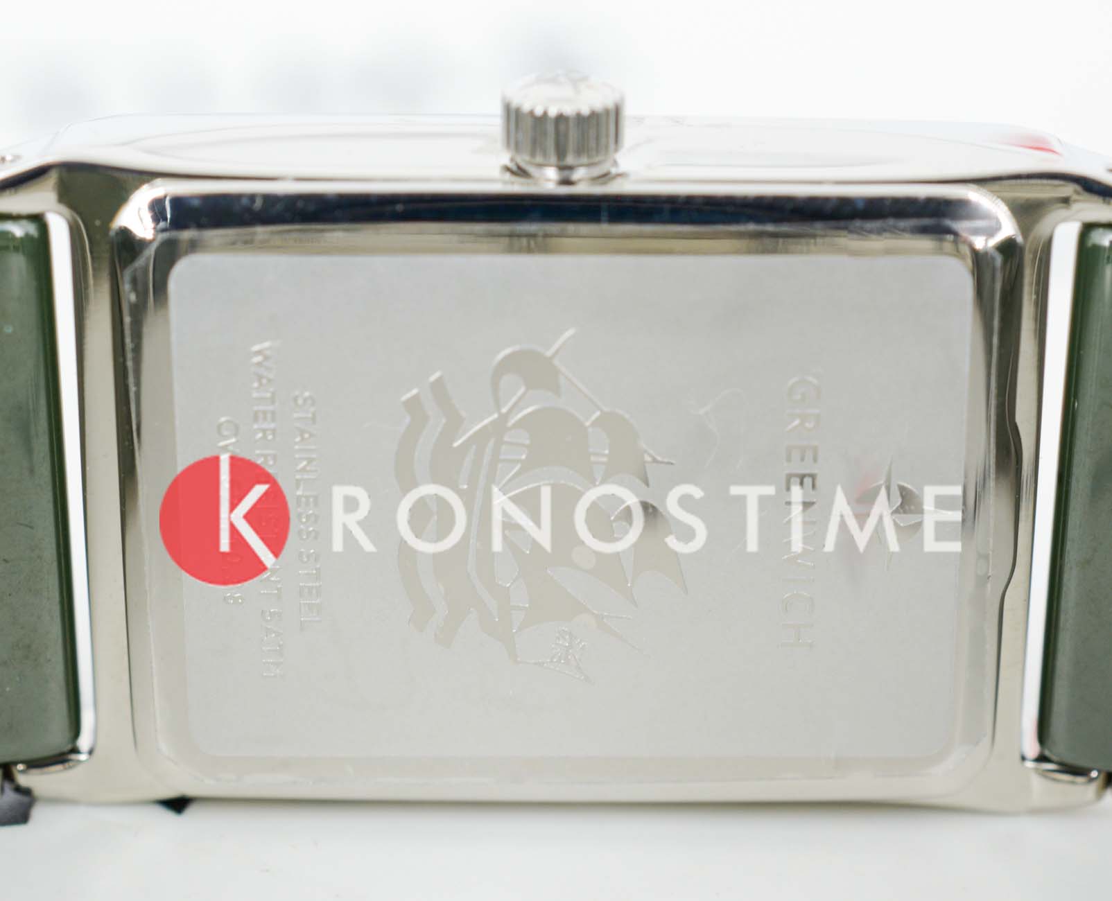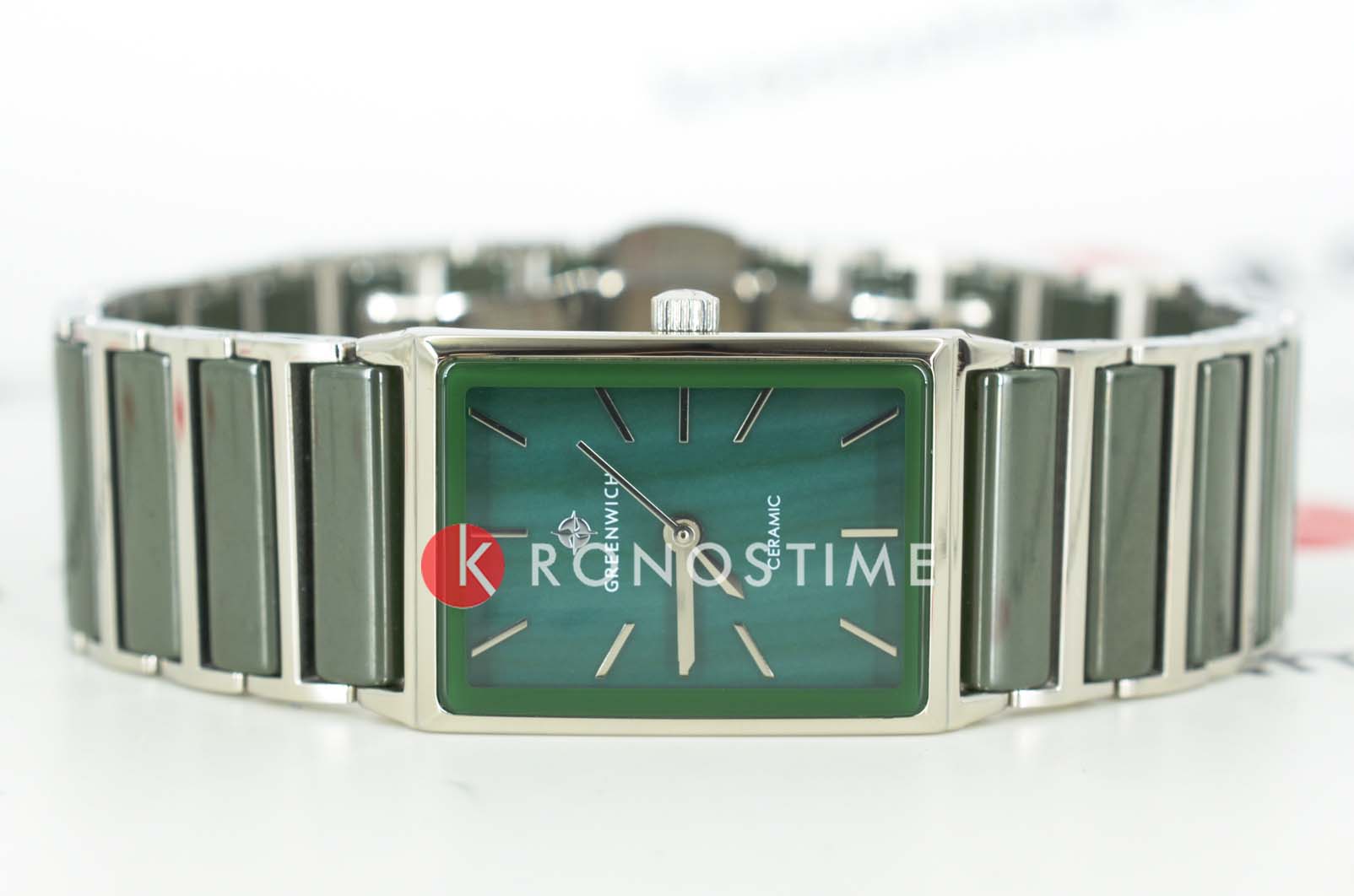 Кварцевые часы Greenwich Electra GW 521.10.38 созданы для поклонников минимализма. Корпус из нержавеющей стали выполнен в форме прямоугольника 20 x 28 мм, а это значит, что их могут смело выбирать даже обладательницы самого изящного запястья. На циферблате хорошо читаются полированные риски и стрелки часов, минут и секунд – они контрастно выделяются на темно-зеленом фоне. Стальной браслет на застёжке «бабочка» с кнопкамиЗастёжка "бабочка"Такой вид застёжки дополняется предохранителями, помогающими избежать случайного раскрытия браслета. Обладают изящным исполнением. состоит из двух частей: полированное обрамление из нержавеющей стали и звенья из керамики. Благодаря такому сочетанию браслет надолго сохранит первоначальный внешний вид. Минеральное стеклоМинеральное стеклоМинеральное стекло представляет собой искусственно выращенный минерал кварца. Такое стекло отличается особой устойчивостью к повреждениям и царапинам. Уступает по некоторым качествам сапфировому стеклу. защищает циферблат от царапин. На задней крышке часов — гравировка в виде корабля, на всех парусах несущегося на встречу приключениям.