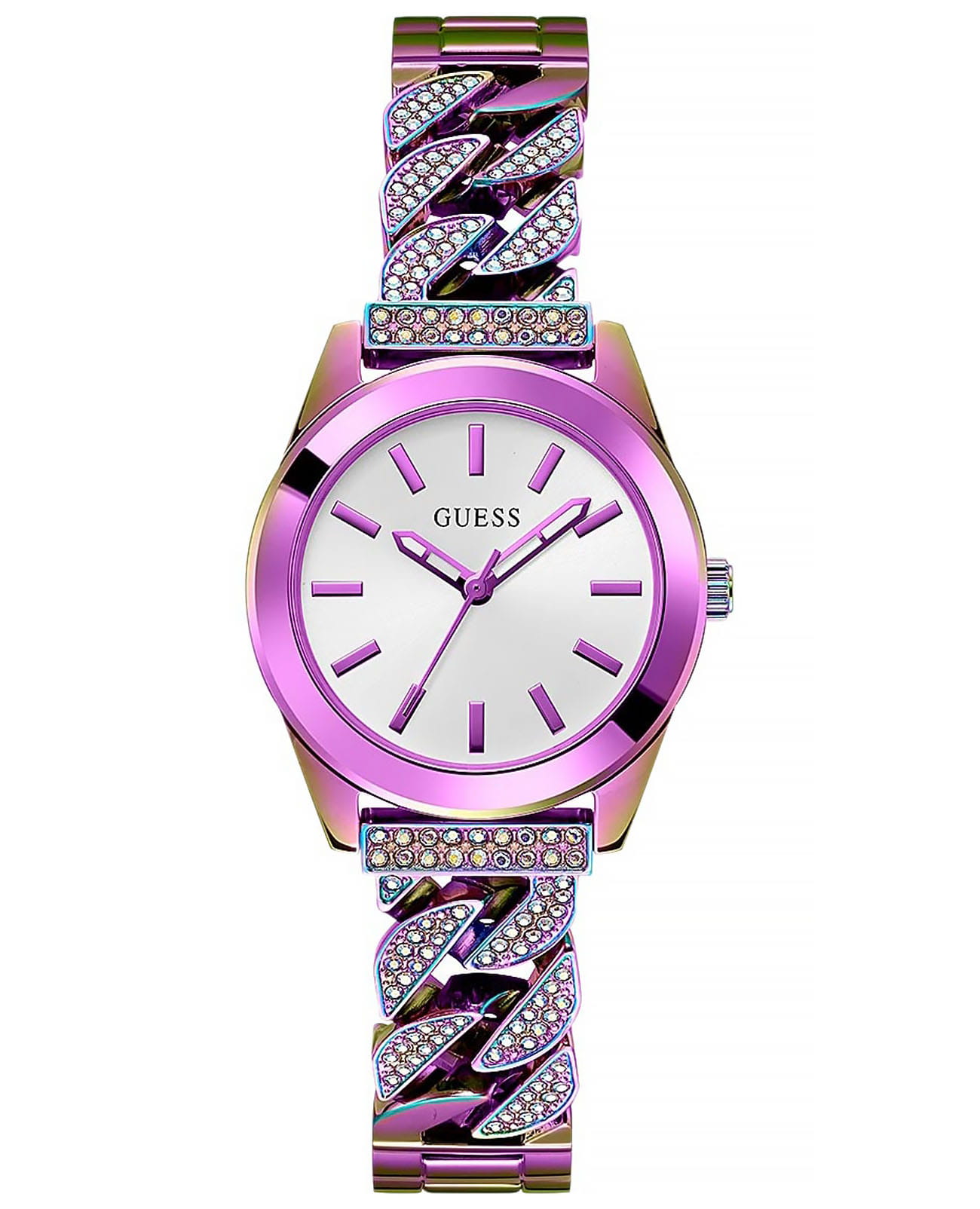 Мужские наручные часы Guess Trend GW0546L3 с минеральным стекломМинеральное стеклоМинеральное стекло представляет собой искусственно выращенный минерал кварца. Такое стекло отличается особой устойчивостью к повреждениям и царапинам. Уступает по некоторым качествам сапфировому стеклу., кварцевый механизм с высокой точностью. Класс водозащиты: 30 метров, позволит защитить корпус от случайных брызг или капель дождя. Стрелки с люминесцентным покрытиемЛюминесцентное покрытиеПозволяет считывать показания времени в темноте. Производители наносят на стрелки, часовые индексы, безель или поверхность циферблата светонакопительный состав, дающий холодное свечение.. Корпус часов и браслет изготовлены из стали с IP-покрытиемIP-покрытиеМетод ионного напыления. Демонстрирует повышенную устойчивость к истиранию, окислению и химическим веществам. Под воздействием высокого давления и температуры около 1500°C молекулы металла надёжно соединяются с частицами корпуса часов.. Браслет с ювелирной застежкой и украшен кристаллами.