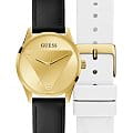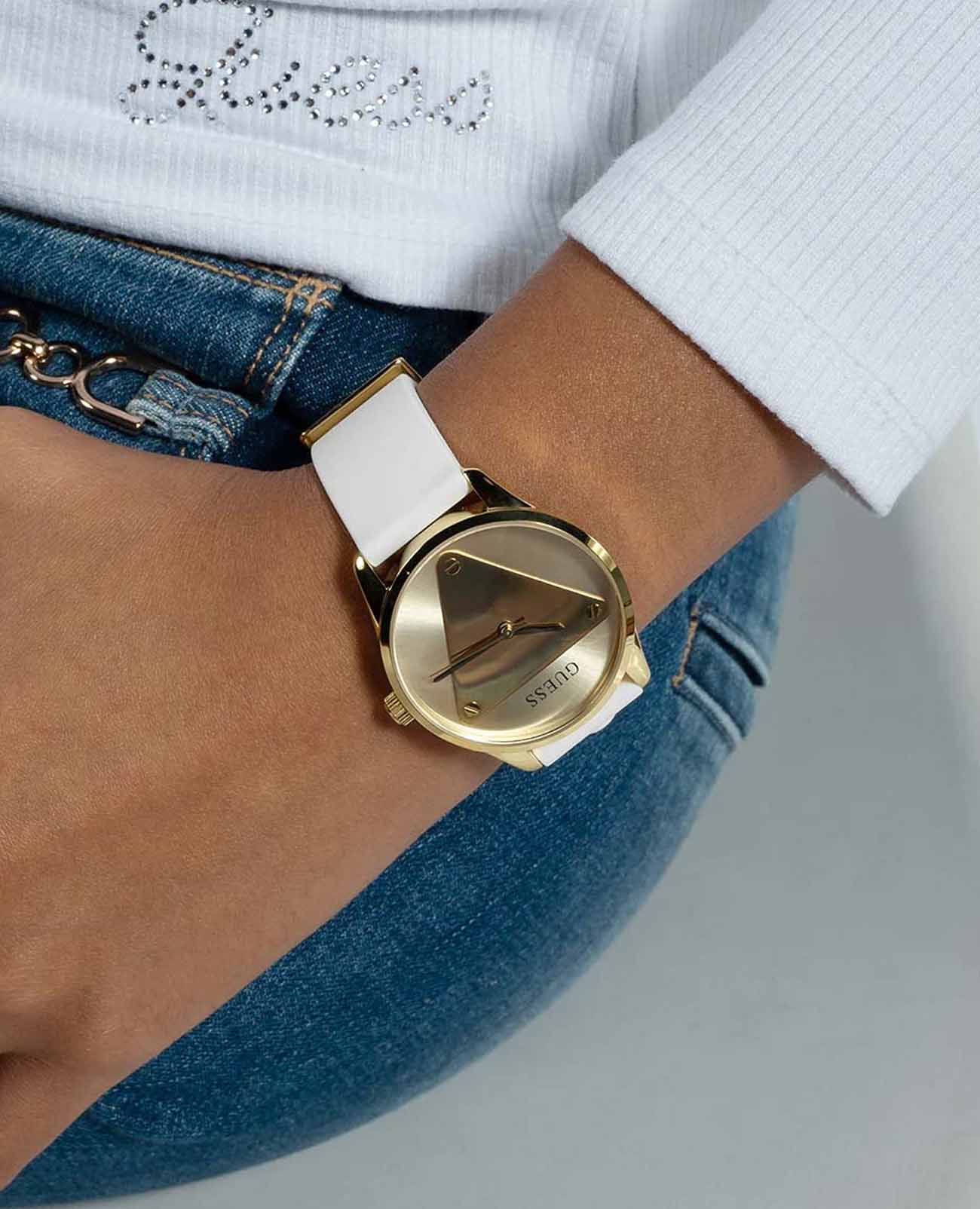 Женские наручные часы Guess Trend GW0642L1 с минеральным стекломМинеральное стеклоМинеральное стекло представляет собой искусственно выращенный минерал кварца. Такое стекло отличается особой устойчивостью к повреждениям и царапинам. Уступает по некоторым качествам сапфировому стеклу., кварцевый механизм с высокой точностью. Корпус часов изготовлен из стали с IP-покрытиемIP-покрытиеМетод ионного напыления. Демонстрирует повышенную устойчивость к истиранию, окислению и химическим веществам. Под воздействием высокого давления и температуры около 1500°C молекулы металла надёжно соединяются с частицами корпуса часов.. Циферблат выполнен по технологии Sunray (солнечные лучи). Класс водозащиты: 30 метров, позволит защитить корпус от случайных брызг или капель дождя. Кожаный ремешок на стандартной застежке. В комплекте белый силиконовый ремешок.
