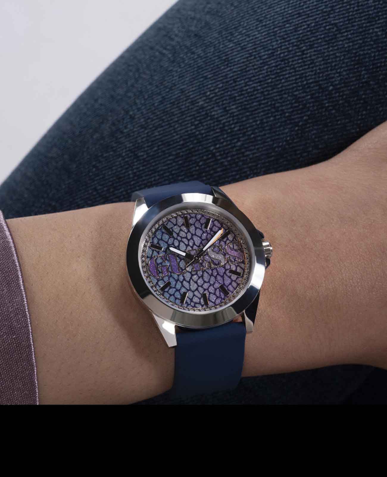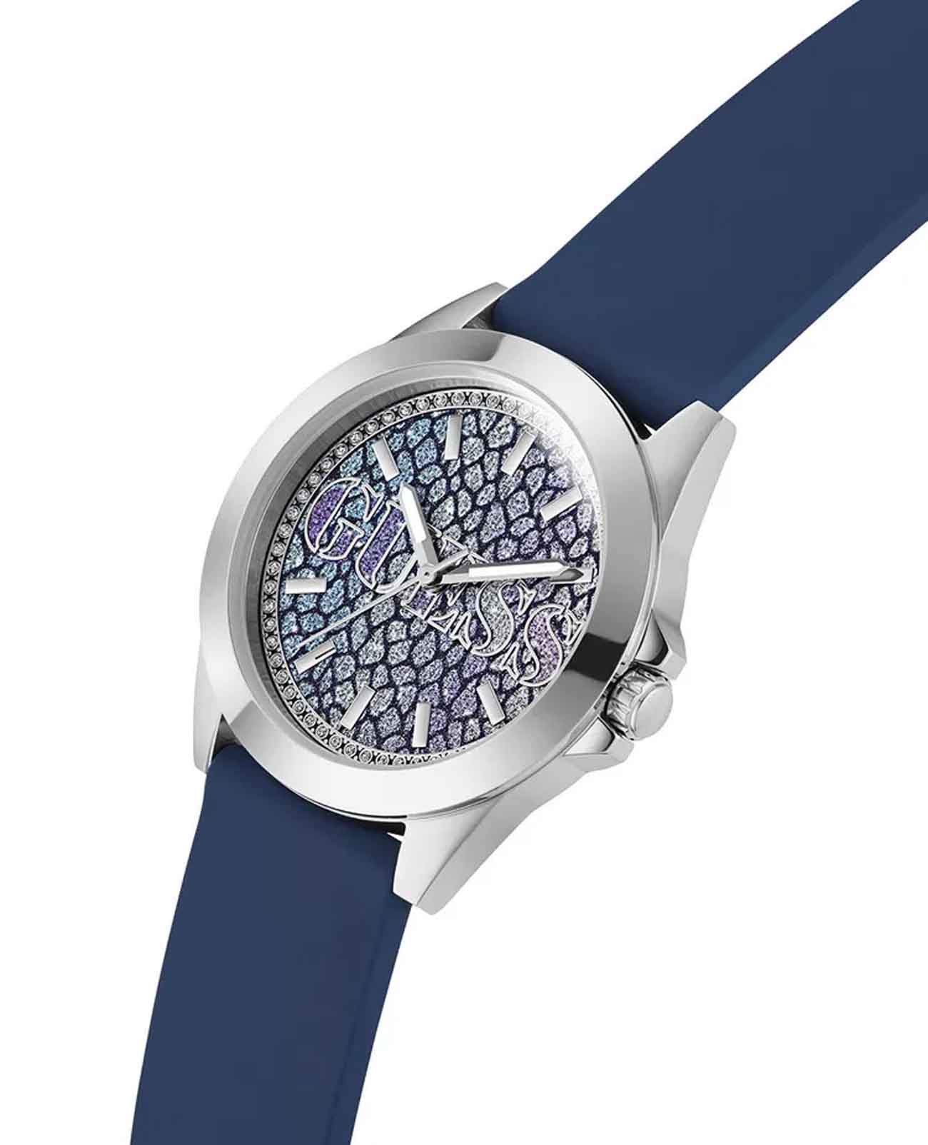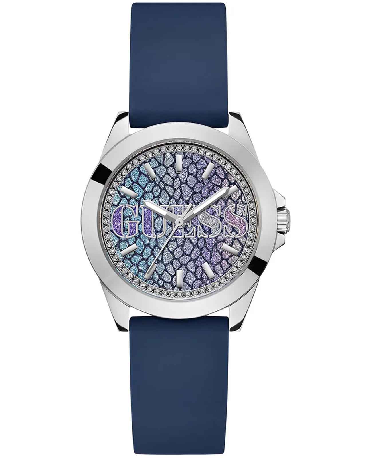Женские наручные часы с минеральным стекломМинеральное стеклоМинеральное стекло представляет собой искусственно выращенный минерал кварца. Такое стекло отличается особой устойчивостью к повреждениям и царапинам. Уступает по некоторым качествам сапфировому стеклу. Guess Trend GW0749L1, кварцевый механизм с высокой точностью. Корпус часов изготовлен из стали. Циферблат украшен кристаллами. Стрелки с люминесцентным покрытиемЛюминесцентное покрытиеПозволяет считывать показания времени в темноте. Производители наносят на стрелки, часовые индексы, безель или поверхность циферблата светонакопительный состав, дающий холодное свечение.. Класс водозащиты: 30 метров, позволит защитить корпус от случайных брызг или капель дождя. Силиконовый ремешок на стандартной застежке.