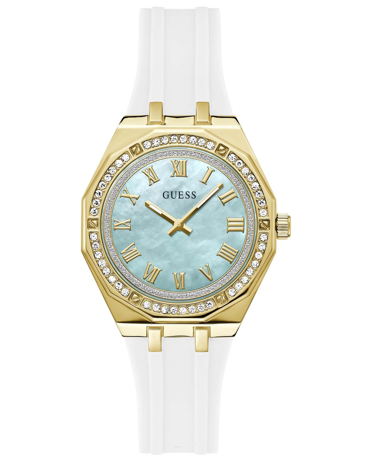Часы Guess Dress 17300 — это изысканный аксессуар, который станет отличным дополнением к образу современной женщины. Эти наручные оснащены надежным кварцевым механизмом. Стальной корпус с золотистым IP-покрытиемIP-покрытиеМетод ионного напыления. Демонстрирует повышенную устойчивость к истиранию, окислению и химическим веществам. Под воздействием высокого давления и температуры около 1500°C молекулы металла надёжно соединяются с частицами корпуса часов. придаёт часам элегантный и стильный вид. Римские цифры обеспечивают удобное считывание времени и добавляют классический штрих. Люминесцентное покрытиеЛюминесцентное покрытиеПозволяет считывать показания времени в темноте. Производители наносят на стрелки, часовые индексы, безель или поверхность циферблата светонакопительный состав, дающий холодное свечение. на стрелках обеспечивает отличную видимость в темноте. Силиконовый браслет имеет белый цвет и гарантирует комфортное ношение и надежную фиксацию на запястье. Водозащита 50WR позволяет не беспокоиться о случайных брызгах и контакте с водой. Минеральное стеклоМинеральное стеклоМинеральное стекло представляет собой искусственно выращенный минерал кварца. Такое стекло отличается особой устойчивостью к повреждениям и царапинам. Уступает по некоторым качествам сапфировому стеклу. защищает циферблат от царапин и повреждений, обеспечивая долговечность и сохранность внешнего вида.