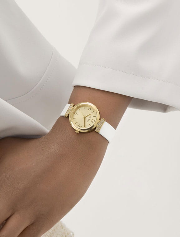 Часы Guess GW0912L2 представляют собой элегантное сочетание стиля и технологии. Оснащенные кварцевым механизмом, они обеспечивают точность и надежность. Корпус выполнен из стали с PVD-покрытиемPVDУльтратонкое покрытие наносится в технике вакуумного напыления, сочетает в себе нитрид титана особой прочности со слоем золота или оксида хрома. Несёт в себе декоративную или защитную функцию. золотистого цвета, диаметром 28 мм, что придаёт модели прочность и изысканный внешний вид. Циферблат украшен гильошированным узором в центральной части, а метки выполнены в виде штрихов и арабских цифр, что обеспечивает легкость восприятия времени. Круглый корпус декорирован кристаллами, добавляя блеск и шарм. Минеральное стеклоМинеральное стеклоМинеральное стекло представляет собой искусственно выращенный минерал кварца. Такое стекло отличается особой устойчивостью к повреждениям и царапинам. Уступает по некоторым качествам сапфировому стеклу. защищает циферблат, а рифленая заводная головка облегчает настройку времени. Силиконовый ремешок с классической застежкой обеспечивает комфортное ношение на протяжении всего дня. Водозащита 30WR защищает часы от брызг и дождя, делая их практичными для повседневного использования. Guess – это не просто аксессуар, это заявление о вашем безупречном вкусе и стремлении к совершенству.
