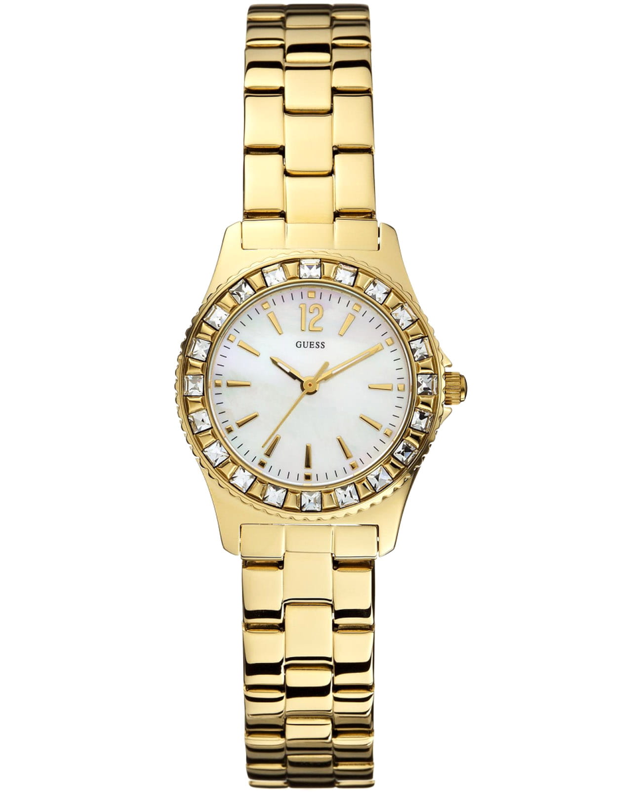 Женские наручные часы Guess Sport W0025L2 — изысканный аксессуар, сочетающий в себе элегантность и современный стиль. Круглый корпус из стали с золотистым IP-покрытиемIP-покрытиеМетод ионного напыления. Демонстрирует повышенную устойчивость к истиранию, окислению и химическим веществам. Под воздействием высокого давления и температуры около 1500°C молекулы металла надёжно соединяются с частицами корпуса часов., диаметром 28 мм придает часам прочность и устойчивость к износу, обеспечивая их привлекательный внешний вид на долгие годы. Циферблат украшен метками в виде штрихов, что придает часам утонченность и изысканность. Минеральное стеклоМинеральное стеклоМинеральное стекло представляет собой искусственно выращенный минерал кварца. Такое стекло отличается особой устойчивостью к повреждениям и царапинам. Уступает по некоторым качествам сапфировому стеклу. защищает циферблат от царапин и других повреждений. Люминесцентное покрытиеЛюминесцентное покрытиеПозволяет считывать показания времени в темноте. Производители наносят на стрелки, часовые индексы, безель или поверхность циферблата светонакопительный состав, дающий холодное свечение. на стрелках обеспечивает отличную видимость в темноте. БезельБезельВнешний ободок, закрепляющий стекло. В спортивных часах так называется поворотное кольцо с делениями на циферблате, выполняет роль таймера – замеряет отрезки времени на шкале. Неподвижный безель – элемент декора. Однонаправленно вращающийся безель на дайверских часах позволяет фиксировать моменты погружения и выныривания на поверхность. дополнен кристаллами, которые добавляют аксессуару оригинальность и характер. Рифленая заводная головка обеспечивает удобство в использовании и подчеркивает внимание к деталям. Часы оснащены стальным браслетом с золотистым IP-покрытиемIP-покрытиеМетод ионного напыления. Демонстрирует повышенную устойчивость к истиранию, окислению и химическим веществам. Под воздействием высокого давления и температуры около 1500°C молекулы металла надёжно соединяются с частицами корпуса часов., который обеспечивает надежность и комфорт. Раскладная застежкаРаскладная застёжкаТакой тип застёжки используется только на браслетах из металла. Она никогда не раскрывается полностью, происходит разделение на 2 и более частей. Раскладывающая застёжка снизит вероятность потери часов к минимуму. гарантирует легкость и безопасность при ношении. Водозащита уровня 50WR защищает часы от случайных брызг, делая их подходящими для повседневного использования.