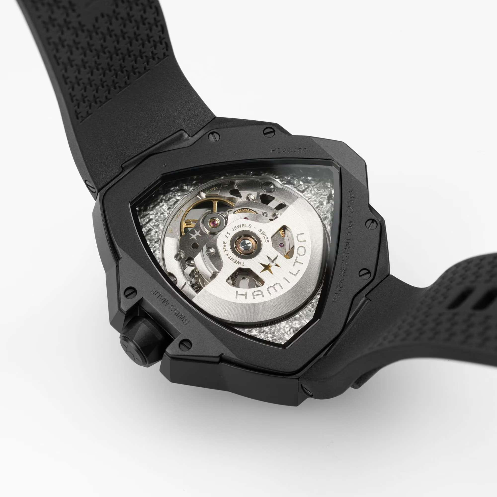 Мужские швейцарские механические часы с автоподзаводом Hamilton Ventura Edge Skeleton H24645330. Сапфировое стеклоСапфировое стеклоПрочный и надёжный материал из кристалла сапфира синтетического происхождения, характеризующийся особой твёрдостью и устойчивостью к царапинам и повреждениям. устойчивое к появлению царапин, обладающее высокой прозрачностью. Класс водозащиты: 50 метров, позволит защитить корпус от случайных брызг или капель дождя. Стрелки с люминесцентным покрытиемЛюминесцентное покрытиеПозволяет считывать показания времени в темноте. Производители наносят на стрелки, часовые индексы, безель или поверхность циферблата светонакопительный состав, дающий холодное свечение. SuperLumiNova® обеспечивают превосходную читаемость даже в условиях низкой освещённости. Изысканный корпус часов изготовлен из нержавеющей стали с PVD-покрытиемPVDУльтратонкое покрытие наносится в технике вакуумного напыления, сочетает в себе нитрид титана особой прочности со слоем золота или оксида хрома. Несёт в себе декоративную или защитную функцию. черного цвета. Под циферблатом находится механизм H-10-S с 80-часовым запасом хода и спиралью баланса Nivachron™Nivachron™Специально разработанный инновационный сплав Nivachron™ повышает устойчивость часов к воздействию магнитных полей.. Черный ремень из каучука оснащён стандартной застежкой, что обеспечивает удобство и надёжность. Hamilton Ventura — это выбор для тех, кто ценит утончённость, стиль и высочайшее качество.
