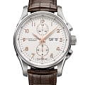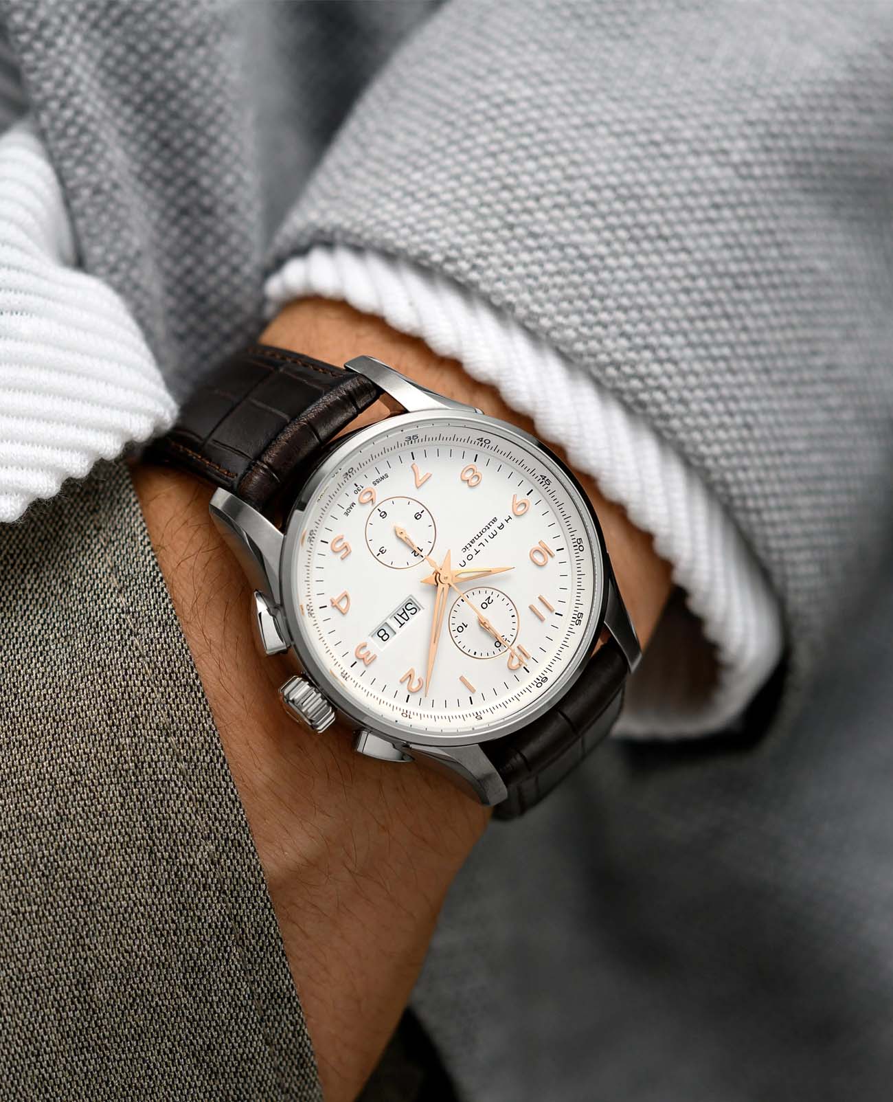 Мужские наручные часы-хронографХронографФункция позволяет измерять отрезки времени с особой точностью: часы, минуты, секунды. Верным признаком хронографа является наличие на циферблате 3 дополнительных окошек-счётчиков. Hamilton Jazzmaster Maestro Auto Chrono H32766513 с автоматическим механизмом. Корпус выполнен из нержавеющей стали. Сапфировое стеклоСапфировое стеклоПрочный и надёжный материал из кристалла сапфира синтетического происхождения, характеризующийся особой твёрдостью и устойчивостью к царапинам и повреждениям. устойчивое к мелким механическим повреждениям. Кожаный ремешок на стандартной застёжке. Стрелки и метки с люминесцентным покрытиемЛюминесцентное покрытиеПозволяет считывать показания времени в темноте. Производители наносят на стрелки, часовые индексы, безель или поверхность циферблата светонакопительный состав, дающий холодное свечение.. Окошки дня недели и даты находятся в положении 3 часа. Класс водозащиты: 100 метров, позволит плавать, нырять и заниматься другими водными видами спорта.