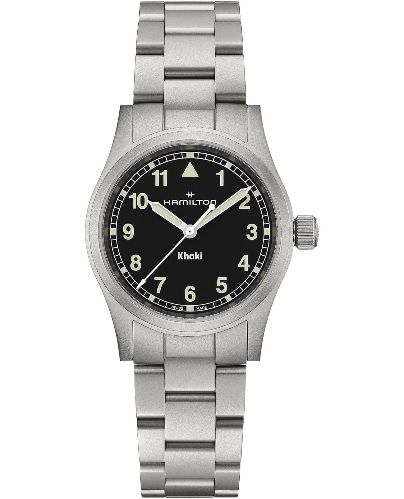 Hamilton Khaki Field Quartz 33mm H69301130 — компактные и универсальные часы в классическом военном стиле, с акцентом на надёжность и практичность. Изысканный корпус диаметром 33 мм выполнен из нержавеющей стали, лёгкий, удобный и идеально подходит для запястий любого размера. Циферблат защищён сапфировым стекломСапфировое стеклоПрочный и надёжный материал из кристалла сапфира синтетического происхождения, характеризующийся особой твёрдостью и устойчивостью к царапинам и повреждениям., устойчивым к царапинам и бликам. Циферблат оформлен в классическом армейском стиле: крупные арабские цифры, стрелки и метки с люминесцентным покрытиемЛюминесцентное покрытиеПозволяет считывать показания времени в темноте. Производители наносят на стрелки, часовые индексы, безель или поверхность циферблата светонакопительный состав, дающий холодное свечение. Super-LumiNova®, обеспечивающим превосходную видимость в темноте. Внутри установлен швейцарский кварцевый калибр ETA F05.105mh2. Модель укомплектована браслетом из нержавеющей стали с раскладной застёжкойРаскладная застёжкаТакой тип застёжки используется только на браслетах из металла. Она никогда не раскрывается полностью, происходит разделение на 2 и более частей. Раскладывающая застёжка снизит вероятность потери часов к минимуму., обеспечивающей надёжную посадку. Водонепроницаемость 50 метров делает часы устойчивыми к брызгам и дождю, идеально подходящими для повседневного ношения. Khaki Field Quartz 33 мм — надёжный выбор для тех, кто ценит простоту, точность и долговечность.