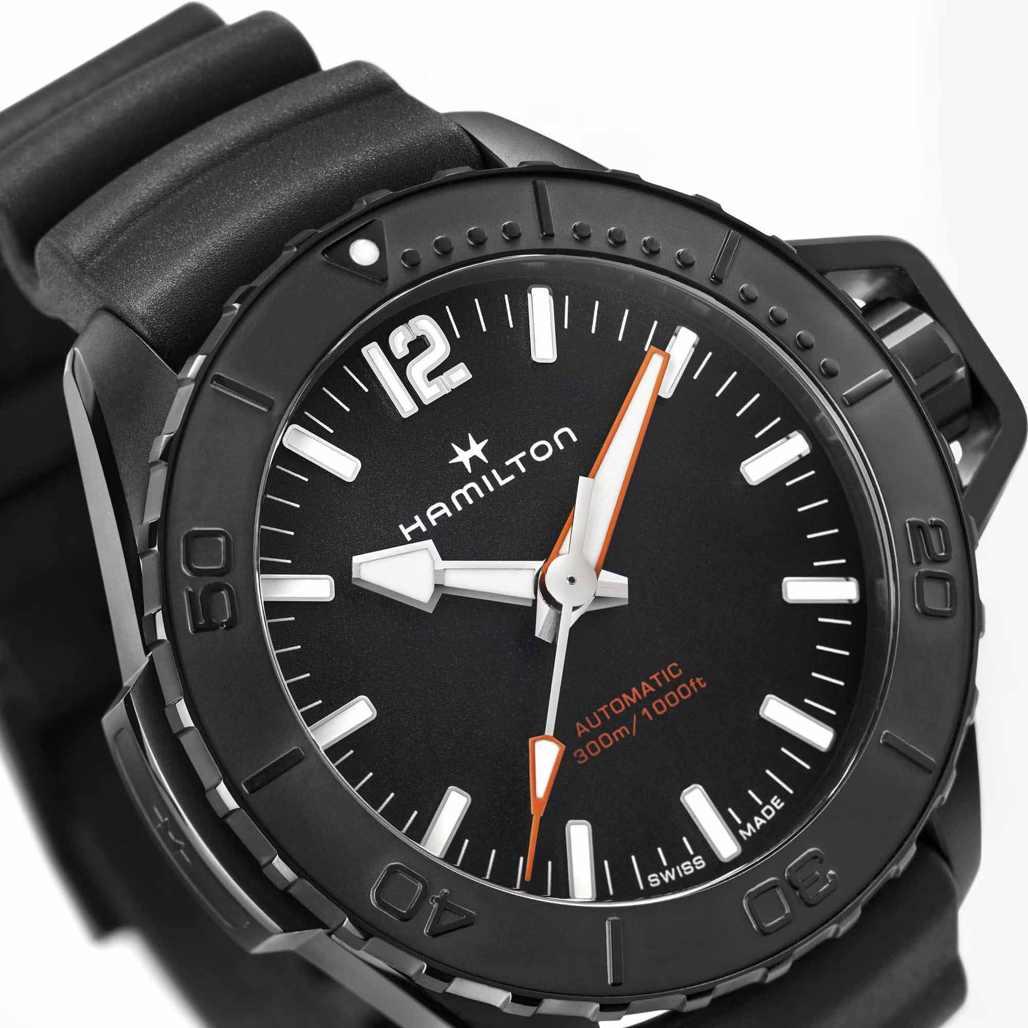 Мужские часы Hamilton Khaki Navy Frogman Automatic — это технически совершенная модель, разработанная для экстремальных условий и выполненная в стиле, вдохновлённом морскими приключениями. Корпус диаметром 46 мм , изготовленный из нержавеющей стали с чёрным PVD-покрытием PVD-покрытиемPVDУльтратонкое покрытие наносится в технике вакуумного напыления, сочетает в себе нитрид титана особой прочности со слоем золота или оксида хрома. Несёт в себе декоративную или защитную функцию., отличается прочностью и устойчивостью к внешним воздействиям. Циферблат чёрного цвета оснащён стрелками и метками с покрытием Super-LumiNova люминесцентным покрытиемЛюминесцентное покрытиеПозволяет считывать показания времени в темноте. Производители наносят на стрелки, часовые индексы, безель или поверхность циферблата светонакопительный состав, дающий холодное свечение. для лучшей читаемости в темноте, а также функцией указания времени в двух часовых поясах второй часовой поясВторой часовой поясФункция, позволяющая отображать время двух часовых поясов одновременно.. Механизм с автоподзаводом обеспечивает запас хода до 80 часов Powermatic 80Powermatic 80Эксклюзивный калибр от швейцарской компании ETA с увеличенным запасом хода до 80 часов за счёт удлинённой заводной пружины. Характеризуется улучшенной системой спуска со сниженным трением.. Защиту циферблата обеспечивает сапфировое стекло сапфировое стеклоСапфировое стеклоПрочный и надёжный материал из кристалла сапфира синтетического происхождения, характеризующийся особой твёрдостью и устойчивостью к царапинам и повреждениям. с антибликовым покрытием антибликовым покрытиемАнтибликовое покрытиеСлой оксида металла в 0,13-0,3 микрон, благодаря которому стекло часов не бликует и не отражает свет. Антибликовое покрытие уменьшает отражение света в 10 раз, обеспечивая отличную читаемость показателей циферблата., а водозащита 30 бар (300WR) позволяет использовать часы даже на значительной глубине. Ремешок tactical rubber с волновым рисунком подчёркивает спортивный стиль и обеспечивает комфорт при ношении. Завинчивающаяся заводная головка раскладной застёжкойРаскладная застёжкаТакой тип застёжки используется только на браслетах из металла. Она никогда не раскрывается полностью, происходит разделение на 2 и более частей. Раскладывающая застёжка снизит вероятность потери часов к минимуму. с уникальным защитным элементом гарантирует надёжное закрытие, а механизм оснащён технологией Nivachron™ Nivachron™Nivachron™Специально разработанный инновационный сплав Nivachron™ повышает устойчивость часов к воздействию магнитных полей., повышающей устойчивость к магнитным полям и обеспечивает точность хода. Это сочетание максимальной прочности, функциональности и дайверского стиля для тех, кто стремится к новым открытиям.