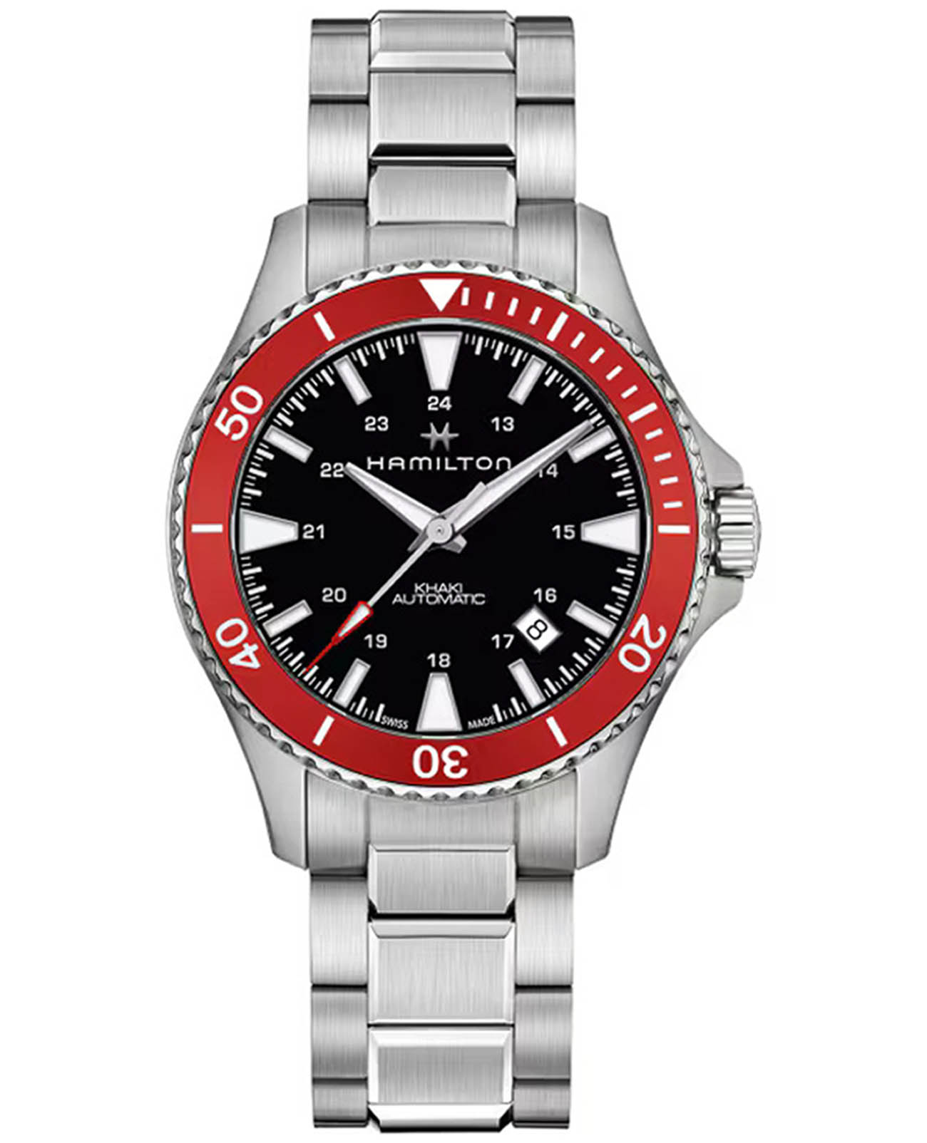Часы Hamilton Khaki Navy Scuba Automatic (H82405130) сочетают функциональность дайверских часов с ярким дизайном, заключены в 40-мм корпус из нержавеющей стали с красным алюминиевым безелемБезельВнешний ободок, закрепляющий стекло. В спортивных часах так называется поворотное кольцо с делениями на циферблате, выполняет роль таймера – замеряет отрезки времени на шкале. Неподвижный безель – элемент декора. Однонаправленно вращающийся безель на дайверских часах позволяет фиксировать моменты погружения и выныривания на поверхность., вдохновлённого морской тематикой. Модель оснащена автоматическим калибром H-10 с увеличенным запасом хода 80 часов и спиралью баланса Nivachron™Nivachron™Специально разработанный инновационный сплав Nivachron™ повышает устойчивость часов к воздействию магнитных полей., обеспечивающей устойчивость к магнитным полям и температурным перепадам. Чёрный циферблат с люминесцентными метками Super-LumiNova гарантирует чёткую видимость в темноте, а сапфировое стеклоСапфировое стеклоПрочный и надёжный материал из кристалла сапфира синтетического происхождения, характеризующийся особой твёрдостью и устойчивостью к царапинам и повреждениям. с антибликовым покрытиемАнтибликовое покрытиеСлой оксида металла в 0,13-0,3 микрон, благодаря которому стекло часов не бликует и не отражает свет. Антибликовое покрытие уменьшает отражение света в 10 раз, обеспечивая отличную читаемость показателей циферблата. защищает от царапин. Водонепроницаемость до 100 метров (10 бар) делает часы надёжным спутником для плавания. Комплектуется стальным браслетом шириной 20 мм с раскладной застёжкойРаскладная застёжкаТакой тип застёжки используется только на браслетах из металла. Она никогда не раскрывается полностью, происходит разделение на 2 и более частей. Раскладывающая застёжка снизит вероятность потери часов к минимуму., сочетающим комфорт и долговечность.
