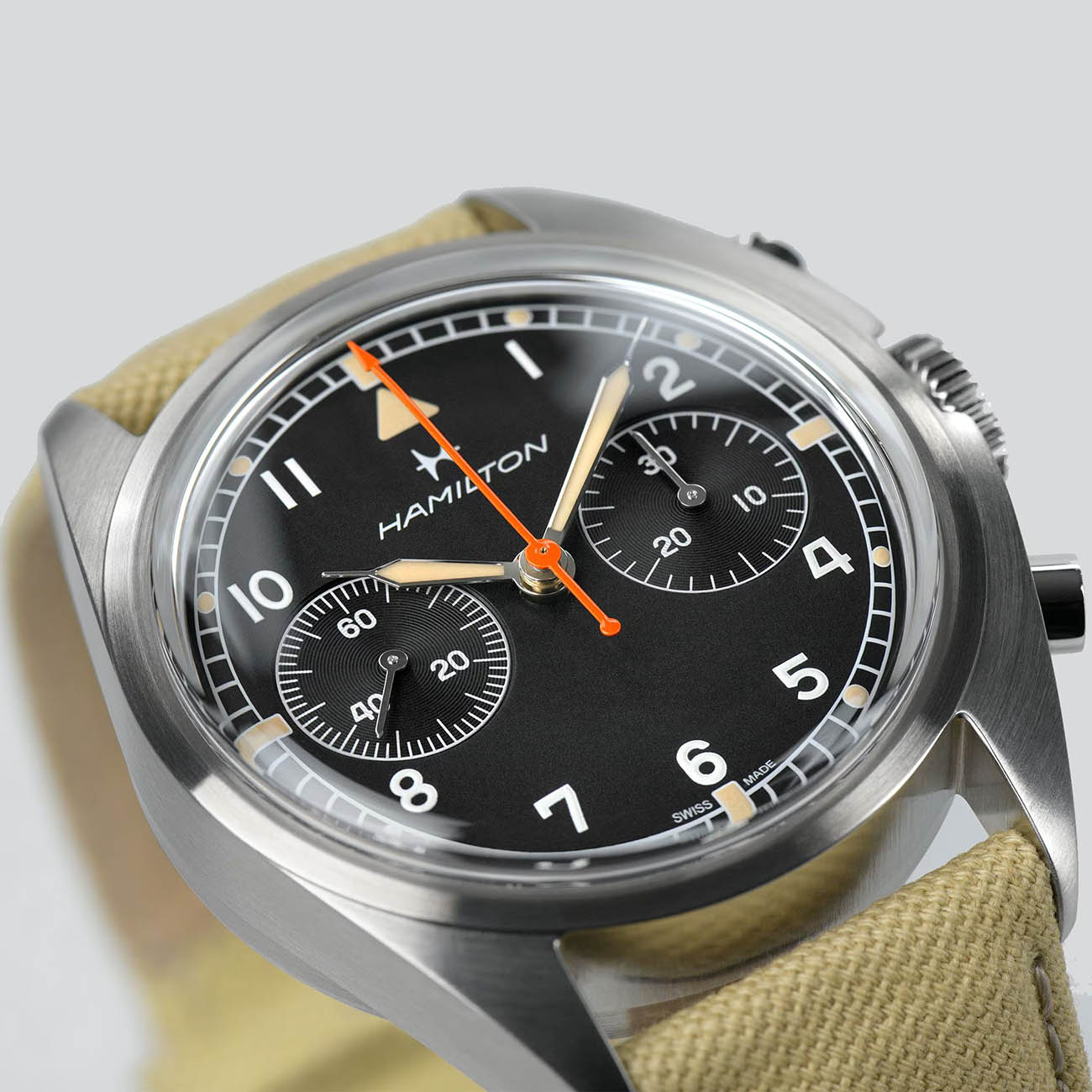 Мужские швейцарские часы Hamilton Khaki Pilot Pioneer Mechanical Chronograph Limited Edition H89429930 — лимитированный выпуск, созданный в коллаборации с Hodinkee как дань уважения хронографам британских ВВС 1970-х годов. Стальной корпус диаметром 40 мм с асимметричным дизайном и увеличенной толщиной 14,35 мм подчеркивает брутальность модели, а сапфировое стеклоСапфировое стеклоПрочный и надёжный материал из кристалла сапфира синтетического происхождения, характеризующийся особой твёрдостью и устойчивостью к царапинам и повреждениям. с двойным антибликовым покрытием обеспечивает превосходную читаемость матового черного циферблата со стрелками с люминесцентным покрытиемЛюминесцентное покрытиеПозволяет считывать показания времени в темноте. Производители наносят на стрелки, часовые индексы, безель или поверхность циферблата светонакопительный состав, дающий холодное свечение.. Модель оснащена функцией хронографаХронографФункция позволяет измерять отрезки времени с особой точностью: часы, минуты, секунды. Верным признаком хронографа является наличие на циферблате 3 дополнительных окошек-счётчиков.. Оранжевая центральная хронографная стрелка сохраняют историческую точность, отсылая к инструментам пилотов самолетов. Механизм с ручным заводом H-51-Si на базе Valjoux 7733 оснащен кремниевой спиралью, обеспечивающей запас хода 60 часов и устойчивость к магнитным полям . Ударопрочный корпусУдаропрочный корпусМеханизм заключён в корпус, выполненный из современных материалов, устойчивых к ударам, механическим повреждениям и падению с высоты: инновационный пластик, карбон, нержавеющая сталь, титан. с водонепроницаемостью 10 бар (100 м) сочетается с бежевым нейлоновым ремешком шириной 22 мм.