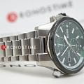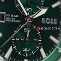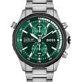 Мужские часы Hugo Boss Globetrotter HB 1513930 представлены в круглом 46-мм корпусе из нержавеющей стали с IP-покрытиемIP-покрытиеМетод ионного напыления. Демонстрирует повышенную устойчивость к истиранию, окислению и химическим веществам. Под воздействием высокого давления и температуры около 1500°C молекулы металла надёжно соединяются с частицами корпуса часов.. Оснащены кварцевым механизмом с функциями хронографаХронографФункция позволяет измерять отрезки времени с особой точностью: часы, минуты, секунды. Верным признаком хронографа является наличие на циферблате 3 дополнительных окошек-счётчиков. и секундомеромСекундомерСекундоме́р — прибор, способный измерять интервалы времени с точностью до долей секунды.. Зеленый циферблат защищен устойчивым к царапинам минеральным стекломМинеральное стеклоМинеральное стекло представляет собой искусственно выращенный минерал кварца. Такое стекло отличается особой устойчивостью к повреждениям и царапинам. Уступает по некоторым качествам сапфировому стеклу.. Стальной браслет серебристого цвета дополнен раскладной застёжкойРаскладная застёжкаТакой тип застёжки используется только на браслетах из металла. Она никогда не раскрывается полностью, происходит разделение на 2 и более частей. Раскладывающая застёжка снизит вероятность потери часов к минимуму., а стрелки покрыты люминесцентным составомЛюминесцентное покрытиеПозволяет считывать показания времени в темноте. Производители наносят на стрелки, часовые индексы, безель или поверхность циферблата светонакопительный состав, дающий холодное свечение. для видимости в темноте. Водонепроницаемость 100 метров (10 ATM) позволяет использовать часы для плавания.