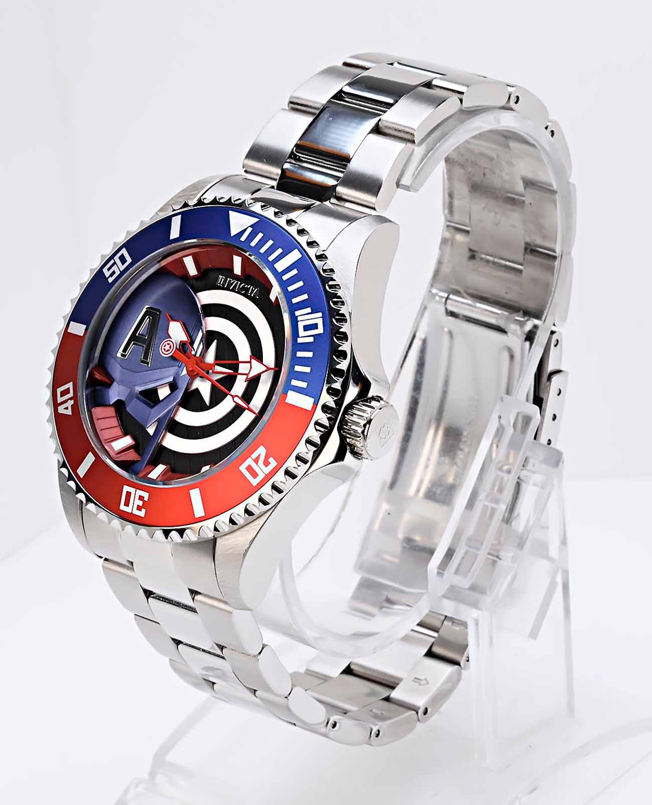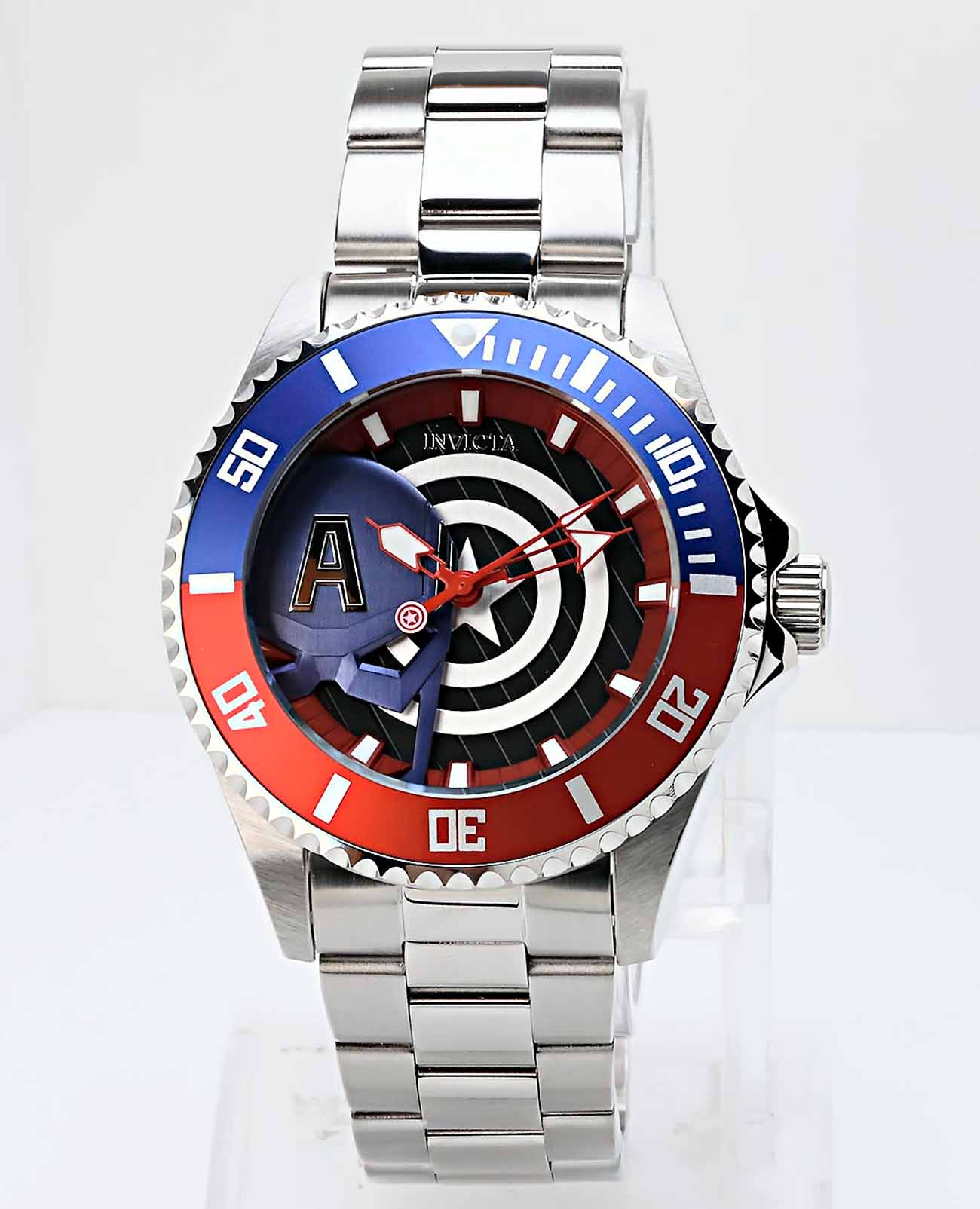 Мужские наручные часы Invicta IN29680 из коллекции Marvel Captain America сочетают в себе динамичный дизайн и надежность современных технологий . БезельБезельВнешний ободок, закрепляющий стекло. В спортивных часах так называется поворотное кольцо с делениями на циферблате, выполняет роль таймера – замеряет отрезки времени на шкале. Неподвижный безель – элемент декора. Однонаправленно вращающийся безель на дайверских часах позволяет фиксировать моменты погружения и выныривания на поверхность. с IP-покрытиемIP-покрытиеМетод ионного напыления. Демонстрирует повышенную устойчивость к истиранию, окислению и химическим веществам. Под воздействием высокого давления и температуры около 1500°C молекулы металла надёжно соединяются с частицами корпуса часов., что обеспечивает высокую устойчивость к внешним воздействиям . Браслет выполнен из нержавеющей стали оснащен раскладной застежкойРаскладная застёжкаТакой тип застёжки используется только на браслетах из металла. Она никогда не раскрывается полностью, происходит разделение на 2 и более частей. Раскладывающая застёжка снизит вероятность потери часов к минимуму., гарантирующей комфортное ношение и безопасность . Циферблат представлен в белом, синем и черном цветах, дополнен люминесцентными метками Tritnite, которые обеспечивают отличную видимость в темноте . Для защиты используется минеральное стеклоМинеральное стеклоМинеральное стекло представляет собой искусственно выращенный минерал кварца. Такое стекло отличается особой устойчивостью к повреждениям и царапинам. Уступает по некоторым качествам сапфировому стеклу., обеспечивающее прочную защиту от царапин . Часы работают на кварцевом механизме Seiko Hattori PC21J, что гарантирует точное время без необходимости подзаводки . Водонепроницаемость модели достигает 10 атмосфер (100 метров), что позволяет использовать их во время плавания и других водных видов спорта .