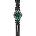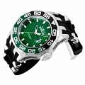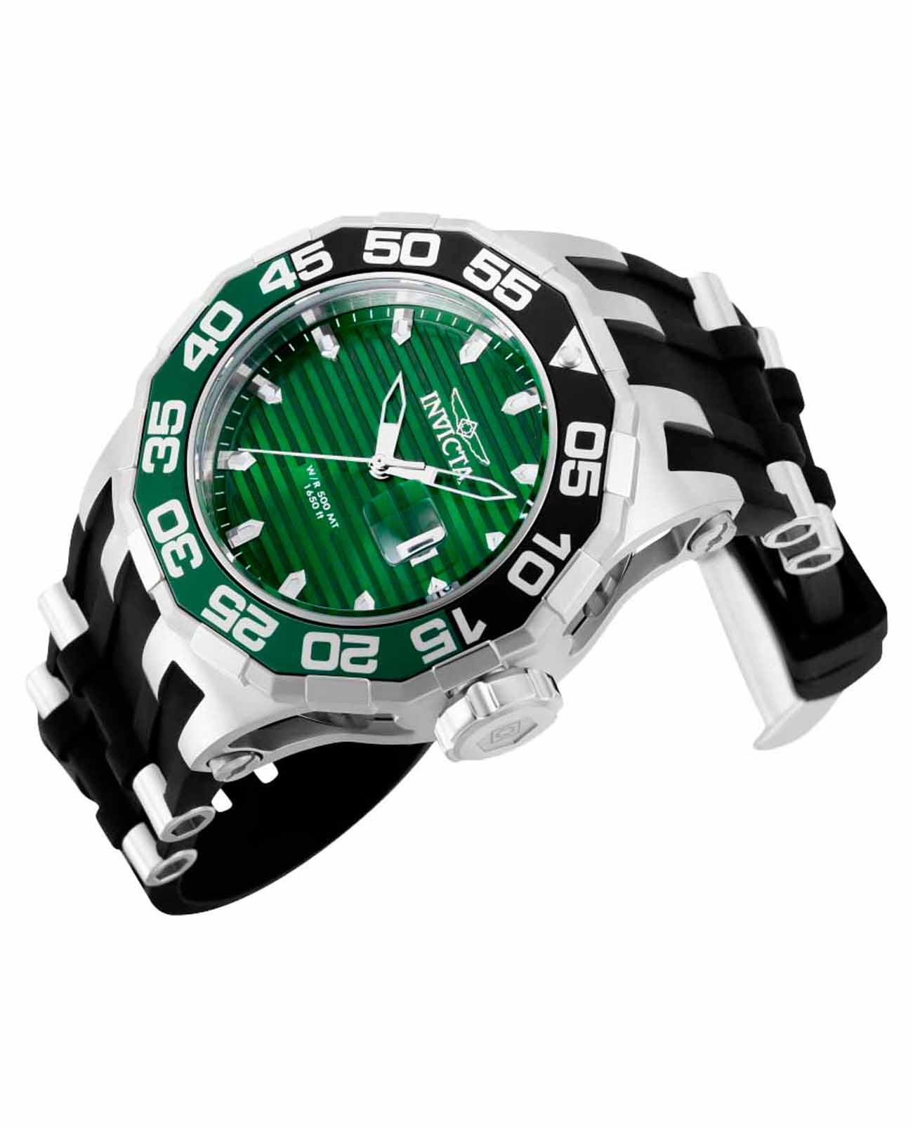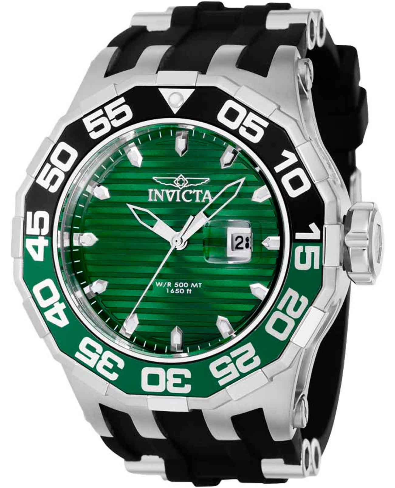 Мужские наручные часы Invicta Specialty IN38694 сочетают в себе спортивный дизайн и высокую функциональность, что делает их отличным выбором для активных мужчин . Модель обладает круглым корпусом, выполненным из нержавеющей стали и алюминиевой вставкой, что обеспечивает устойчивость к внешним воздействиям и стильный внешний вид . БезельБезельВнешний ободок, закрепляющий стекло. В спортивных часах так называется поворотное кольцо с делениями на циферблате, выполняет роль таймера – замеряет отрезки времени на шкале. Неподвижный безель – элемент декора. Однонаправленно вращающийся безель на дайверских часах позволяет фиксировать моменты погружения и выныривания на поверхность. с IP-покрытиемIP-покрытиеМетод ионного напыления. Демонстрирует повышенную устойчивость к истиранию, окислению и химическим веществам. Под воздействием высокого давления и температуры около 1500°C молекулы металла надёжно соединяются с частицами корпуса часов.. Циферблат зеленого цвета дополнен метками в виде штрихов и светящимися стрелками с люминесцентным покрытиемЛюминесцентное покрытиеПозволяет считывать показания времени в темноте. Производители наносят на стрелки, часовые индексы, безель или поверхность циферблата светонакопительный состав, дающий холодное свечение. Tritnite, гарантирующими отличную видимость даже в темное время суток .  Ремешок часов выполнен из силикона черного цвета со стальными вставками, который обеспечивает комфорт при длительной носке. Фиксация осуществляется с помощью классической застежки . Для защиты циферблата используется минеральное стеклоМинеральное стеклоМинеральное стекло представляет собой искусственно выращенный минерал кварца. Такое стекло отличается особой устойчивостью к повреждениям и царапинам. Уступает по некоторым качествам сапфировому стеклу., оснащенное антибликовым покрытием, что делает его устойчивым к царапинам и бликам . Часы оснащены кварцевым механизмом, обеспечивающим высокую точность хода без необходимости подзаводки. Водонепроницаемость модели достигает 500 метров (50 атмосфер), что позволяет использовать их во время плавания, дайвинга и других водных видов спорта . Корпус часов также оборудован винтовой коронкой для дополнительной защиты механизма от попадания воды . Сочетание практичности, надежности и стильного дизайна делает эту модель универсальным аксессуаром как для повседневной носки, так и для занятий спортом.