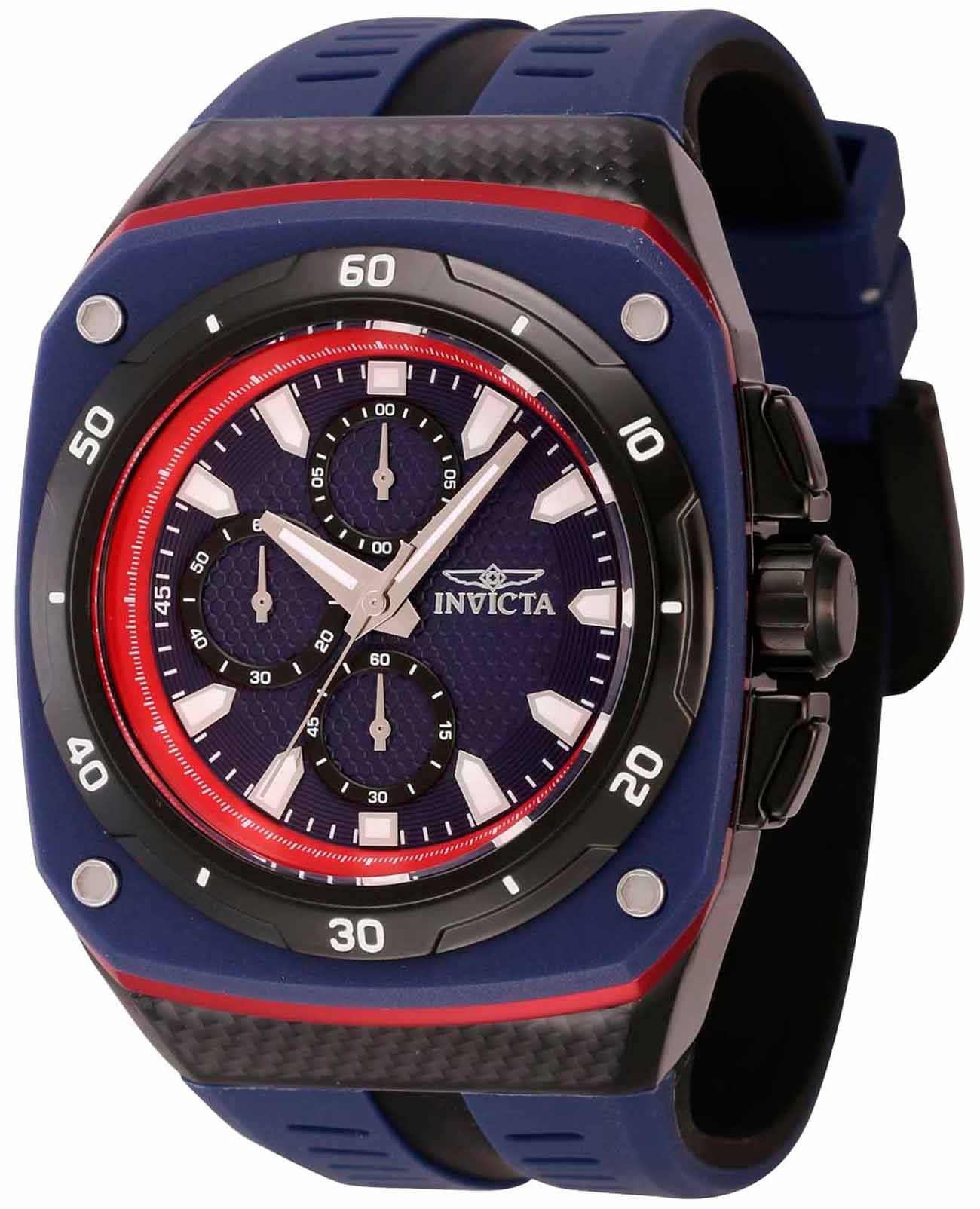Мужские наручные часы-хронографХронографФункция позволяет измерять отрезки времени с особой точностью: часы, минуты, секунды. Верным признаком хронографа является наличие на циферблате 3 дополнительных окошек-счётчиков. Invicta IN46108 из коллекции Speedway сочетают в себе спортивный дизайн и надежность современных технологий. Модель обладает круглым корпусом диаметром 46 мм, изготовленным из стали с IP-покрытиемIP-покрытиеМетод ионного напыления. Демонстрирует повышенную устойчивость к истиранию, окислению и химическим веществам. Под воздействием высокого давления и температуры около 1500°C молекулы металла надёжно соединяются с частицами корпуса часов., что обеспечивает привлекательный внешний вид и устойчивость к коррозии . Ремешок выполнен из силикона шириной 3 см, гарантируя комфортное ношение . Циферблат с метками в виде штрихов оснащен люминесцентным покрытиемЛюминесцентное покрытиеПозволяет считывать показания времени в темноте. Производители наносят на стрелки, часовые индексы, безель или поверхность циферблата светонакопительный состав, дающий холодное свечение., что обеспечивает хорошую видимость в темноте . Для защиты используется минеральное стеклоМинеральное стеклоМинеральное стекло представляет собой искусственно выращенный минерал кварца. Такое стекло отличается особой устойчивостью к повреждениям и царапинам. Уступает по некоторым качествам сапфировому стеклу., обеспечивающее прочную защиту от царапин . Часы работают на кварцевом механизме, что гарантирует точное время без необходимости подзаводки. Модель также является хронографомХронографФункция позволяет измерять отрезки времени с особой точностью: часы, минуты, секунды. Верным признаком хронографа является наличие на циферблате 3 дополнительных окошек-счётчиков., оснащенным функцией секундомераСекундомерСекундоме́р — прибор, способный измерять интервалы времени с точностью до долей секунды., делая ее идеальной для активного образа жизни . Водонепроницаемость часов достигает 50 метров (5 атмосфер), что позволяет использовать их во время мытья рук или дождя, однако не рекомендуется для плавания или дайвинга .
