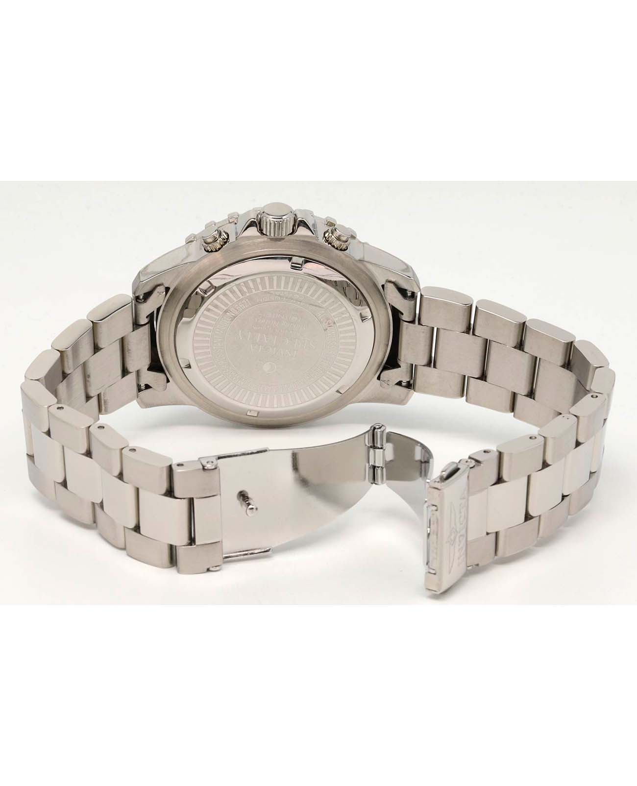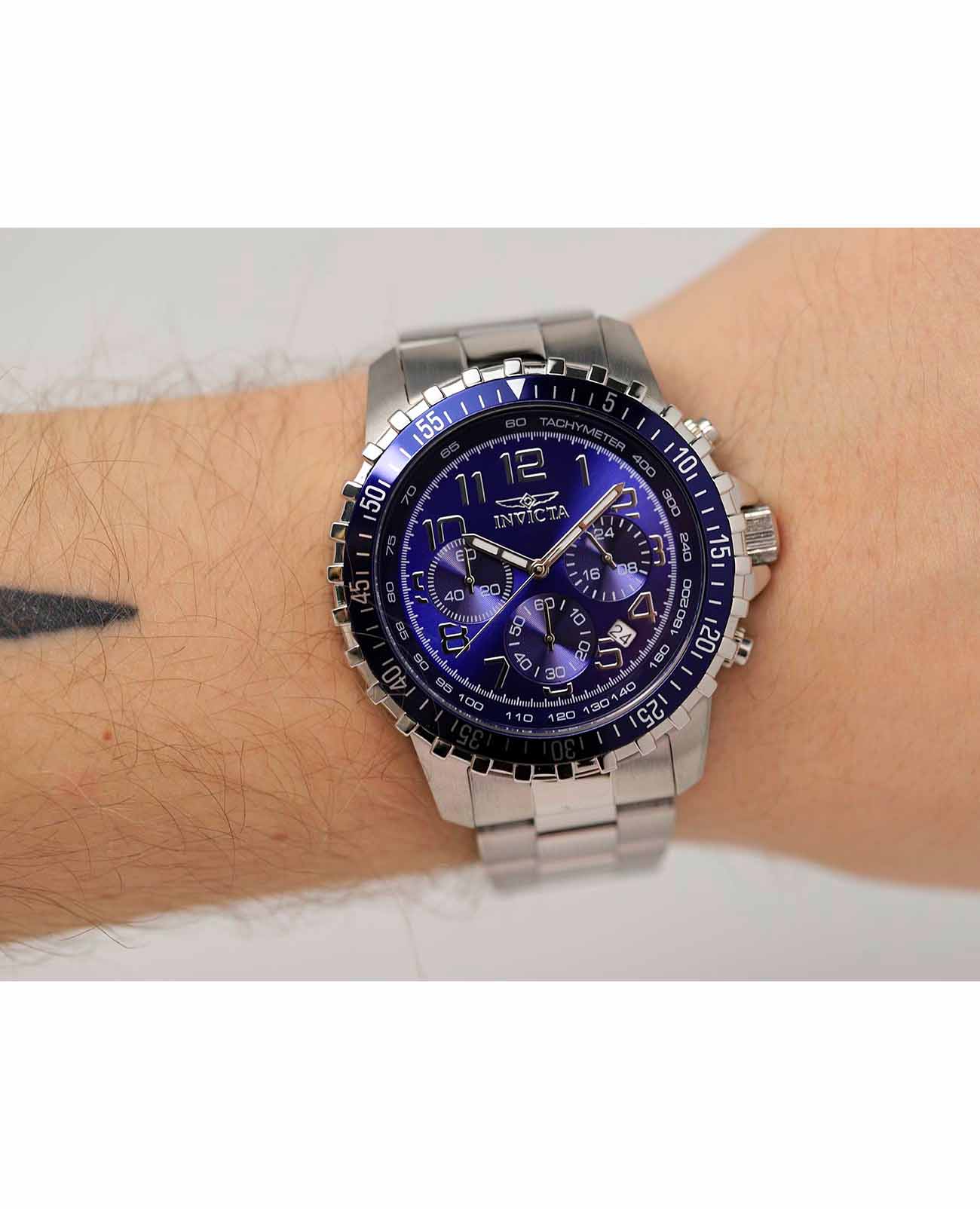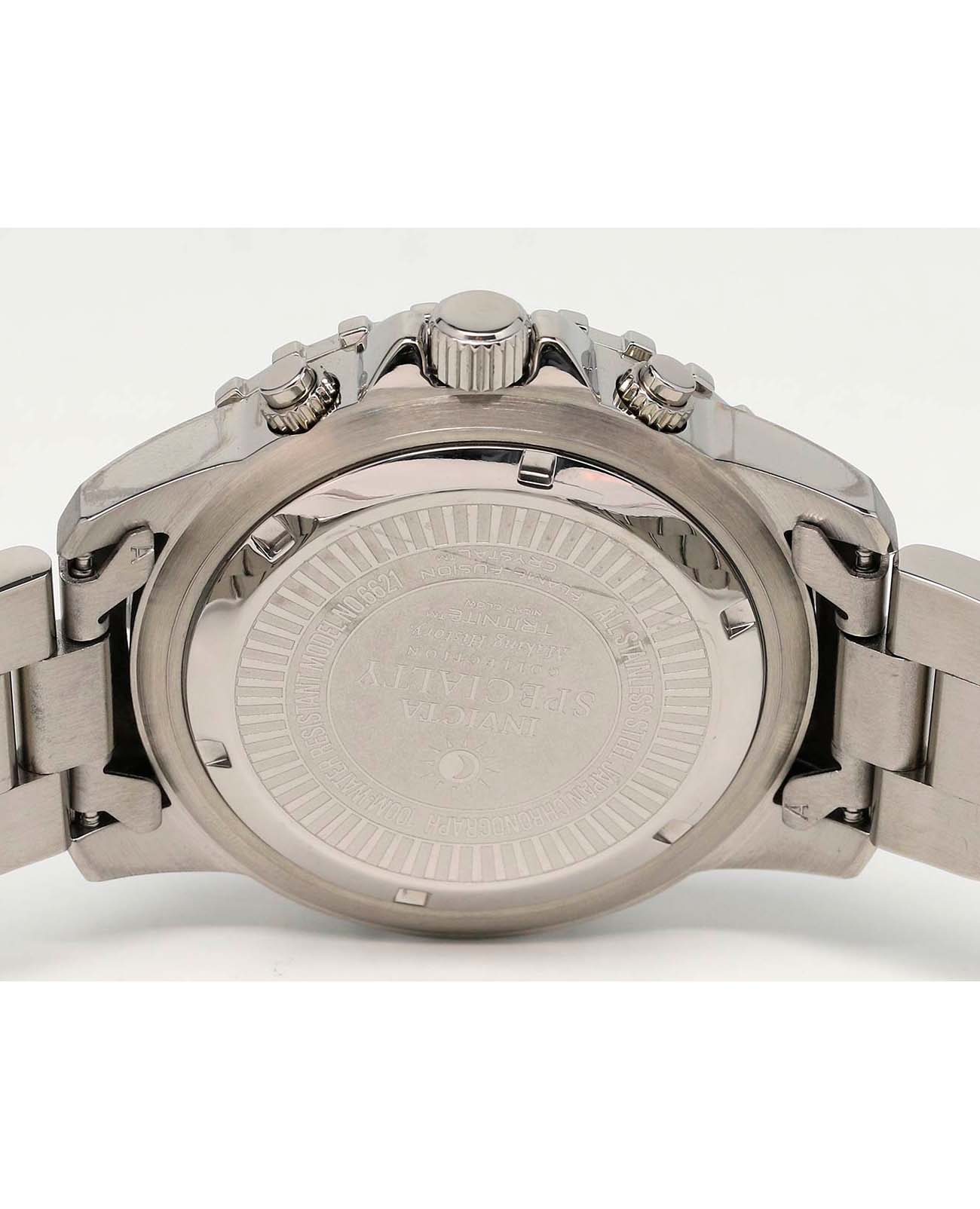 Мужские наручные часы-хронографХронографФункция позволяет измерять отрезки времени с особой точностью: часы, минуты, секунды. Верным признаком хронографа является наличие на циферблате 3 дополнительных окошек-счётчиков. Invicta Specialty IN6621 из коллекции Specialty сочетают в себе спортивный дизайн и надежность современных технологий . Модель обладает круглым корпусом диаметром 45 мм, изготовленным из нержавеющей стали, что обеспечивает высокую устойчивость к внешним воздействиям . БезельБезельВнешний ободок, закрепляющий стекло. В спортивных часах так называется поворотное кольцо с делениями на циферблате, выполняет роль таймера – замеряет отрезки времени на шкале. Неподвижный безель – элемент декора. Однонаправленно вращающийся безель на дайверских часах позволяет фиксировать моменты погружения и выныривания на поверхность. с IP-покрытиемIP-покрытиеМетод ионного напыления. Демонстрирует повышенную устойчивость к истиранию, окислению и химическим веществам. Под воздействием высокого давления и температуры около 1500°C молекулы металла надёжно соединяются с частицами корпуса часов. выполнен с рифленой отделкой, придающей часам дополнительную элегантность . Браслет также выполнен из нержавеющей стали с раскладывающейся застежкойРаскладная застёжкаТакой тип застёжки используется только на браслетах из металла. Она никогда не раскрывается полностью, происходит разделение на 2 и более частей. Раскладывающая застёжка снизит вероятность потери часов к минимуму., гарантирующей комфортное ношение и безопасность . Синий циферблат дополнен метками в виде штрихов и светящимися стрелками с люминесцентным покрытиемЛюминесцентное покрытиеПозволяет считывать показания времени в темноте. Производители наносят на стрелки, часовые индексы, безель или поверхность циферблата светонакопительный состав, дающий холодное свечение., которые обеспечивают отличную видимость даже в темное время суток . Для защиты используется минеральное стеклоМинеральное стеклоМинеральное стекло представляет собой искусственно выращенный минерал кварца. Такое стекло отличается особой устойчивостью к повреждениям и царапинам. Уступает по некоторым качествам сапфировому стеклу., оснащенное антибликовым покрытием, что делает его устойчивым к царапинам и бликам . Часы оснащены кварцевым механизмом, что гарантирует точность хода без необходимости подзаводки .  Модель также является хронографомХронографФункция позволяет измерять отрезки времени с особой точностью: часы, минуты, секунды. Верным признаком хронографа является наличие на циферблате 3 дополнительных окошек-счётчиков., оснащенным функцией секундомераСекундомерСекундоме́р — прибор, способный измерять интервалы времени с точностью до долей секунды., делая ее идеальной для активного образа жизни . Водонепроницаемость часов достигает 100 метров (10 атмосфер), что позволяет использовать их во время плавания и других водных видов спорта, однако не рекомендуется для глубоководного дайвинга . Сочетание практичности, надежности и стильного дизайна делает эту модель универсальным аксессуаром как для повседневной носки, так и для занятий спортом.