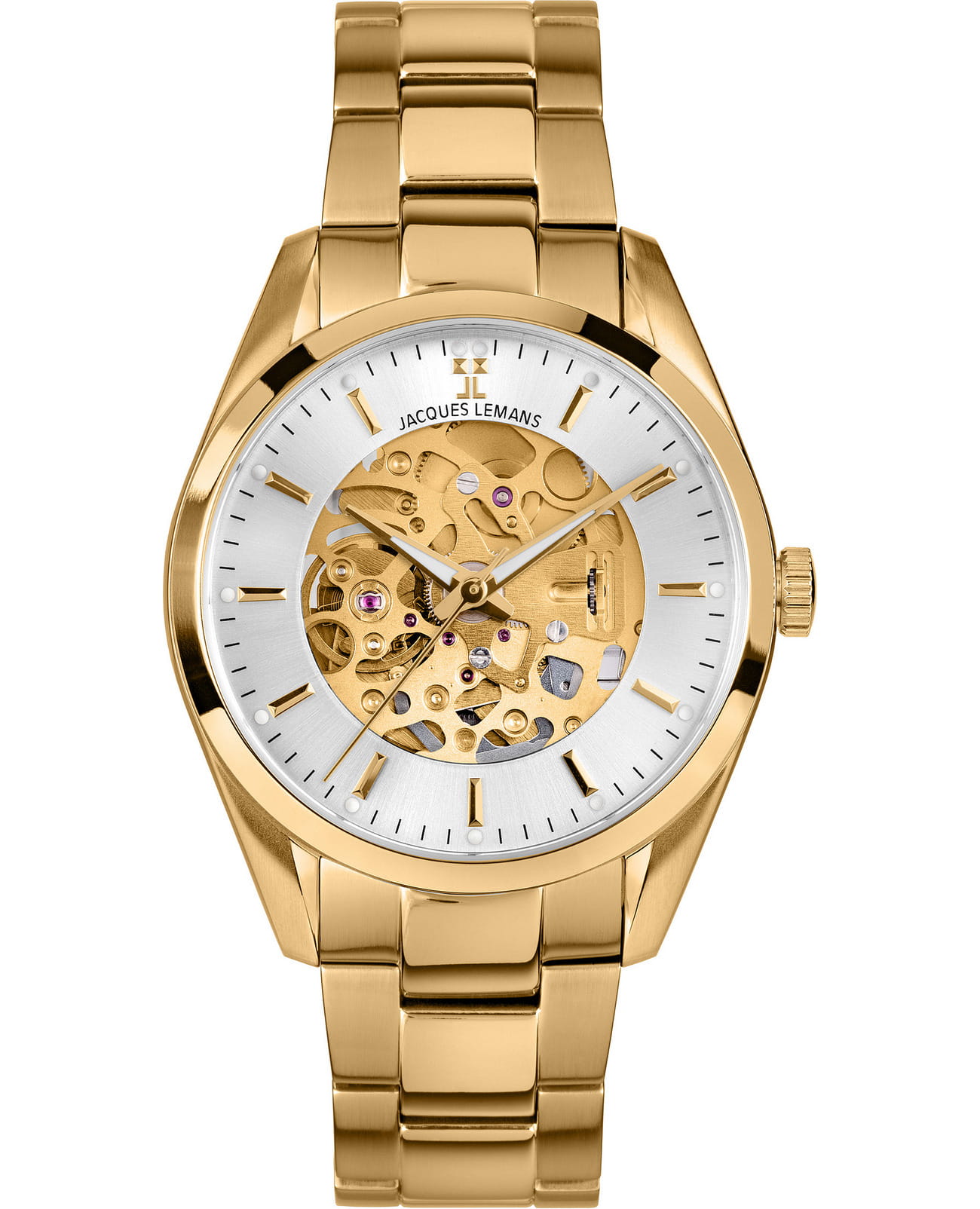 Мужские австрийские часы Jacques Lemans Automatic 1-2087J, механический механизм (автоматический калибр) с высокой точностью. Класс водозащиты: 50 метров, позволит защитить корпус от случайных брызг или капель дождя. Корпус часов изготовлен из стали, золотистого цвета.