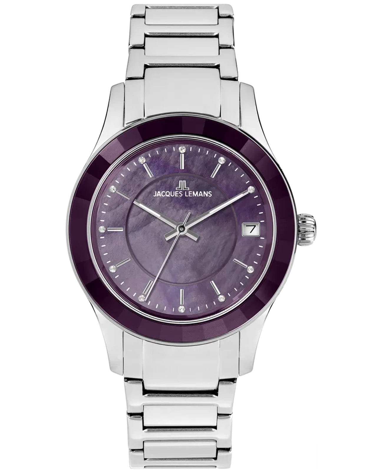 Австрийские женские часы Jacques Lemans 1-2194E имеют кварцевый механизм с высокой точностью. Минеральное стеклоМинеральное стеклоМинеральное стекло представляет собой искусственно выращенный минерал кварца. Такое стекло отличается особой устойчивостью к повреждениям и царапинам. Уступает по некоторым качествам сапфировому стеклу., устойчивое к появлению царапин, обладает высокой прозрачностью. Корпус часов изготовлен из нержавеющей стали. Стрелки с люминесцентным покрытиемЛюминесцентное покрытиеПозволяет считывать показания времени в темноте. Производители наносят на стрелки, часовые индексы, безель или поверхность циферблата светонакопительный состав, дающий холодное свечение.. Класс водозащиты: 50 метров, позволит принимать душ или плавать, не снимая часов. Стальной браслет на раскладной застёжкеРаскладная застёжкаТакой тип застёжки используется только на браслетах из металла. Она никогда не раскрывается полностью, происходит разделение на 2 и более частей. Раскладывающая застёжка снизит вероятность потери часов к минимуму.. БезельБезельВнешний ободок, закрепляющий стекло. В спортивных часах так называется поворотное кольцо с делениями на циферблате, выполняет роль таймера – замеряет отрезки времени на шкале. Неподвижный безель – элемент декора. Однонаправленно вращающийся безель на дайверских часах позволяет фиксировать моменты погружения и выныривания на поверхность. с IP-покрытиемIP-покрытиеМетод ионного напыления. Демонстрирует повышенную устойчивость к истиранию, окислению и химическим веществам. Под воздействием высокого давления и температуры около 1500°C молекулы металла надёжно соединяются с частицами корпуса часов..