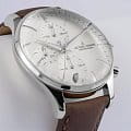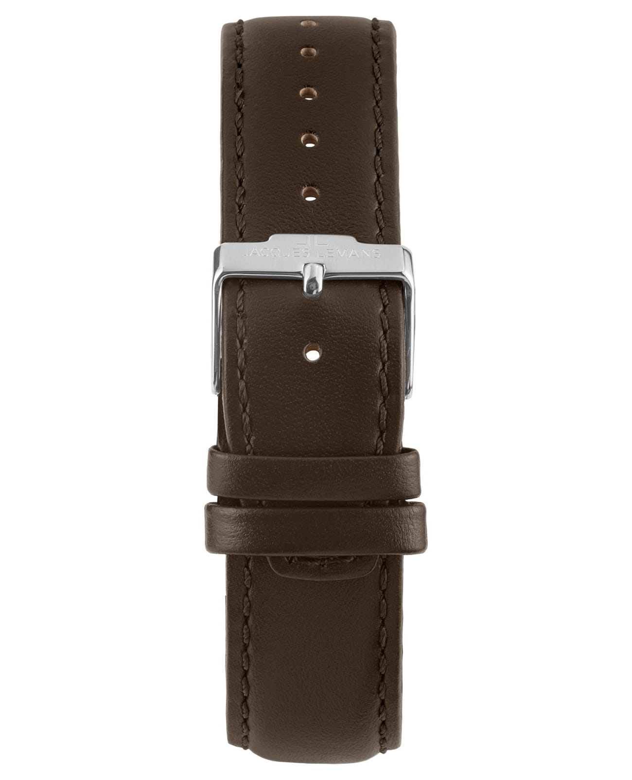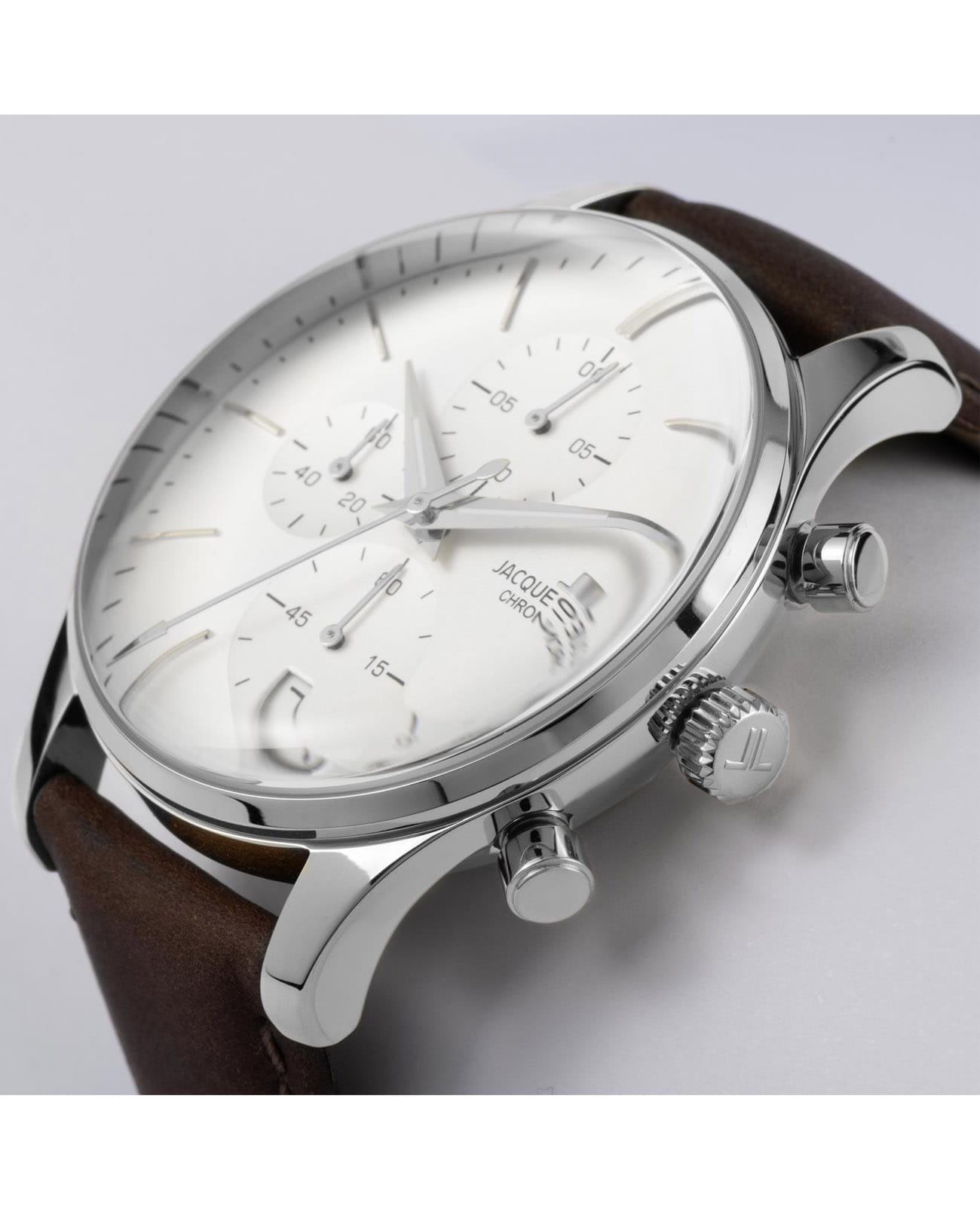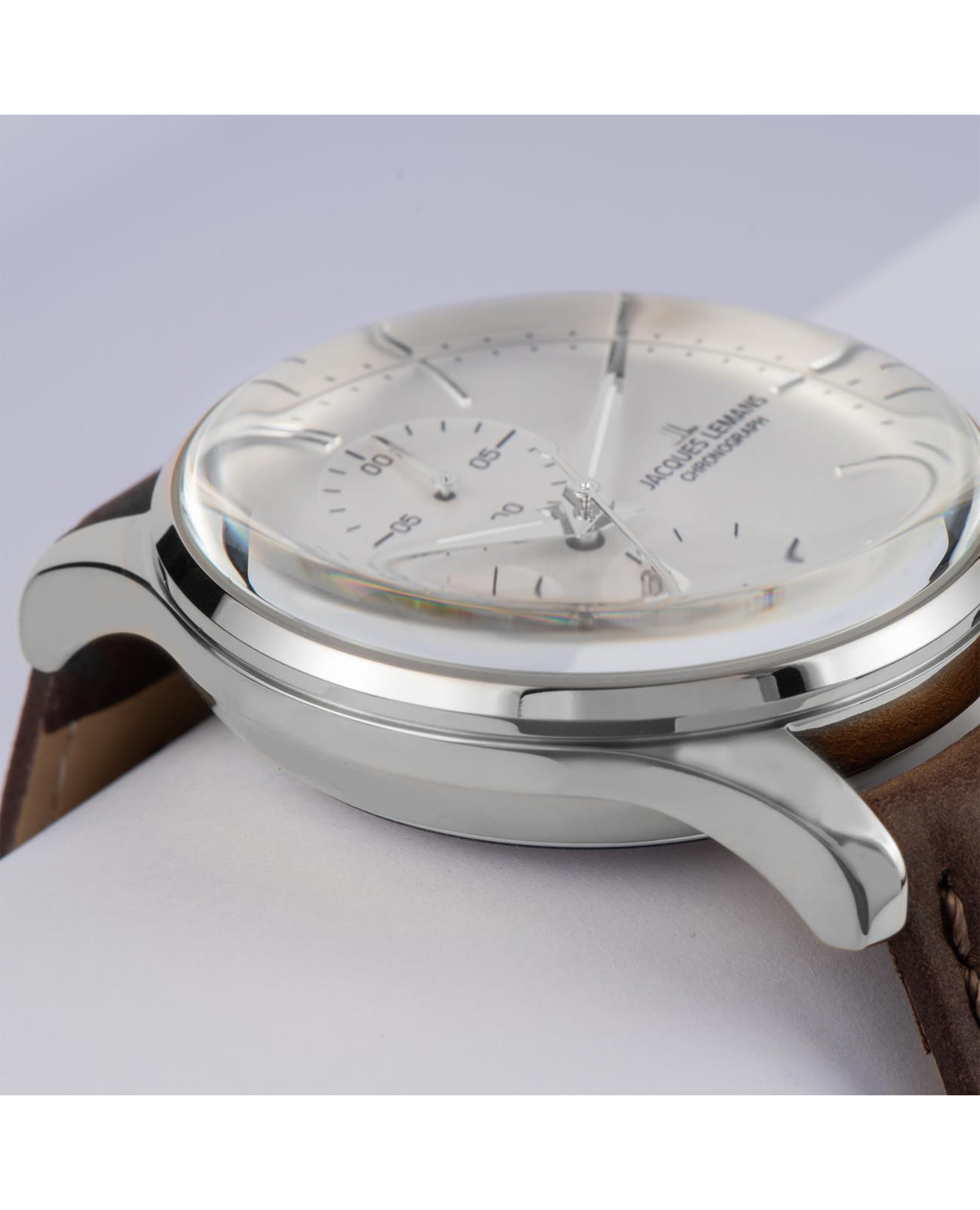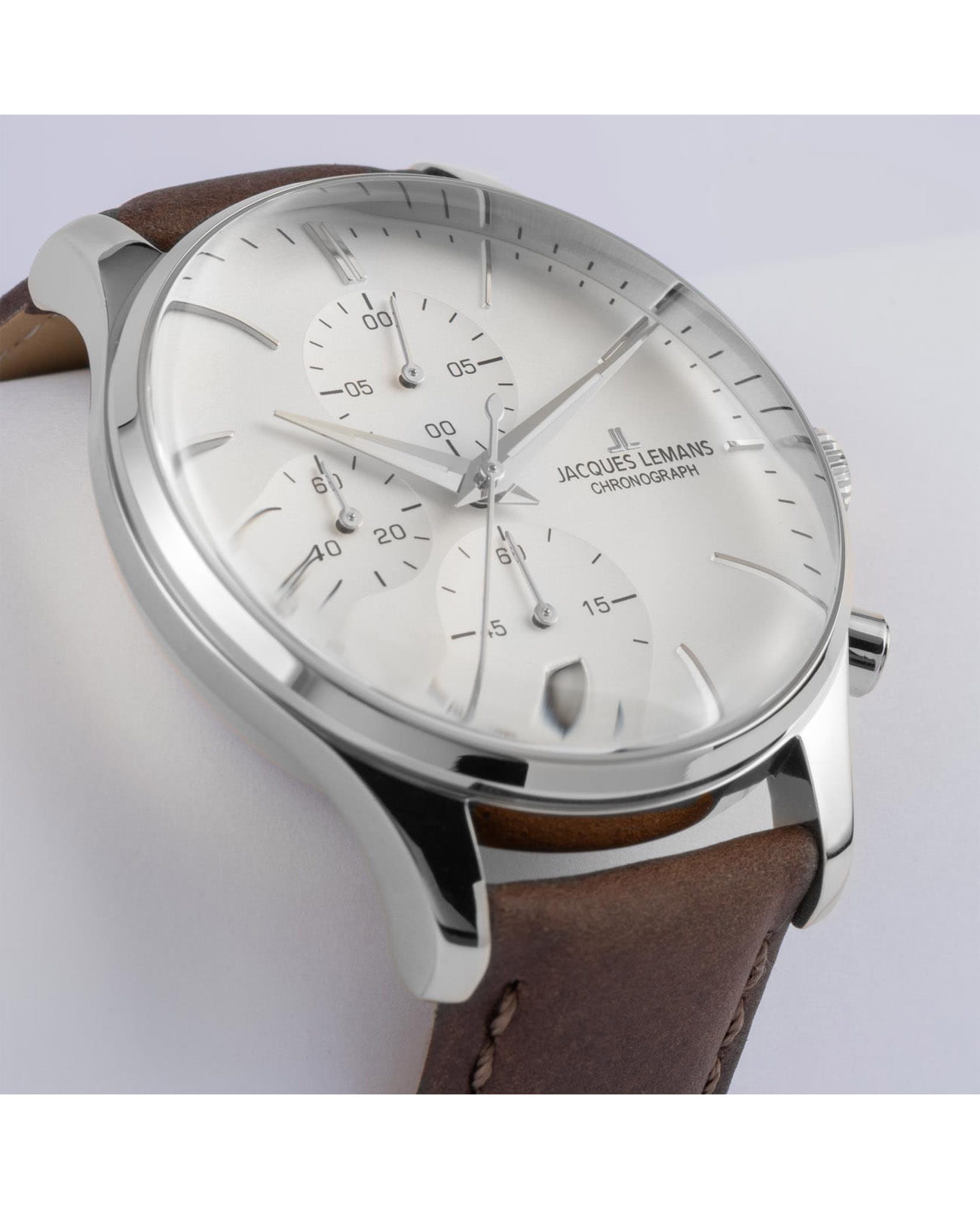 Мужские часы-хронографХронографФункция позволяет измерять отрезки времени с особой точностью: часы, минуты, секунды. Верным признаком хронографа является наличие на циферблате 3 дополнительных окошек-счётчиков. с секундомеромСекундомерСекундоме́р — прибор, способный измерять интервалы времени с точностью до долей секунды. Jacques Lemans Classic 1-2163B, кварцевый механизм с высокой точностью.  Минеральное стеклоМинеральное стеклоМинеральное стекло представляет собой искусственно выращенный минерал кварца. Такое стекло отличается особой устойчивостью к повреждениям и царапинам. Уступает по некоторым качествам сапфировому стеклу. устойчивое к мелким механическим повреждениям. Корпус часов изготовлен из стали. Окошко даты находится в положении 6 часов. Стрелки с люминесцентным покрытиемЛюминесцентное покрытиеПозволяет считывать показания времени в темноте. Производители наносят на стрелки, часовые индексы, безель или поверхность циферблата светонакопительный состав, дающий холодное свечение.. Класс водозащиты: 50 метров, позволит плавать, нырять и заниматься другими водными видами спорта. Кожаный ремешок на стандартной застёжке.