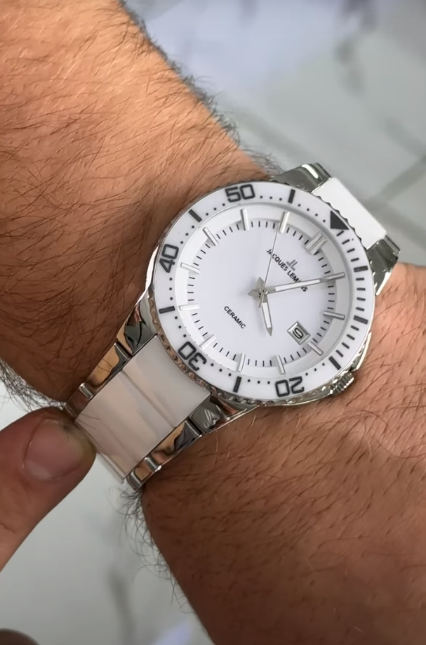 Мужские часы Jacques High Tech Ceramic 1-2164B с минеральным стекломМинеральное стеклоМинеральное стекло представляет собой искусственно выращенный минерал кварца. Такое стекло отличается особой устойчивостью к повреждениям и царапинам. Уступает по некоторым качествам сапфировому стеклу., кварцевый механизм с высокой точностью. Корпус часов из нержавеющей стали. Класс водозащиты: 100 метров, позволит плавать, нырять и заниматься другими водными видами спорта. Стальной браслет на застёжке-бабочке с кнопкамиЗастёжка "бабочка"Такой вид застёжки дополняется предохранителями, помогающими избежать случайного раскрытия браслета. Обладают изящным исполнением. с керамическими вставками. Окошко даты в положении 3 часов. Метки в виде штрихов. Стрелки и метки с люминесцентным покрытиемЛюминесцентное покрытиеПозволяет считывать показания времени в темноте. Производители наносят на стрелки, часовые индексы, безель или поверхность циферблата светонакопительный состав, дающий холодное свечение.. БезельБезельВнешний ободок, закрепляющий стекло. В спортивных часах так называется поворотное кольцо с делениями на циферблате, выполняет роль таймера – замеряет отрезки времени на шкале. Неподвижный безель – элемент декора. Однонаправленно вращающийся безель на дайверских часах позволяет фиксировать моменты погружения и выныривания на поверхность. с PVD-покрытиемPVDУльтратонкое покрытие наносится в технике вакуумного напыления, сочетает в себе нитрид титана особой прочности со слоем золота или оксида хрома. Несёт в себе декоративную или защитную функцию..
