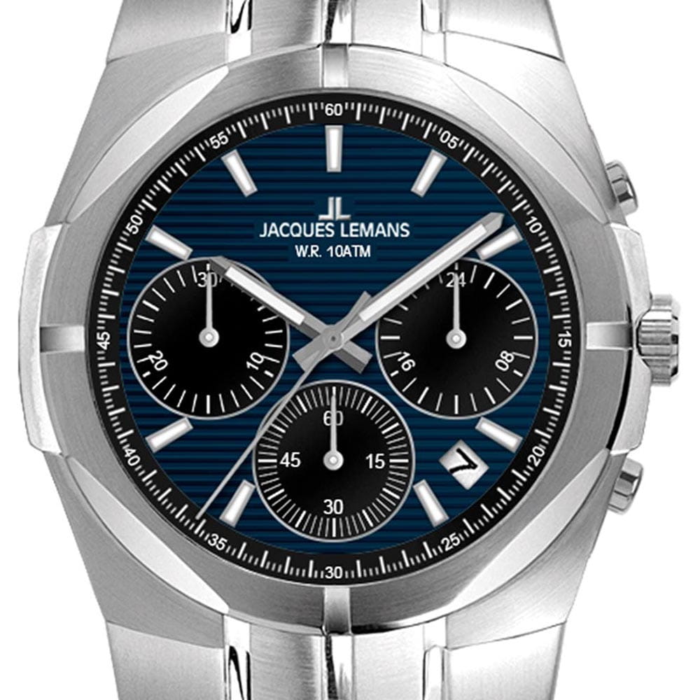 Женские кварцевые часы-хронографХронографФункция позволяет измерять отрезки времени с особой точностью: часы, минуты, секунды. Верным признаком хронографа является наличие на циферблате 3 дополнительных окошек-счётчиков. Jacques Lemans 1-2183C с минеральным стекломМинеральное стеклоМинеральное стекло представляет собой искусственно выращенный минерал кварца. Такое стекло отличается особой устойчивостью к повреждениям и царапинам. Уступает по некоторым качествам сапфировому стеклу.. Корпус выполнен из нержавеющей стали. Стрелки и метки с люминесцентным покрытиемЛюминесцентное покрытиеПозволяет считывать показания времени в темноте. Производители наносят на стрелки, часовые индексы, безель или поверхность циферблата светонакопительный состав, дающий холодное свечение.. Окошко даты находится в положении между 4 и 5 часами. Класс водозащиты: 100 метров, позволит плавать, нырять и заниматься другими водными видами спорта.