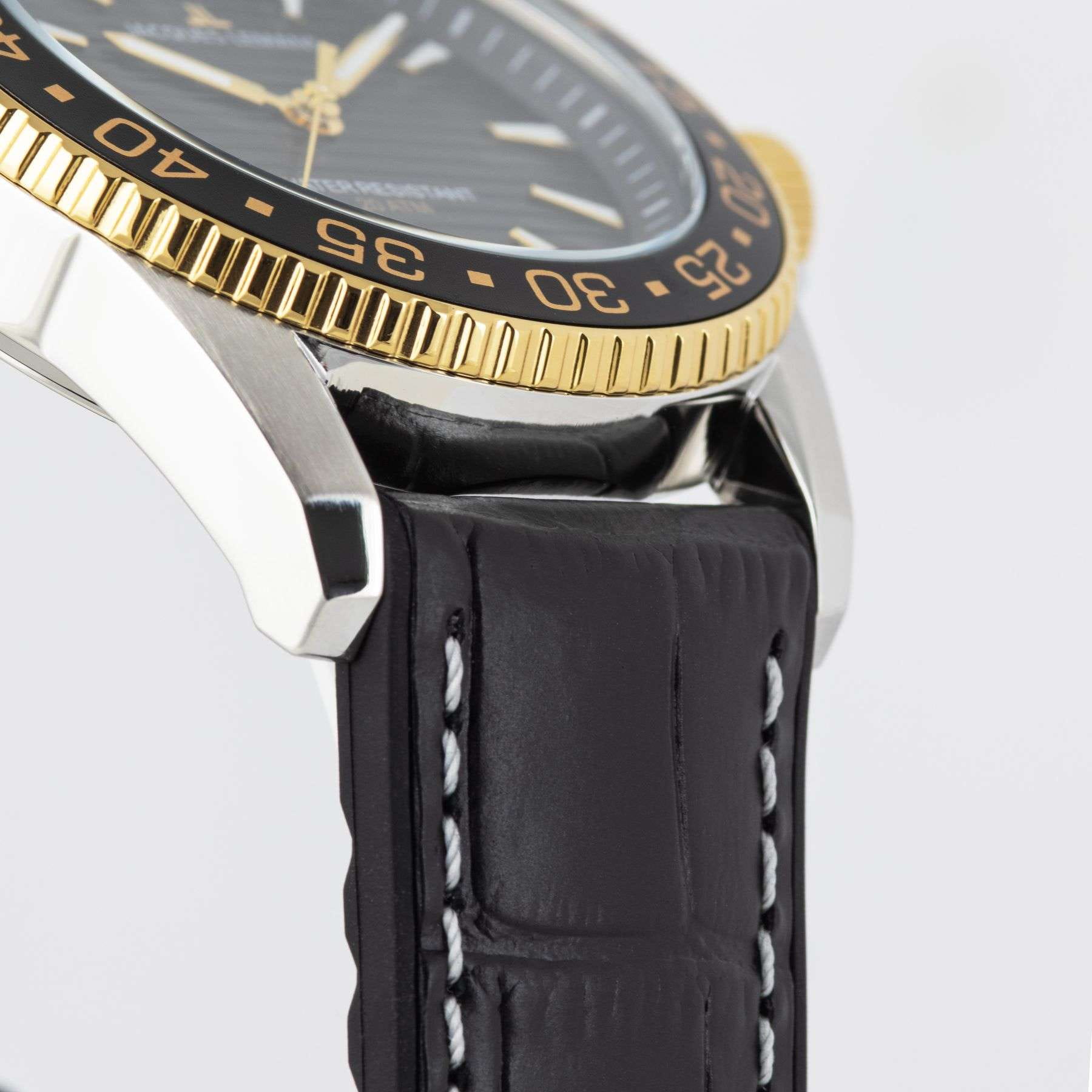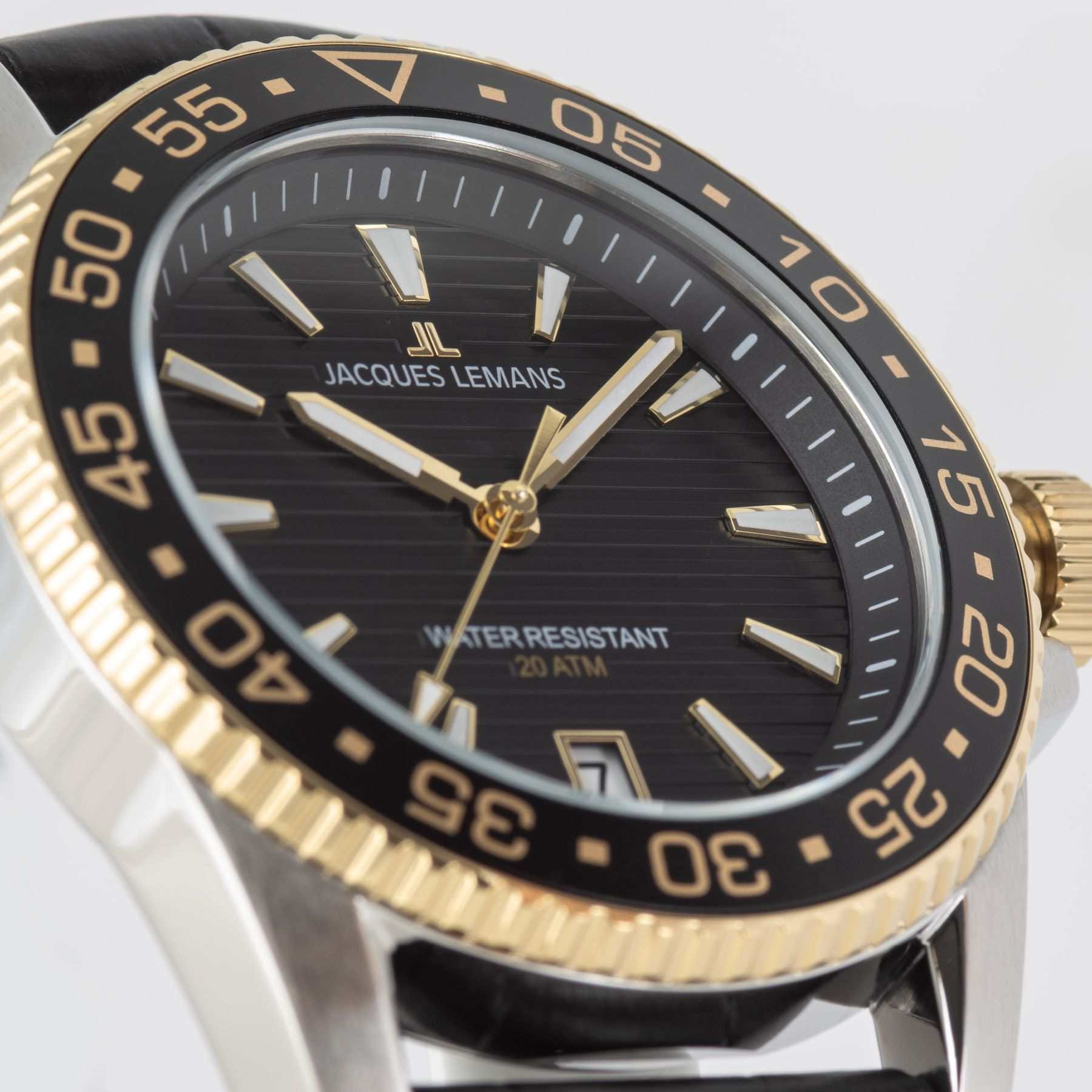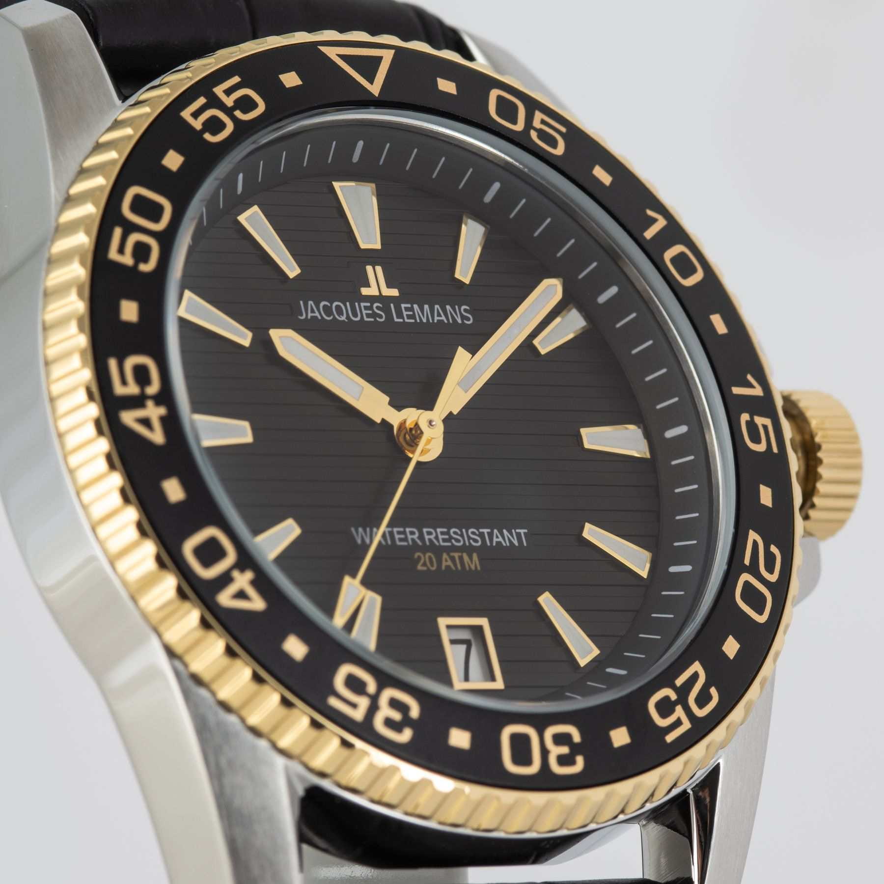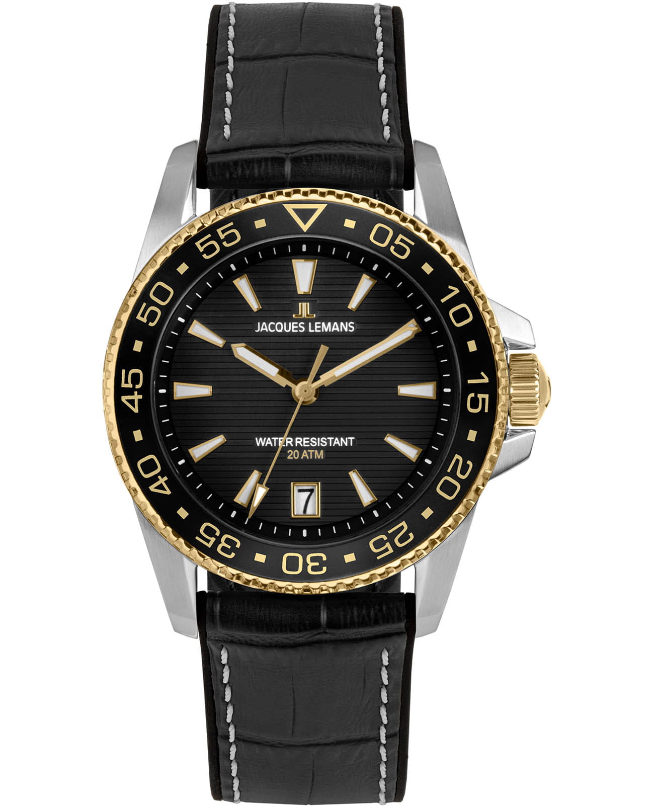 Мужские спортивные часы Jacques Lemans Liverpool Diver 1-2205G представляют собой стильный аксессуар, отражающий идеальное сочетание современного дизайна, надёжности и функциональности. Корпус из нержавеющей стали диаметром 41 мм идеально сбалансирован и элегантен. Ударопрочное минеральное стеклоМинеральное стеклоМинеральное стекло представляет собой искусственно выращенный минерал кварца. Такое стекло отличается особой устойчивостью к повреждениям и царапинам. Уступает по некоторым качествам сапфировому стеклу. Crystex защищает циферблат от царапин. Широкий безельБезельВнешний ободок, закрепляющий стекло. В спортивных часах так называется поворотное кольцо с делениями на циферблате, выполняет роль таймера – замеряет отрезки времени на шкале. Неподвижный безель – элемент декора. Однонаправленно вращающийся безель на дайверских часах позволяет фиксировать моменты погружения и выныривания на поверхность. с PVD-покрытиемPVDУльтратонкое покрытие наносится в технике вакуумного напыления, сочетает в себе нитрид титана особой прочности со слоем золота или оксида хрома. Несёт в себе декоративную или защитную функцию., на который вынесена дополнительная индикация секунд. Ремешок черного цвета состоит из двух частей: внутренняя сделана из силикона, материала, который не боится повышенной влажности, внешняя — из натуральной кожи. Водозащита 200 метров позволит плавать, нырять и заниматься другими водными видами спорта. Стрелки и метки с люминесцентным покрытиемЛюминесцентное покрытиеПозволяет считывать показания времени в темноте. Производители наносят на стрелки, часовые индексы, безель или поверхность циферблата светонакопительный состав, дающий холодное свечение. позволяющие легко определять время даже в темноте. Окошко даты находится в положении 6 часов. Это аксессуар для мужчины, который ценит классический стиль и функциональность.