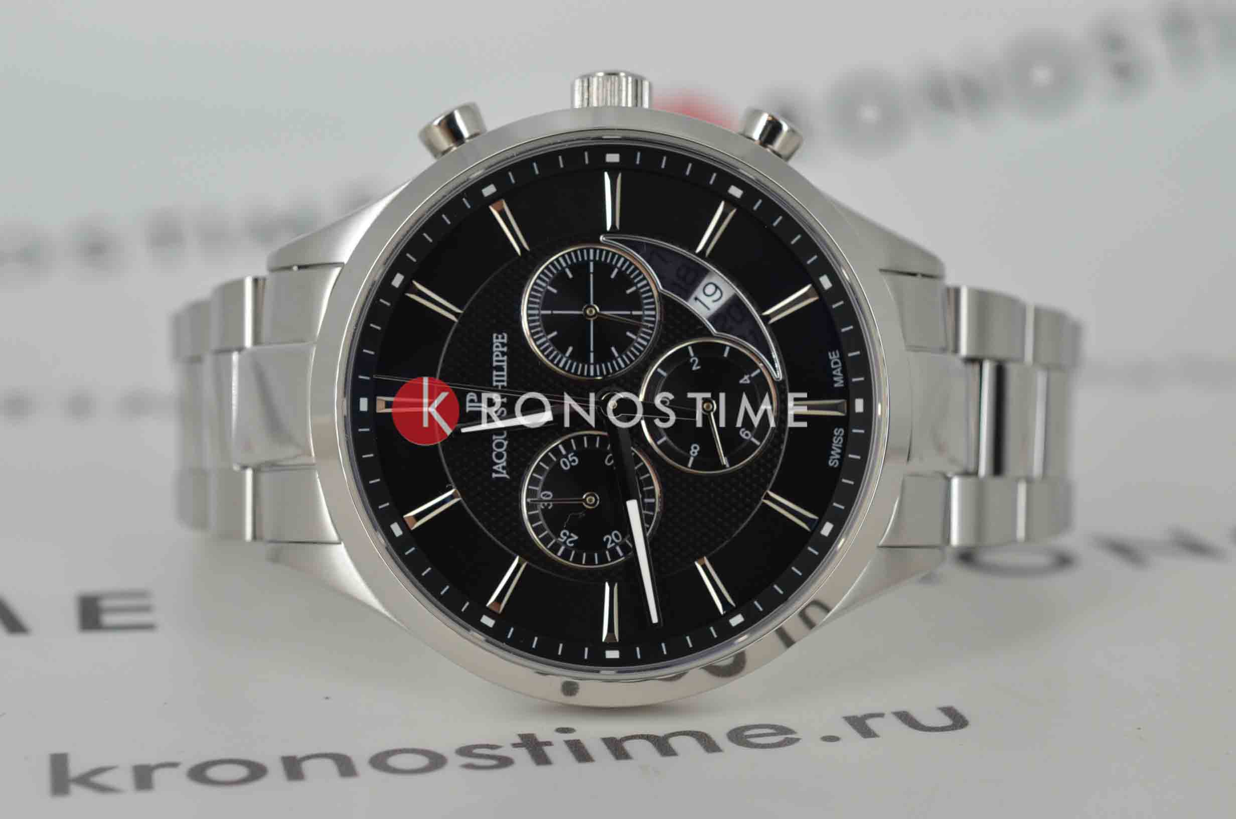 Швейцарские мужские часы-хронографХронографФункция позволяет измерять отрезки времени с особой точностью: часы, минуты, секунды. Верным признаком хронографа является наличие на циферблате 3 дополнительных окошек-счётчиков. Jacques Philippe Gallant JPQGC031316N, кварцевый механизм с высокой точностью. Сапфировое стеклоСапфировое стеклоПрочный и надёжный материал из кристалла сапфира синтетического происхождения, характеризующийся особой твёрдостью и устойчивостью к царапинам и повреждениям. устойчивое к появлению царапин, обладающее высокой прозрачностью. Корпус часов изготовлен из нержавеющей стали. На циферблате три дополнительных индикатора. Стрелки с люминесцентным покрытиемЛюминесцентное покрытиеПозволяет считывать показания времени в темноте. Производители наносят на стрелки, часовые индексы, безель или поверхность циферблата светонакопительный состав, дающий холодное свечение.. Окошко даты находится между 4 и 5 часами. Класс водозащиты: 50 метров, позволит защитить корпус от случайных брызг или капель дождя. Стальной браслет на застёжке «бабочка» с кнопкамиЗастёжка "бабочка"Такой вид застёжки дополняется предохранителями, помогающими избежать случайного раскрытия браслета. Обладают изящным исполнением. .