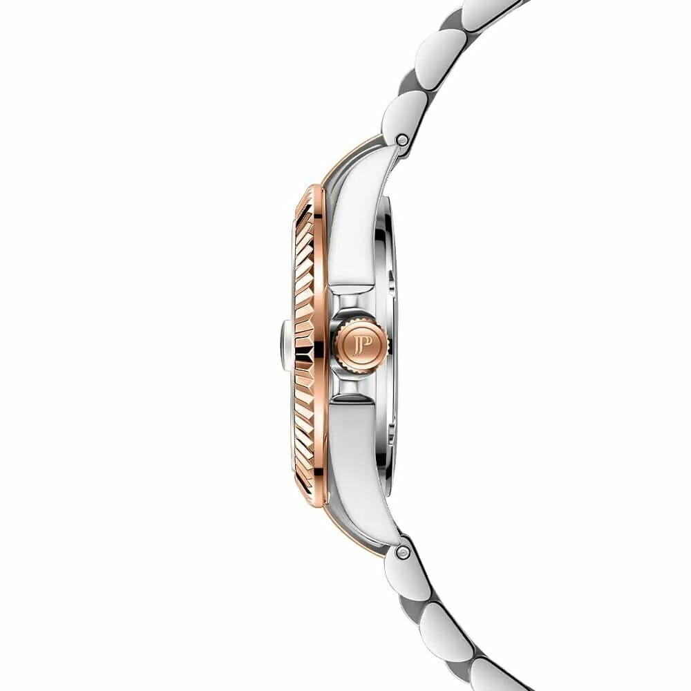 Jacques Philippe JPQLS827388RG — женские часы в сдержанном классическом исполнении с акцентом на простоту и надёжность. Корпус диаметром 26 мм выполнен из нержавеющей стали — делает модель универсальной и комфортной в повседневной носке. Циферблат оформлен в светлом металлическом тоне с тонкими стрелками, лаконичными часовыми метками и аккуратным окошком даты в позиции «3 часа». Минималистичный стиль подчёркивает строгость и чистоту дизайна. Поверхность защищена устойчивым к царапинам сапфировым стекломСапфировое стеклоПрочный и надёжный материал из кристалла сапфира синтетического происхождения, характеризующийся особой твёрдостью и устойчивостью к царапинам и повреждениям., которое обеспечивает хорошую читаемость и долговечность. БезельБезельВнешний ободок, закрепляющий стекло. В спортивных часах так называется поворотное кольцо с делениями на циферблате, выполняет роль таймера – замеряет отрезки времени на шкале. Неподвижный безель – элемент декора. Однонаправленно вращающийся безель на дайверских часах позволяет фиксировать моменты погружения и выныривания на поверхность. с PVD-покрытиемPVDУльтратонкое покрытие наносится в технике вакуумного напыления, сочетает в себе нитрид титана особой прочности со слоем золота или оксида хрома. Несёт в себе декоративную или защитную функцию.. Механизм — точный швейцарский кварц, не требующий подзавода. Он обеспечивает стабильную и бесперебойную работу часов, сохраняя точность в любых условиях. Браслет из нержавеющей стали с PVD-покрытиемPVDУльтратонкое покрытие наносится в технике вакуумного напыления, сочетает в себе нитрид титана особой прочности со слоем золота или оксида хрома. Несёт в себе декоративную или защитную функцию. визуально продолжает корпус и фиксируется на застёжке-бабочке с кнопкамиЗастёжка "бабочка"Такой вид застёжки дополняется предохранителями, помогающими избежать случайного раскрытия браслета. Обладают изящным исполнением. , обеспечивая комфортную посадку. Водозащита до 10 ATM позволяет использовать часы не только в повседневной жизни, но и при активности на воде. Jacques Philippe — это надёжная и универсальная модель для тех, кто ценит швейцарскую точность, простоту и уверенный стиль без лишних деталей.