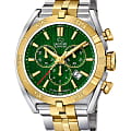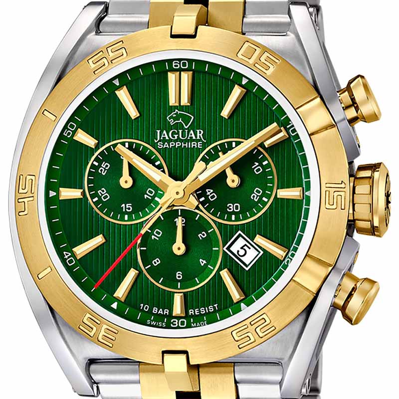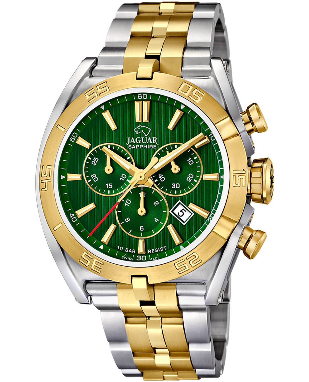 Мужские швейцарские часы-хронографХронографФункция позволяет измерять отрезки времени с особой точностью: часы, минуты, секунды. Верным признаком хронографа является наличие на циферблате 3 дополнительных окошек-счётчиков. Jaguar Executive J855/B. Кварцевый швейцарский калибр Ronda 5030d. Сапфировое стеклоСапфировое стеклоПрочный и надёжный материал из кристалла сапфира синтетического происхождения, характеризующийся особой твёрдостью и устойчивостью к царапинам и повреждениям. устойчивое к мелким механическим повреждениям. Корпус и браслет часов изготовлены из нержавеющей стали. Стрелки и метки с люминесцентным покрытиемЛюминесцентное покрытиеПозволяет считывать показания времени в темноте. Производители наносят на стрелки, часовые индексы, безель или поверхность циферблата светонакопительный состав, дающий холодное свечение.. Окошко даты находится в положении между «4» и «5 часами». Класс водозащиты: 100 метров, позволит плавать, нырять и заниматься другими водными видами спорта. Стальной браслет с частичным  PVD-покрытиемPVDУльтратонкое покрытие наносится в технике вакуумного напыления, сочетает в себе нитрид титана особой прочности со слоем золота или оксида хрома. Несёт в себе декоративную или защитную функцию. на раскладной застёжкеРаскладная застёжкаТакой тип застёжки используется только на браслетах из металла. Она никогда не раскрывается полностью, происходит разделение на 2 и более частей. Раскладывающая застёжка снизит вероятность потери часов к минимуму.. БезельБезельВнешний ободок, закрепляющий стекло. В спортивных часах так называется поворотное кольцо с делениями на циферблате, выполняет роль таймера – замеряет отрезки времени на шкале. Неподвижный безель – элемент декора. Однонаправленно вращающийся безель на дайверских часах позволяет фиксировать моменты погружения и выныривания на поверхность. с PVD-покрытиемPVDУльтратонкое покрытие наносится в технике вакуумного напыления, сочетает в себе нитрид титана особой прочности со слоем золота или оксида хрома. Несёт в себе декоративную или защитную функцию..
