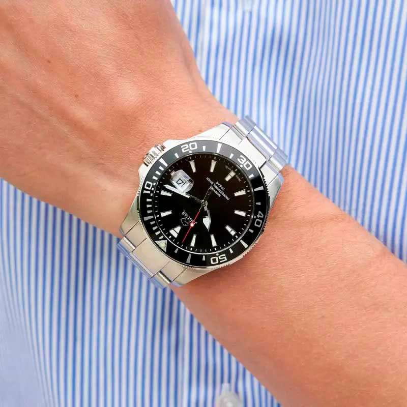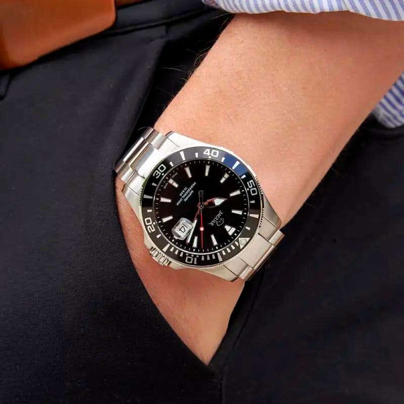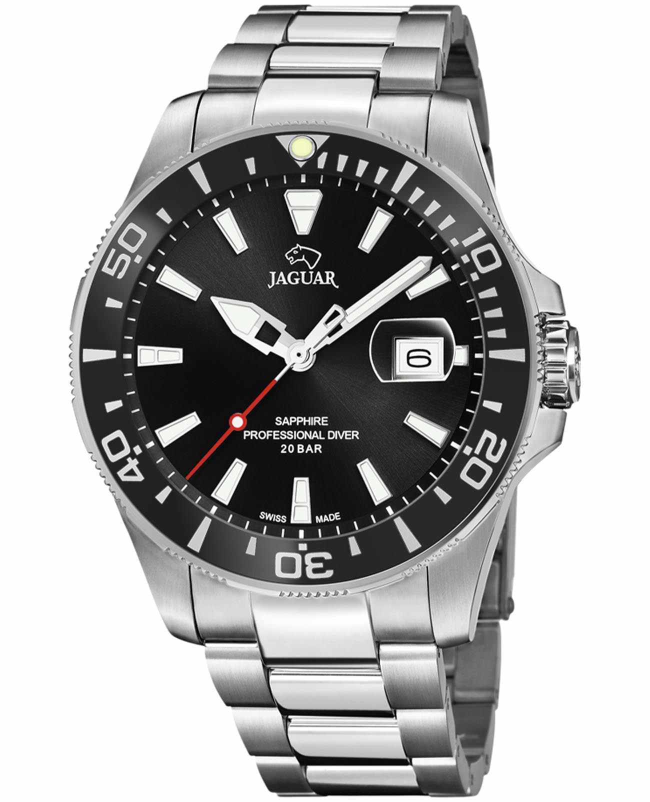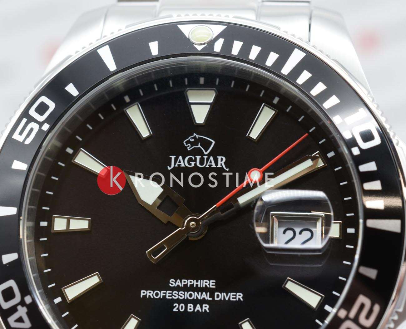 Мужские швейцарские часы Jaguar Executive Diver J860/D. Кварцевый швейцарский калибр Ronda 6003D. Сапфировое стеклоСапфировое стеклоПрочный и надёжный материал из кристалла сапфира синтетического происхождения, характеризующийся особой твёрдостью и устойчивостью к царапинам и повреждениям. устойчивое к мелким механическим повреждениям. Корпус и браслет часов изготовлены из нержавеющей стали. Стрелки и метки с люминесцентным покрытиемЛюминесцентное покрытиеПозволяет считывать показания времени в темноте. Производители наносят на стрелки, часовые индексы, безель или поверхность циферблата светонакопительный состав, дающий холодное свечение.. Окошко даты находится в положении 3 часа. Класс водозащиты: 200 метров, позволит плавать, нырять и заниматься другими водными видами спорта. Стальной браслет на раскладной застёжкеРаскладная застёжкаТакой тип застёжки используется только на браслетах из металла. Она никогда не раскрывается полностью, происходит разделение на 2 и более частей. Раскладывающая застёжка снизит вероятность потери часов к минимуму.. БезельБезельВнешний ободок, закрепляющий стекло. В спортивных часах так называется поворотное кольцо с делениями на циферблате, выполняет роль таймера – замеряет отрезки времени на шкале. Неподвижный безель – элемент декора. Однонаправленно вращающийся безель на дайверских часах позволяет фиксировать моменты погружения и выныривания на поверхность. с PVD-покрытиемPVDУльтратонкое покрытие наносится в технике вакуумного напыления, сочетает в себе нитрид титана особой прочности со слоем золота или оксида хрома. Несёт в себе декоративную или защитную функцию..