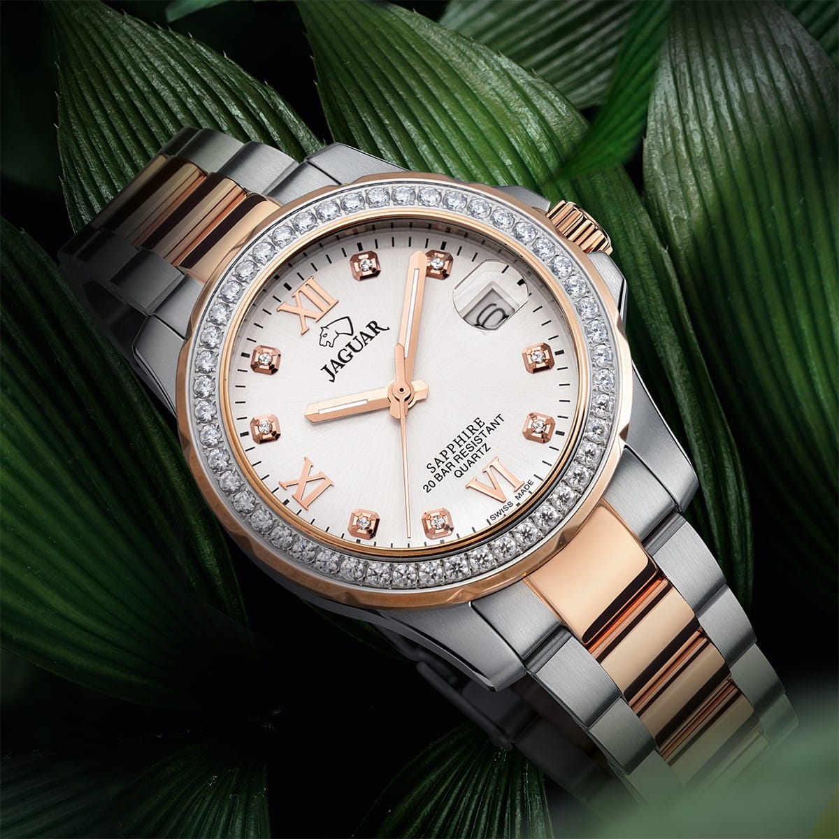 Женские швейцарские часы Jaguar Woman J894/1. Кварцевый швейцарский калибр Ronda 705. Сапфировое стеклоСапфировое стеклоПрочный и надёжный материал из кристалла сапфира синтетического происхождения, характеризующийся особой твёрдостью и устойчивостью к царапинам и повреждениям. устойчивое к мелким механическим повреждениям. Корпус и браслет часов изготовлены из нержавеющей стали, с безелем, инкрустированным цирконием. Стрелки с люминесцентным покрытиемЛюминесцентное покрытиеПозволяет считывать показания времени в темноте. Производители наносят на стрелки, часовые индексы, безель или поверхность циферблата светонакопительный состав, дающий холодное свечение.. Окошко даты находится в положении 3 часа. Класс водозащиты: 200 метров, позволит плавать, нырять и заниматься другими водными видами спорта. Стальной браслет с частичным PVD-покрытиемPVDУльтратонкое покрытие наносится в технике вакуумного напыления, сочетает в себе нитрид титана особой прочности со слоем золота или оксида хрома. Несёт в себе декоративную или защитную функцию. на раскладной застёжкеРаскладная застёжкаТакой тип застёжки используется только на браслетах из металла. Она никогда не раскрывается полностью, происходит разделение на 2 и более частей. Раскладывающая застёжка снизит вероятность потери часов к минимуму.. Циферблат украшен кристаллами в роли часовых индексов. БезельБезельВнешний ободок, закрепляющий стекло. В спортивных часах так называется поворотное кольцо с делениями на циферблате, выполняет роль таймера – замеряет отрезки времени на шкале. Неподвижный безель – элемент декора. Однонаправленно вращающийся безель на дайверских часах позволяет фиксировать моменты погружения и выныривания на поверхность. с PVD-покрытиемPVDУльтратонкое покрытие наносится в технике вакуумного напыления, сочетает в себе нитрид титана особой прочности со слоем золота или оксида хрома. Несёт в себе декоративную или защитную функцию. инкрустирован кристаллами.