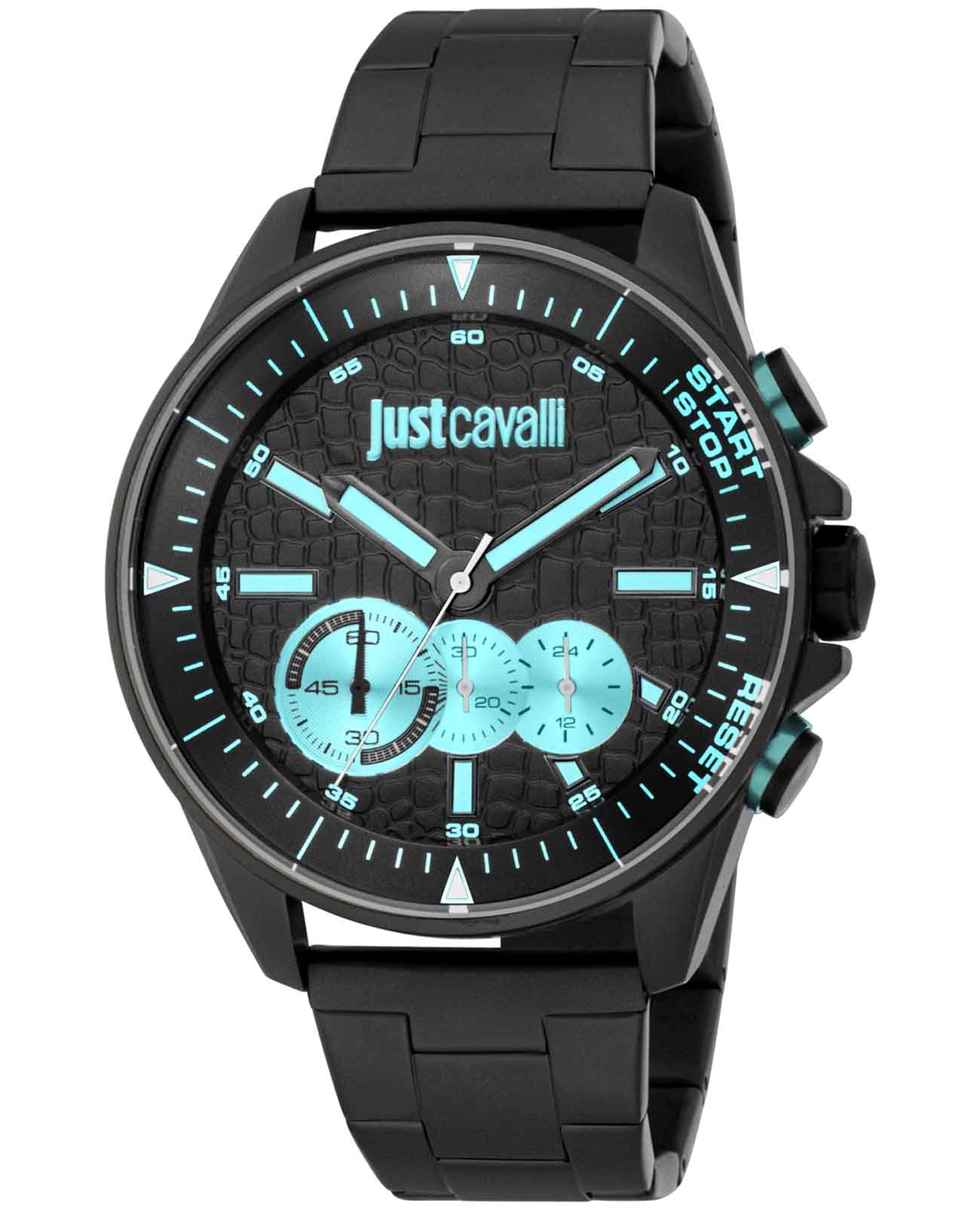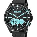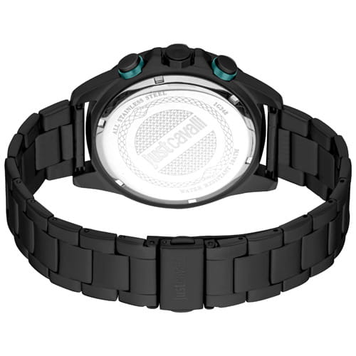 JUST CAVALLI JC1G348M0085 — стильные итальянские часы с функцией хронографаХронографФункция позволяет измерять отрезки времени с особой точностью: часы, минуты, секунды. Верным признаком хронографа является наличие на циферблате 3 дополнительных окошек-счётчиков., которые сочетают в себе элегантность и современный функционал. Круглый корпус диаметром 45 мм выполнен из нержавеющей стали с PVD-покрытиемPVDУльтратонкое покрытие наносится в технике вакуумного напыления, сочетает в себе нитрид титана особой прочности со слоем золота или оксида хрома. Несёт в себе декоративную или защитную функцию., толщина корпуса составляет 11 мм, что придает модели выразительный внешний вид и надежную защиту от внешних воздействий. Часы оснащены кварцевым механизмом, также обладают функцией отображения даты, что делает их удобными для ежедневного использования. Минеральное стеклоМинеральное стеклоМинеральное стекло представляет собой искусственно выращенный минерал кварца. Такое стекло отличается особой устойчивостью к повреждениям и царапинам. Уступает по некоторым качествам сапфировому стеклу. защищает часы от царапин, а водозащита 100 метров идеально подходит для повседневного ношения. Стрелки с люминесцентным покрытиемЛюминесцентное покрытиеПозволяет считывать показания времени в темноте. Производители наносят на стрелки, часовые индексы, безель или поверхность циферблата светонакопительный состав, дающий холодное свечение.. Стальной браслет на раскладной застёжкеРаскладная застёжкаТакой тип застёжки используется только на браслетах из металла. Она никогда не раскрывается полностью, происходит разделение на 2 и более частей. Раскладывающая застёжка снизит вероятность потери часов к минимуму. обеспечивает комфортное ношение.