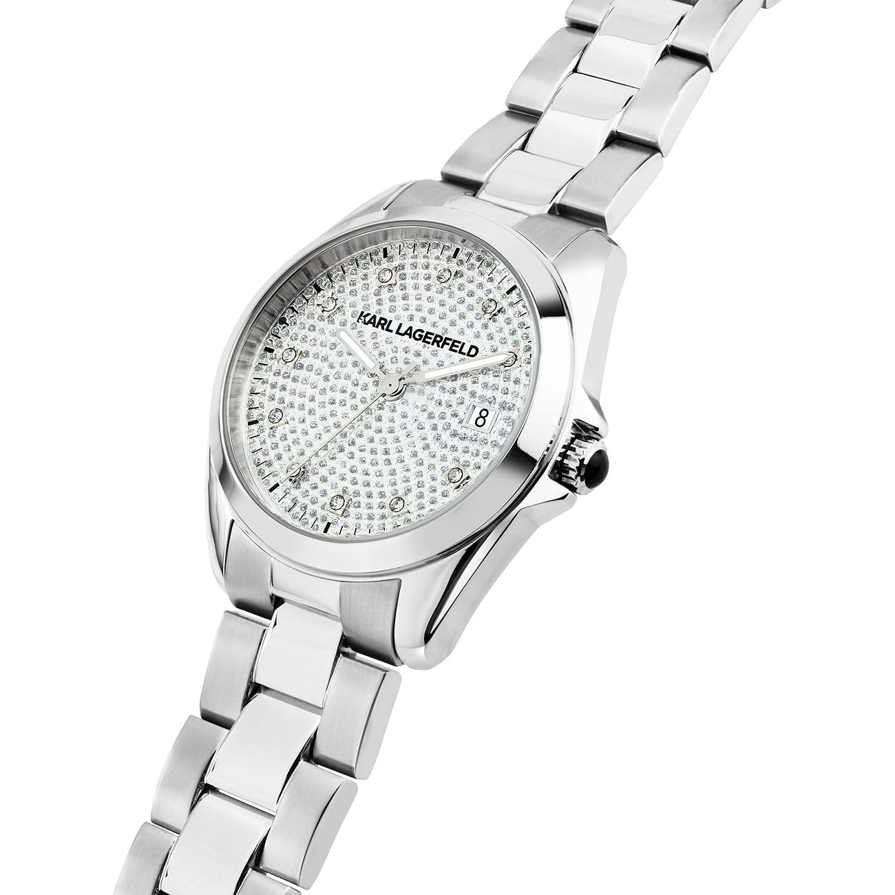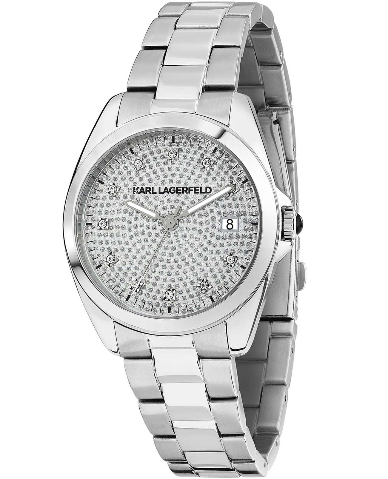 Женские элегантные часы Karl Lagerfeld Round Essentials R0553101509, кварцевый механизм с высокой точностью. Минеральное стеклоМинеральное стеклоМинеральное стекло представляет собой искусственно выращенный минерал кварца. Такое стекло отличается особой устойчивостью к повреждениям и царапинам. Уступает по некоторым качествам сапфировому стеклу. устойчивое к появлению царапин, обладающее высокой прозрачностью. Изысканный корпус изготовлен из нержавеющей стали. Лаконичные центральные часовая, минутная и секундная стрелки. Водонепроницаемость 5 АТМ позволяет использовать часы в повседневных условиях — при мытье рук или под лёгким дождём. Стальной браслет c раскладной застёжкойРаскладная застёжкаТакой тип застёжки используется только на браслетах из металла. Она никогда не раскрывается полностью, происходит разделение на 2 и более частей. Раскладывающая застёжка снизит вероятность потери часов к минимуму., обеспечивающей комфорт и уверенную фиксацию на запястье, а также добавляя завершающий штрих к этому стильному аксессуару. Стрелки и метки оснащены люминесцентным покрытиемЛюминесцентное покрытиеПозволяет считывать показания времени в темноте. Производители наносят на стрелки, часовые индексы, безель или поверхность циферблата светонакопительный состав, дающий холодное свечение., обеспечивающим хорошую читаемость в темноте. Циферблат с кристаллами подчёркивает изысканный характер часов, создавая универсальный образ, подходящий как для повседневных ситуаций, так и для особых случаев. Аккуратное окошко даты на отметке «3 часов».