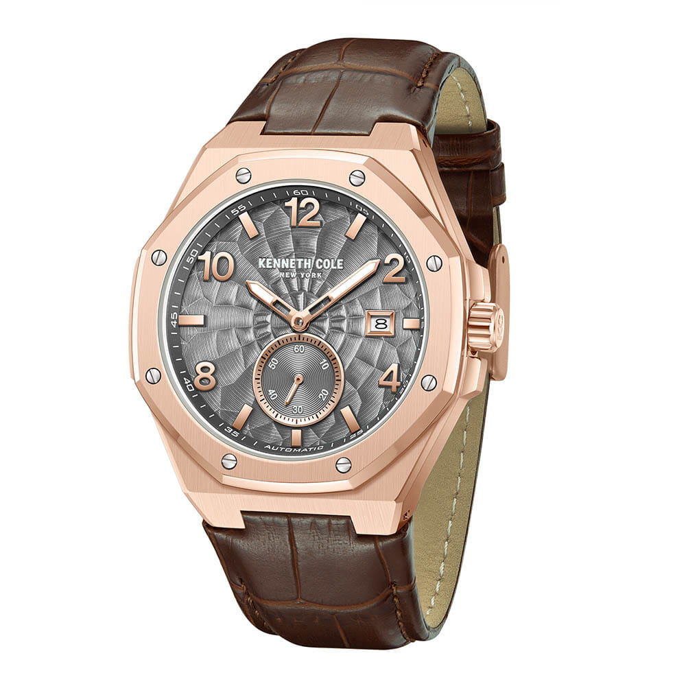 Мужские механические часы с автоподзаводом Kenneth Cole KCWGX0059002 — это стильный и современный аксессуар с выразительным дизайном. Корпус размером 43 × 50 мм выполнен из стали с IP-покрытиемIP-покрытиеМетод ионного напыления. Демонстрирует повышенную устойчивость к истиранию, окислению и химическим веществам. Под воздействием высокого давления и температуры около 1500°C молекулы металла надёжно соединяются с частицами корпуса часов. розового золота. Циферблат серого цвета оформлен метками в виде арабских цифр и штрихов, а секундная стрелка вынесена на отдельный малый циферблат. Окошко даты расположено в положении 3 часов. Циферблат защищён минеральным стекломМинеральное стеклоМинеральное стекло представляет собой искусственно выращенный минерал кварца. Такое стекло отличается особой устойчивостью к повреждениям и царапинам. Уступает по некоторым качествам сапфировому стеклу.. Часы оснащены ремешком из натуральной кожи коричневого цвета с классической пряжкой. Водонепроницаемость 50 м позволяет использовать часы для плавания и повседневного ношения.