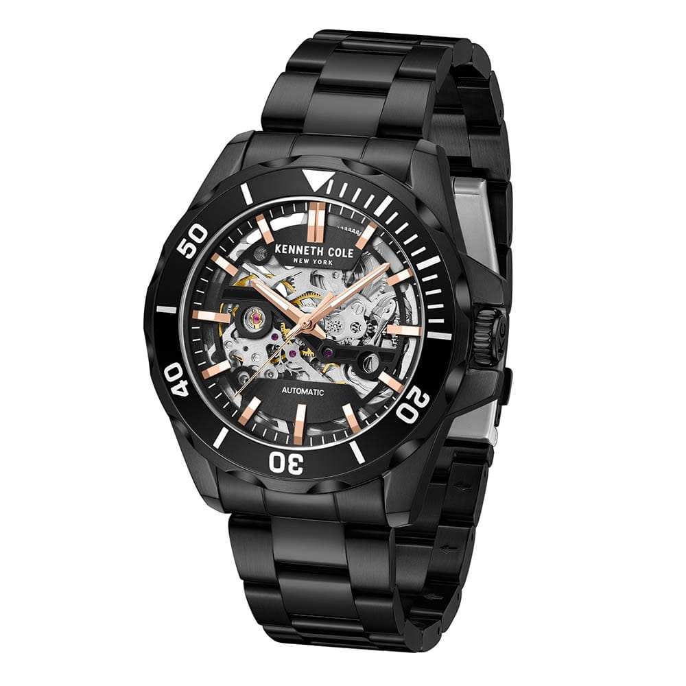 Мужские механические часы с автоподзаводом Kenneth Cole KCWGY0046002 — это стильный и современный аксессуар с выразительным дизайном. Корпус диаметром 43 мм выполнен из стали с IP-покрытиемIP-покрытиеМетод ионного напыления. Демонстрирует повышенную устойчивость к истиранию, окислению и химическим веществам. Под воздействием высокого давления и температуры около 1500°C молекулы металла надёжно соединяются с частицами корпуса часов. чёрного цвета. Циферблат чёрного цвета оснащён люминесцентным покрытиемЛюминесцентное покрытиеПозволяет считывать показания времени в темноте. Производители наносят на стрелки, часовые индексы, безель или поверхность циферблата светонакопительный состав, дающий холодное свечение. и частично скелетонизирован, что позволяет наблюдать за работой механизма. Циферблат защищён минеральным стекломМинеральное стеклоМинеральное стекло представляет собой искусственно выращенный минерал кварца. Такое стекло отличается особой устойчивостью к повреждениям и царапинам. Уступает по некоторым качествам сапфировому стеклу. и оформлен метками в виде арабских цифр и штрихов. Часы оснащены браслетом из нержавеющей стали чёрного цвета с раскладной застёжкойРаскладная застёжкаТакой тип застёжки используется только на браслетах из металла. Она никогда не раскрывается полностью, происходит разделение на 2 и более частей. Раскладывающая застёжка снизит вероятность потери часов к минимуму.. Водонепроницаемость 50 м позволяет использовать часы для плавания и повседневного ношения. Стильно и практично.