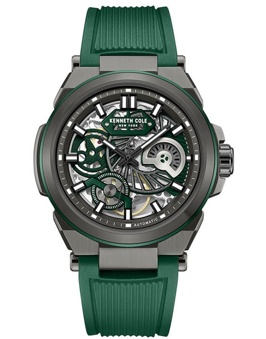 Kenneth Cole KCWGZ0065603 — мужская автоматическая модель с эффектным скелетонизированным дизайном и современным спортивным акцентом. Крупный корпус выполнен из нержавеющей стали с тёмным PVDPVDУльтратонкое покрытие наносится в технике вакуумного напыления, сочетает в себе нитрид титана особой прочности со слоем золота или оксида хрома. Несёт в себе декоративную или защитную функцию.-покрытием, подчёркивающим строгий и технологичный характер модели. Циферблат с открытой архитектурой даёт возможность наблюдать за работой механизма, а стрелки и метки с люминесцентным покрытиемЛюминесцентное покрытиеПозволяет считывать показания времени в темноте. Производители наносят на стрелки, часовые индексы, безель или поверхность циферблата светонакопительный состав, дающий холодное свечение. обеспечивают читаемость даже в условиях слабого освещения. Защитную функцию выполняет минеральное стеклоМинеральное стеклоМинеральное стекло представляет собой искусственно выращенный минерал кварца. Такое стекло отличается особой устойчивостью к повреждениям и царапинам. Уступает по некоторым качествам сапфировому стеклу., устойчивое к повседневным повреждениям. Часы дополнены удобным каучуковым ремешком, который подчёркивает спортивную направленность модели и обеспечивает комфорт при носке.