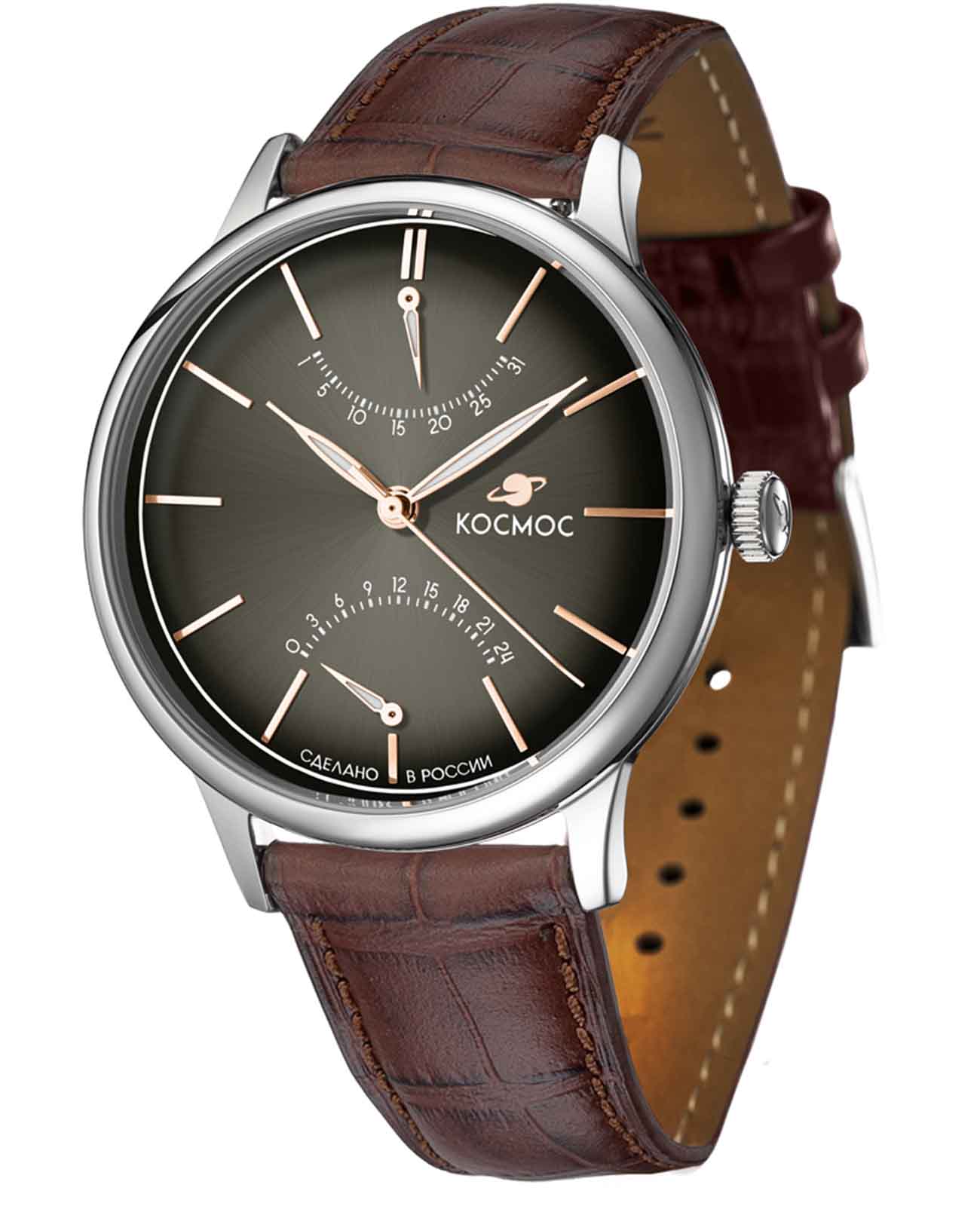 Российские мужские кварцевые часы Космос K 058.12.34 из коллекции Космопорт оснащены корпусом из нержавеющей стали 316L диаметром 41 мм и защищены минеральным стекломМинеральное стеклоМинеральное стекло представляет собой искусственно выращенный минерал кварца. Такое стекло отличается особой устойчивостью к повреждениям и царапинам. Уступает по некоторым качествам сапфировому стеклу., выпуклым с обеих сторон. Циферблат дополнен функциями отображения даты и 24-часового формата времени. Индикаторы дня недели и 24 часов выполнены по принципу ретрограда: стрелка, достигнув конца отрезка, возвращается в исходное положение одним движением. Секундная стрелка выгнута, что соответствует форме циферблата. На стальной задней крышке выгравирован фантазийный сюжет о космическом будущем человека. Заводная головка декорирована логотипом бренда в виде стилизованного изображения планеты. Часы имеют водонепроницаемость 50 метров, позволит защитить корпус от случайных брызг или капель дождя.Модель комплектуется ремешком из натуральной кожи коричневого цвета с прошивкой на стандартной застежке. Специальные крепежи позволяют легко заменить ремешок на часах самостоятельно. Прочный корпус, уникальный дизайн и надежный механизм делают эти часы универсальным аксессуаром для повседневного использования, подчеркивая индивидуальность владельца.