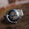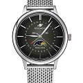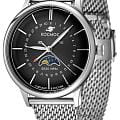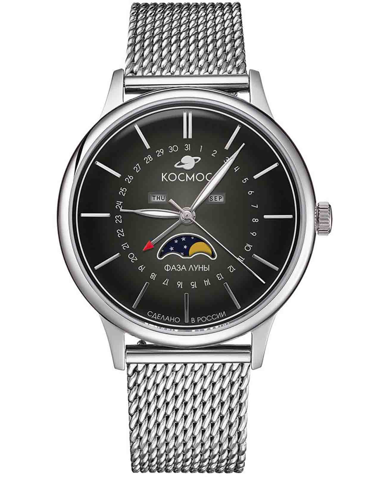 Российские мужские кварцевые часы Космос K 067.10.31 из коллекции Сатурн оснащены механизмом Miyota. Круглый корпус из нержавеющей стали 316L диаметром 41 мм и толщиной 13 мм защищен минеральным стекломМинеральное стеклоМинеральное стекло представляет собой искусственно выращенный минерал кварца. Такое стекло отличается особой устойчивостью к повреждениям и царапинам. Уступает по некоторым качествам сапфировому стеклу.. Черный циферблат с серыми элементами и градиентной шлифовкой в стиле солнечных лучей украшен изготовленными вручную индексами, крепящимися на двух штифтах. Часы имеют функции отображения даты центральной стрелкой, дня недели и индикатора фаз луны. Часовая, минутная стрелки, круг по краю циферблата и линия вокруг окошка индикатора фаз луны имеют люминесцентное покрытиеЛюминесцентное покрытиеПозволяет считывать показания времени в темноте. Производители наносят на стрелки, часовые индексы, безель или поверхность циферблата светонакопительный состав, дающий холодное свечение., которое светится в темноте, создавая эффект ореола вокруг Земли. На задней крышке выгравирован фантазийный сюжет — космическая станция будущего. Полированный корпус часов напоминает силуэт летающей тарелки благодаря выпуклым формам стекла и нижней части корпуса. Часы имеют водонепроницаемость 50 метров, позволит защитить корпус от случайных брызг или капель дождя. Модель комплектуется стальным браслетом миланского плетения на раскладном замкеРаскладной замокДанный вариант застежки используется только на часах с металлическим браслетом. Отличительная особенность такого крепления в том, что длина браслета становится универсальной и вы можете самостоятельно отрегулировать нужный вам размер – застежка просто двигается по браслету часов.. Эти часы сочетают в себе классический дизайн, современные технологии и футуристическое вдохновение, делая их идеальным выбором для ценителей точности и элегантности.