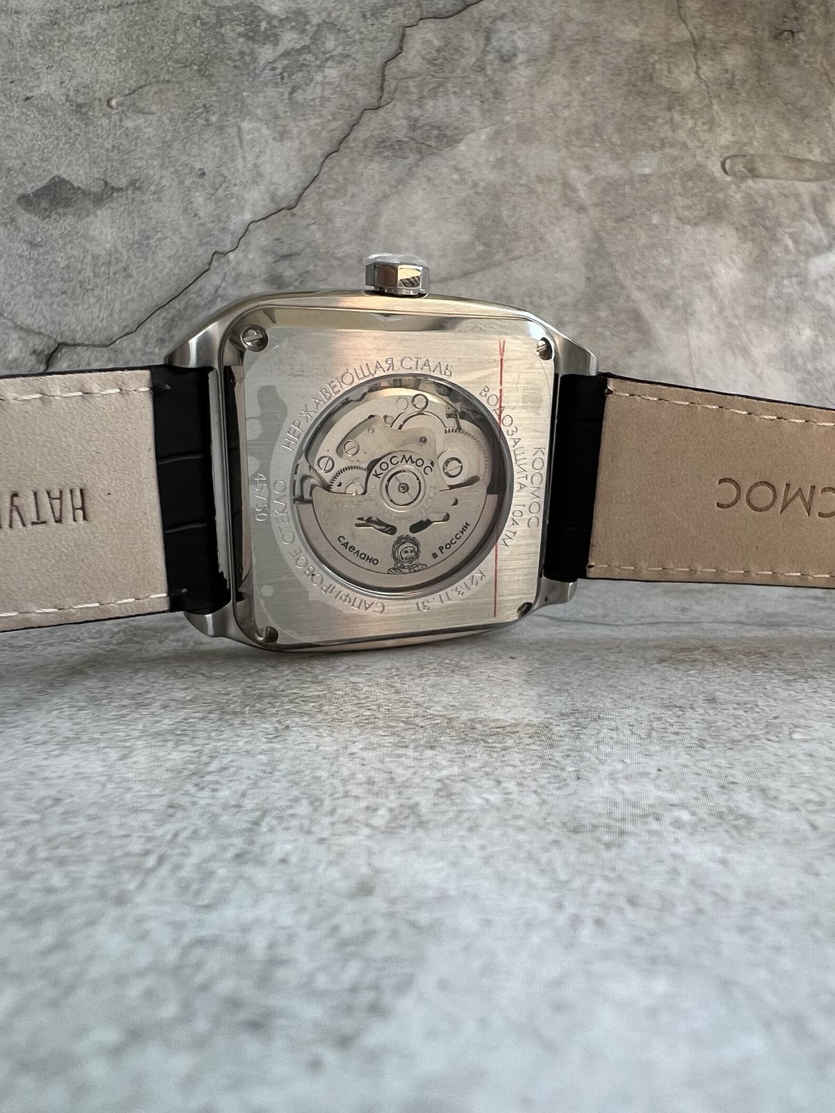 Мужские наручные часы Космос Марсоход K 213.16.36 — это уникальная лимитированная серия, посвященная аппарату, способному передвигаться по поверхности Красной планеты. Марсоход ассоциируется с брутальностью, мастерством и технической сложностью. Наша страна дважды запускала подобные аппараты еще в 70-х годах прошлого века. Дизайн часов серии Марсоход вдохновлен лучшими работами советских мастеров, сочетая современные технологии часового искусства с обаянием стиля ретро. Корпус в форме квадрата с закругленными углами выполнен из нержавеющей стали марки 316L, украшенной зеркальной полировкой и сатинированием. Удобная заводная головка имеет форму гайки, что добавляет модели индустриальный шарм. Задняя крышка прозрачная, закрепленная на четырех винтах, и позволяет увидеть работу механизма TMI с подвижным ротором, на котором гравируется надпись «Сделано в России». Также здесь представлена гравировка с изображением космонавта, придающая часам особую значимость. Водостойкость достигает 10 атм (WR100), что позволяет использовать часы при плавании и других водных видах спорта. На задней крышке указан индивидуальный номер модели в формате от 01/50 до 50/50 (первый выпуск) или от 051/100 до 100/100 (второй выпуск). Объемный циферблат состоит из двух уровней. В центре движутся три стрелки, часовая и минутная из которых имеют люминесцентное покрытиеЛюминесцентное покрытиеПозволяет считывать показания времени в темноте. Производители наносят на стрелки, часовые индексы, безель или поверхность циферблата светонакопительный состав, дающий холодное свечение., позволяющее определять время даже в темноте. Индексы накладные, как и стальная рамка, выделяющая сдвоенное окошко даты и дня недели, где день недели отображается на двух языках — русском и английском. Циферблат защищен прочным сапфировым стеклом с антибликовым покрытиемСапфировое стеклоПрочный и надёжный материал из кристалла сапфира синтетического происхождения, характеризующийся особой твёрдостью и устойчивостью к царапинам и повреждениям., обеспечивающим отличную читаемость показаний в любых условиях. Кожаный ремешок оснащен удобной застёжкой «бабочка» с кнопкамиЗастёжка "бабочка"Такой вид застёжки дополняется предохранителями, помогающими избежать случайного раскрытия браслета. Обладают изящным исполнением. , которая сводит к минимуму вероятность потери. Коллекция Марсоход — идеальный выбор для ценителей истории космических достижений и современных технологий.
