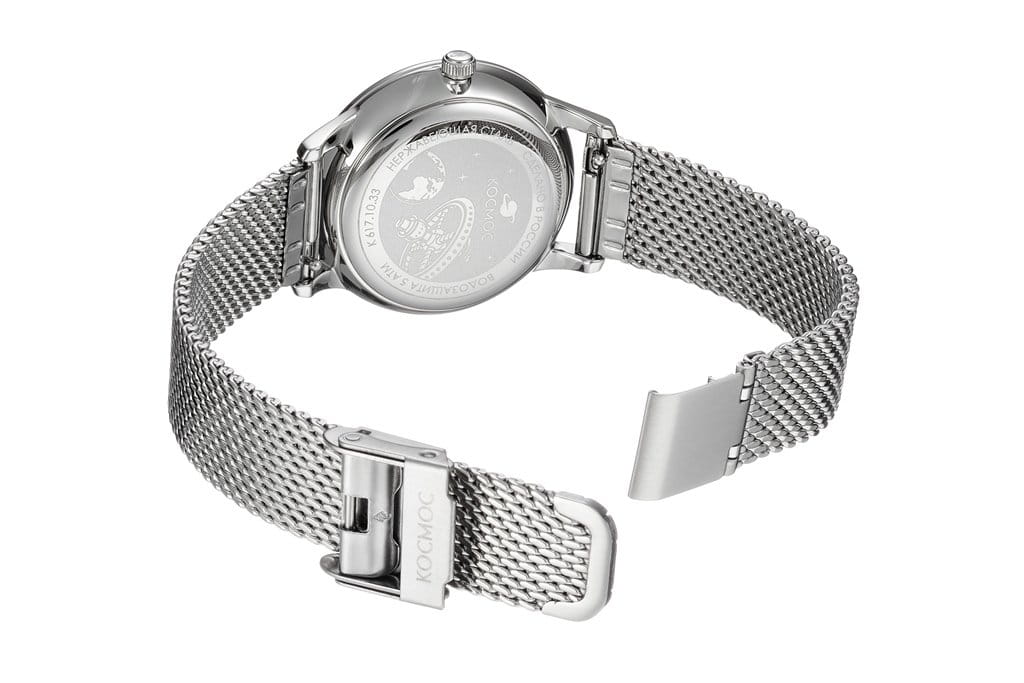 Женские наручные часы Космос Солнце и Луна K 617.10.36 — это сочетание традиций часового искусства 60-70-х годов и футуристического дизайна, вдохновленного космическими исследованиями. Они не только служат напоминанием о прошлом, но и побуждают задуматься о будущем, позволяя наслаждаться качеством и смыслом, вложенными в каждую деталь. Полированный корпус часов выполнен в виде силуэта летающей тарелки благодаря выпуклым формам стекла и нижней части корпуса. Стальные ушки, которые напоминают опоры летающей тарелки, завершает общий образ. На задней крышке часов выгравирован фантазийный сюжет – космическая станция будущего. Элегантные женские часы из серии Солнце и Луна выделяются функцией день/ночь. Циферблат выполнен в ретро-стиле с выгнутыми краями, что требует применения сложных технологий в производстве. Циферблаты такой формы были характерны для часов прошлых эпох. Кончик секундной стрелки изогнут в соответствии с формой циферблата. На градиентном выпуклом циферблате выполнена шлифовка в стиле солнечных лучей, а также размещены индексы, изготовленные вручную и закрепленные на двух штифтах.  Часовая и минутная стрелки, а также круг по краю циферблата, напоминающий ореол Земли, с  люминесцентным покрытиемЛюминесцентное покрытиеПозволяет считывать показания времени в темноте. Производители наносят на стрелки, часовые индексы, безель или поверхность циферблата светонакопительный состав, дающий холодное свечение., которое светится в темноте, создавая завораживающий эффект. Форма минерального стеклаМинеральное стеклоМинеральное стекло представляет собой искусственно выращенный минерал кварца. Такое стекло отличается особой устойчивостью к повреждениям и царапинам. Уступает по некоторым качествам сапфировому стеклу. тщательно продумана: оно выгнуто как снаружи, так и изнутри. Такое решение позволяет избежать искажения изображения на циферблате, в отличие от стекла с прямой внутренней частью, которое создает эффект линзы. Модель оснащена гибким и прочным браслетом миланского плетения. Заводная головка, застежка и ремешок украшены фирменным логотипом.