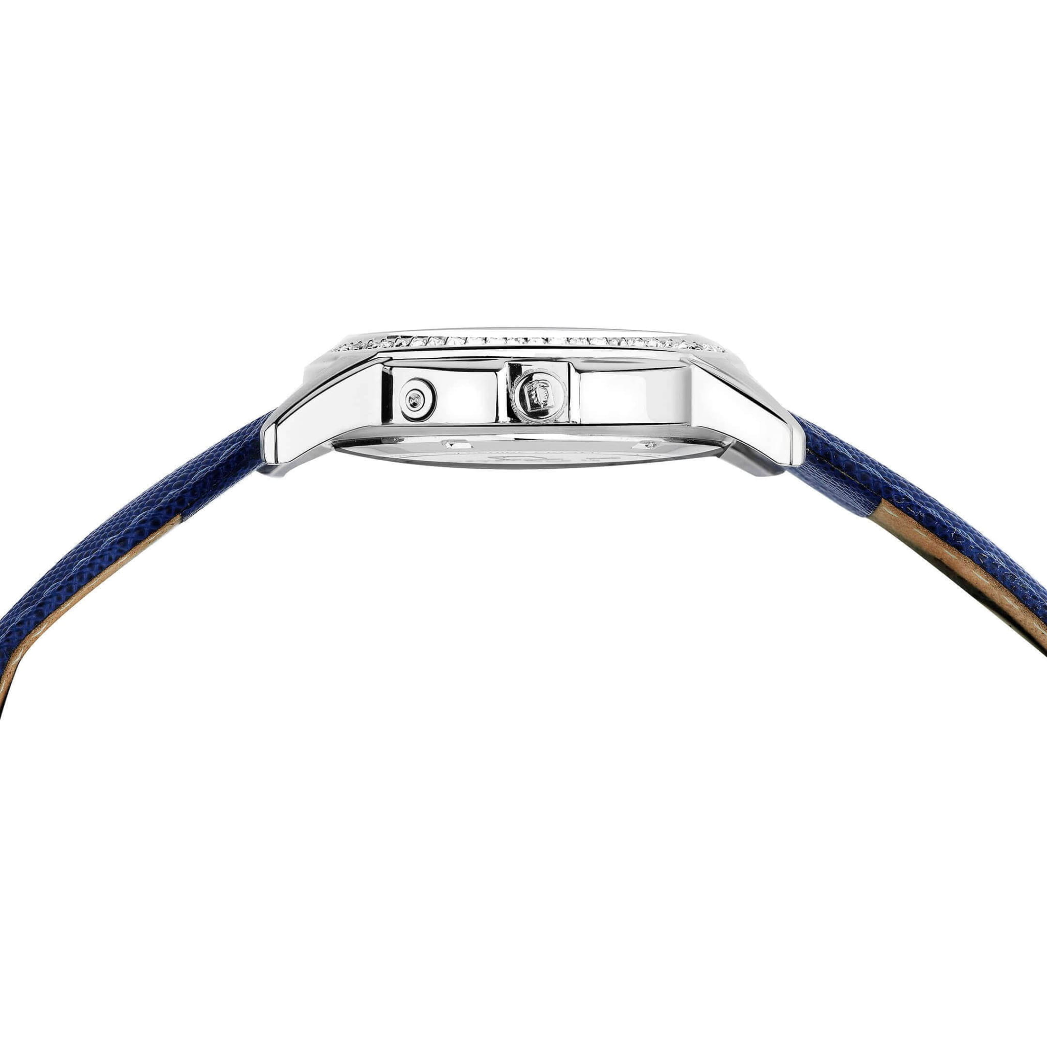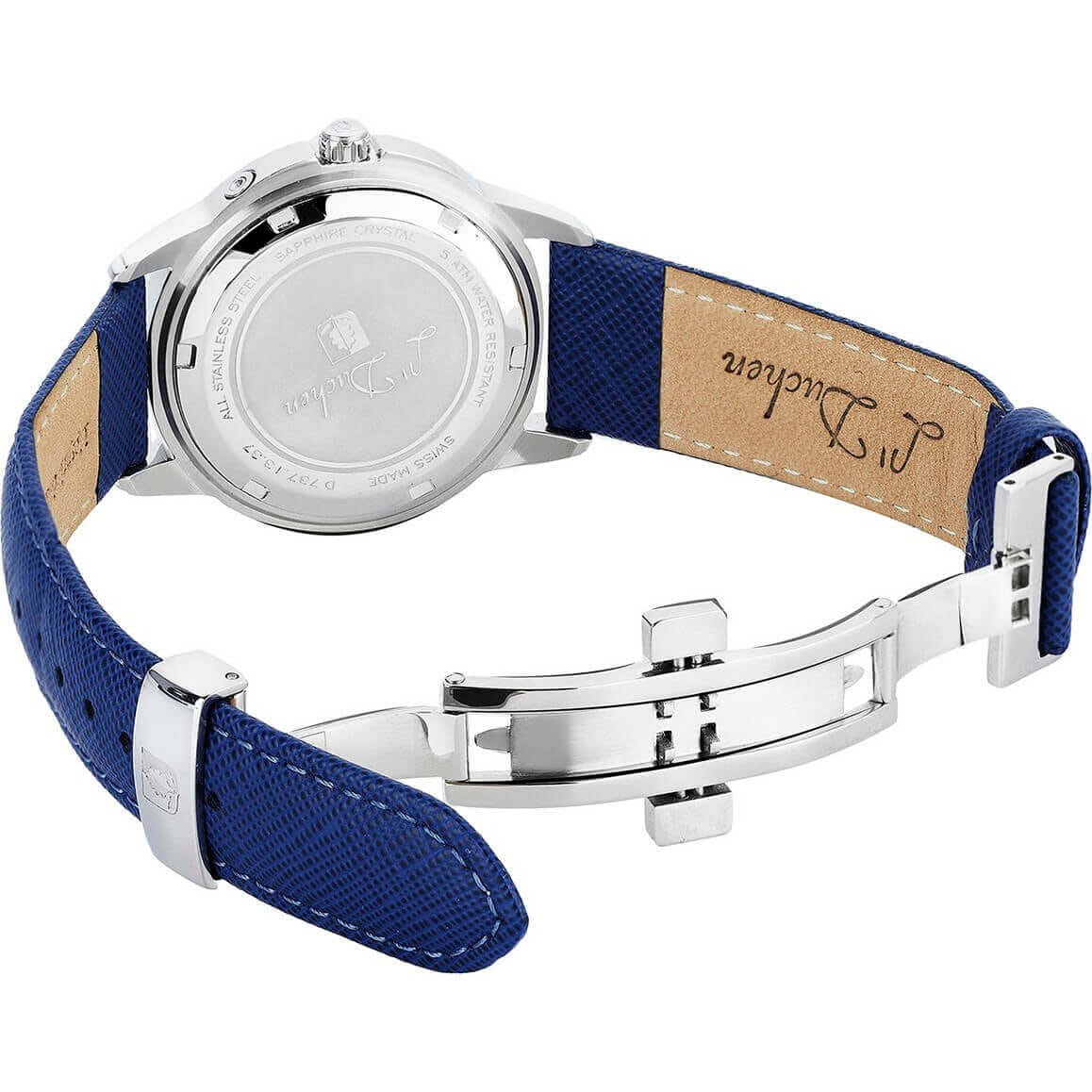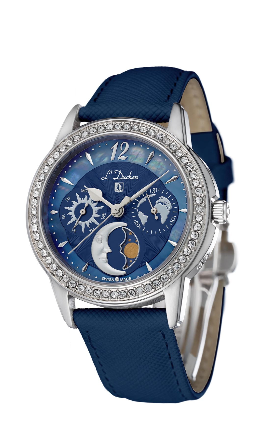Женские кварцевые часы L'Duchen из коллекции Celeste — это изысканный аксессуар, сочетающий швейцарское качество и элегантный дизайн. Корпус круглой формы выполнен из стали и защищён сапфировым стекломСапфировое стеклоПрочный и надёжный материал из кристалла сапфира синтетического происхождения, характеризующийся особой твёрдостью и устойчивостью к царапинам и повреждениям.. Циферблат синего цвета украшен перламутровым кольцом по краю, придающим модели уникальность и благородное сияние. Центральная часть оформлена волнообразным гильоше, индикатор дня недели представлен в виде солнечного диска, а даты — изображением карты Земли. Указатель выделен металлической рамкой и дополнен объёмным элементом в виде месяца. Широкий полированный безельБезельВнешний ободок, закрепляющий стекло. В спортивных часах так называется поворотное кольцо с делениями на циферблате, выполняет роль таймера – замеряет отрезки времени на шкале. Неподвижный безель – элемент декора. Однонаправленно вращающийся безель на дайверских часах позволяет фиксировать моменты погружения и выныривания на поверхность. инкрустирован фианитами, эффектно переливающимися на свету. Часы оснащены ремешком из натуральной кожи синего цвета с сафьяновым тиснением и застёжкой «бабочка» с кнопкамиЗастёжка "бабочка"Такой вид застёжки дополняется предохранителями, помогающими избежать случайного раскрытия браслета. Обладают изящным исполнением. , украшенной логотипом бренда. Водонепроницаемость 50 м позволяет использовать часы в повседневных условиях, защищая от случайных брызг и капель дождя.
