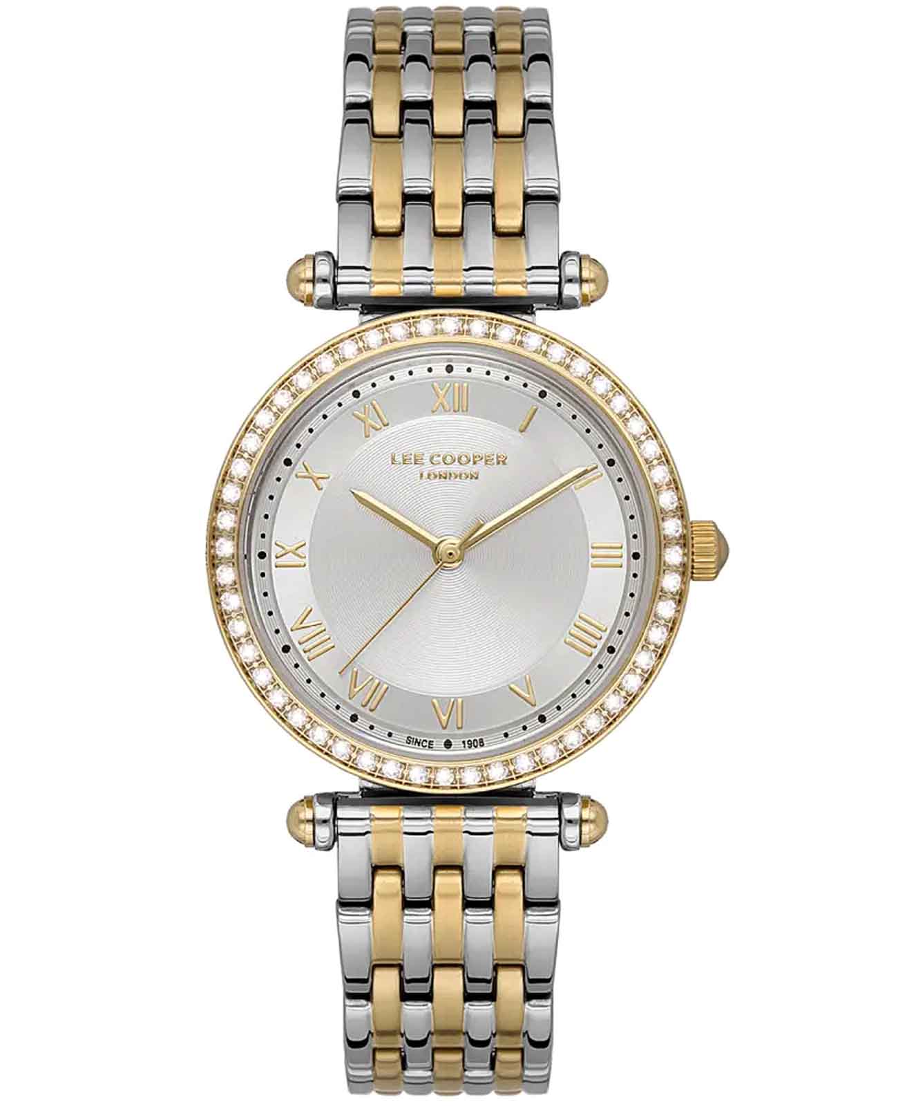 Женские наручные часы Lee Cooper LC07136.230 — это элегантная модель с утончённым дизайном. Корпус диаметром 32 мм выполнен из нержавеющей стали, что придаёт часам изысканный вид. Серебристый циферблат украшен изящными римскими цифрами и стрелками, обеспечивая удобное считывание времени. Циферблат защищён минеральным стекломМинеральное стеклоМинеральное стекло представляет собой искусственно выращенный минерал кварца. Такое стекло отличается особой устойчивостью к повреждениям и царапинам. Уступает по некоторым качествам сапфировому стеклу., устойчивым к царапинам. Часы работают на кварцевом механизме, обеспечивая точность хода. Браслет из нержавеющей стали с раскладной застёжкойРаскладная застёжкаТакой тип застёжки используется только на браслетах из металла. Она никогда не раскрывается полностью, происходит разделение на 2 и более частей. Раскладывающая застёжка снизит вероятность потери часов к минимуму. гарантирует комфортное ношение и надёжную фиксацию на запястье. БезельБезельВнешний ободок, закрепляющий стекло. В спортивных часах так называется поворотное кольцо с делениями на циферблате, выполняет роль таймера – замеряет отрезки времени на шкале. Неподвижный безель – элемент декора. Однонаправленно вращающийся безель на дайверских часах позволяет фиксировать моменты погружения и выныривания на поверхность. с IP-покрытиемIP-покрытиеМетод ионного напыления. Демонстрирует повышенную устойчивость к истиранию, окислению и химическим веществам. Под воздействием высокого давления и температуры около 1500°C молекулы металла надёжно соединяются с частицами корпуса часов. инкрустирован кристаллами. Водозащита 30 метров защищает часы от случайных брызг и дождя, делая их подходящими для повседневного использования.