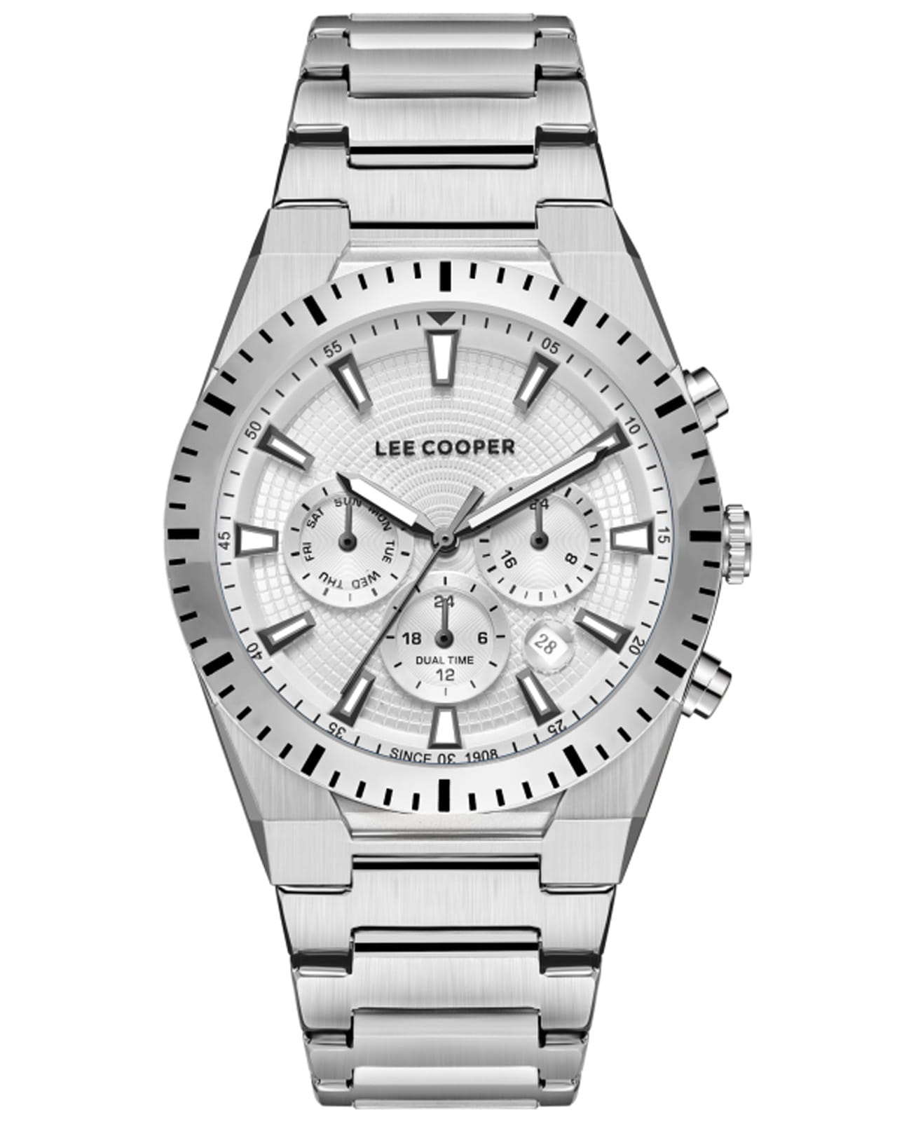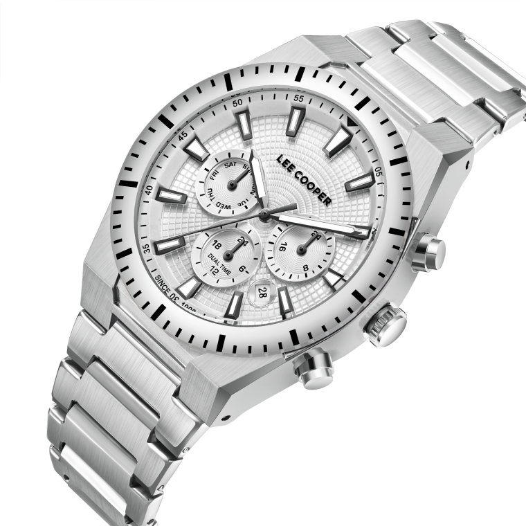Мужские наручные часы Lee Cooper LC08100.330 — элегантная модель с функциональными возможностями для повседневного использования. Круглый корпус из суперметалла придаёт часам классический и современный вид. Серебристый циферблат оснащён дополнительными индикаторами и функцией хронографаХронографФункция позволяет измерять отрезки времени с особой точностью: часы, минуты, секунды. Верным признаком хронографа является наличие на циферблате 3 дополнительных окошек-счётчиков., что позволяет измерять временные интервалы с высокой точностью. Стрелки и метки покрыты люминесцентным покрытиемЛюминесцентное покрытиеПозволяет считывать показания времени в темноте. Производители наносят на стрелки, часовые индексы, безель или поверхность циферблата светонакопительный состав, дающий холодное свечение., обеспечивая удобное считывание показаний в условиях недостаточного освещения. Циферблат защищён минеральным стекломМинеральное стеклоМинеральное стекло представляет собой искусственно выращенный минерал кварца. Такое стекло отличается особой устойчивостью к повреждениям и царапинам. Уступает по некоторым качествам сапфировому стеклу., устойчивым к царапинам. Часы работают на кварцевом механизме, обеспечивающем точность хода. Браслет из нержавеющей стали с раскладной застёжкойРаскладная застёжкаТакой тип застёжки используется только на браслетах из металла. Она никогда не раскрывается полностью, происходит разделение на 2 и более частей. Раскладывающая застёжка снизит вероятность потери часов к минимуму. гарантирует удобную посадку и надёжную фиксацию на запястье. Водозащита 50 метров защищает часы от брызг и дождя, делая их подходящими для повседневного использования.