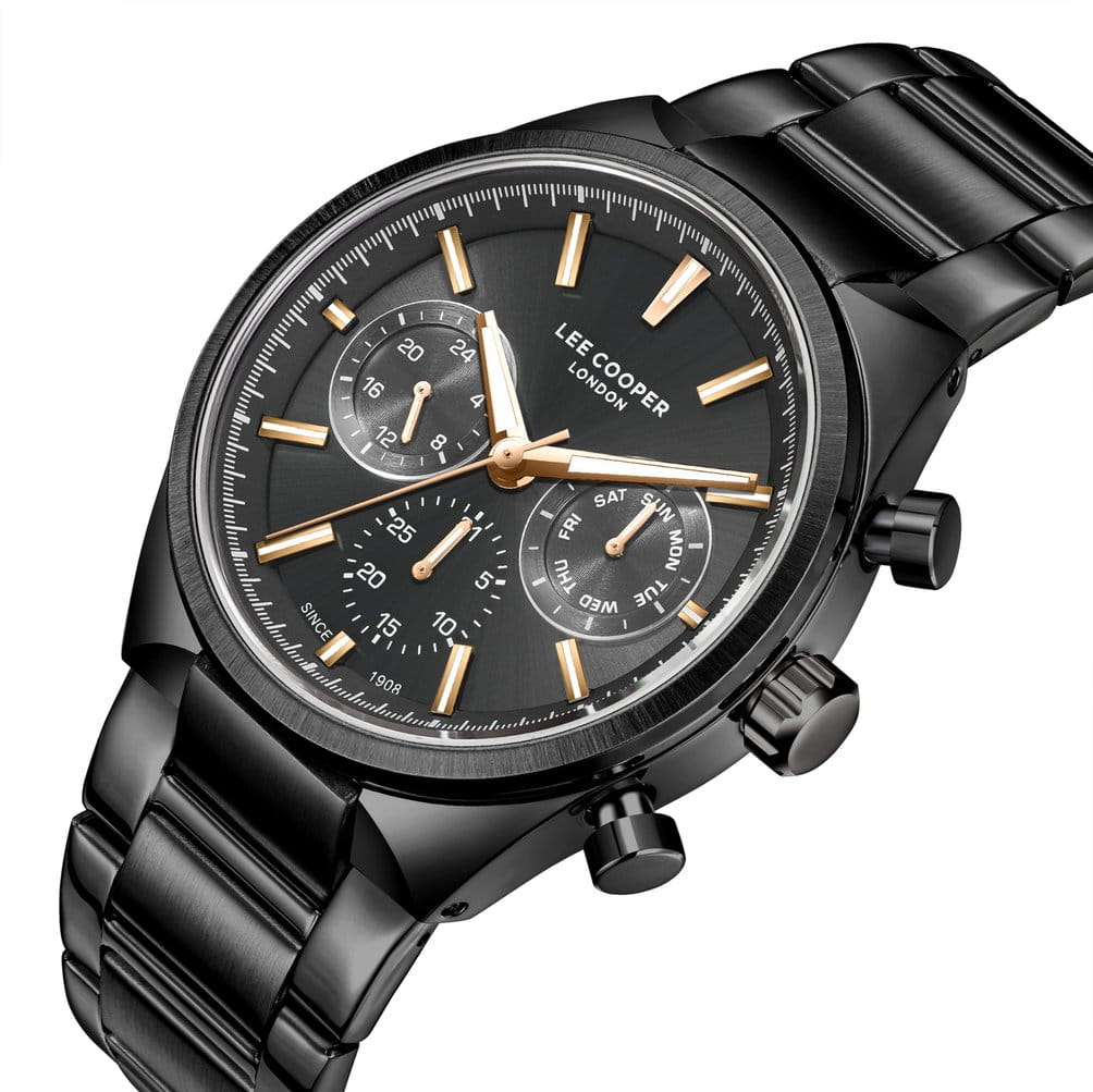 Мужские наручные часы Lee Cooper LC08174.650 оснащены кварцевым механизмом, обеспечивающий высокую точность хода и надежность. Элегантный корпус часов выполнен из суперметалла с IP-покрытиемIP-покрытиеМетод ионного напыления. Демонстрирует повышенную устойчивость к истиранию, окислению и химическим веществам. Под воздействием высокого давления и температуры около 1500°C молекулы металла надёжно соединяются с частицами корпуса часов. черного цвета, что делает их устойчивыми к внешним воздействиям и придает благородный вид. Циферблат украшен классическими стрелками и метками с люминесцентным покрытиемЛюминесцентное покрытиеПозволяет считывать показания времени в темноте. Производители наносят на стрелки, часовые индексы, безель или поверхность циферблата светонакопительный состав, дающий холодное свечение., гармонично дополняющим общий дизайн модели. Для защиты циферблата используется минеральное стеклоМинеральное стеклоМинеральное стекло представляет собой искусственно выращенный минерал кварца. Такое стекло отличается особой устойчивостью к повреждениям и царапинам. Уступает по некоторым качествам сапфировому стеклу., устойчивое к царапинам и механическим повреждениям. Корпус имеет круглую форму диаметром 42 мм, что делает часы заметными и подходящими. Браслет из стали с IP-покрытиемIP-покрытиеМетод ионного напыления. Демонстрирует повышенную устойчивость к истиранию, окислению и химическим веществам. Под воздействием высокого давления и температуры около 1500°C молекулы металла надёжно соединяются с частицами корпуса часов. оснащен раскладной застёжкойРаскладная застёжкаТакой тип застёжки используется только на браслетах из металла. Она никогда не раскрывается полностью, происходит разделение на 2 и более частей. Раскладывающая застёжка снизит вероятность потери часов к минимуму., обеспечивающим комфортное и безопасное ношение. Вынесенный циферблат с 24-х часовым указателем времени, индикацией даты и дня недели. Часы обладают водонепроницаемостью до 50 метров (5 АТМ), что позволяет использовать их в повседневной жизни, включая контакт с водой при мытье рук или дожде. Эти часы станут идеальным выбором для мужчин, ценящих стиль, качество и функциональность.
