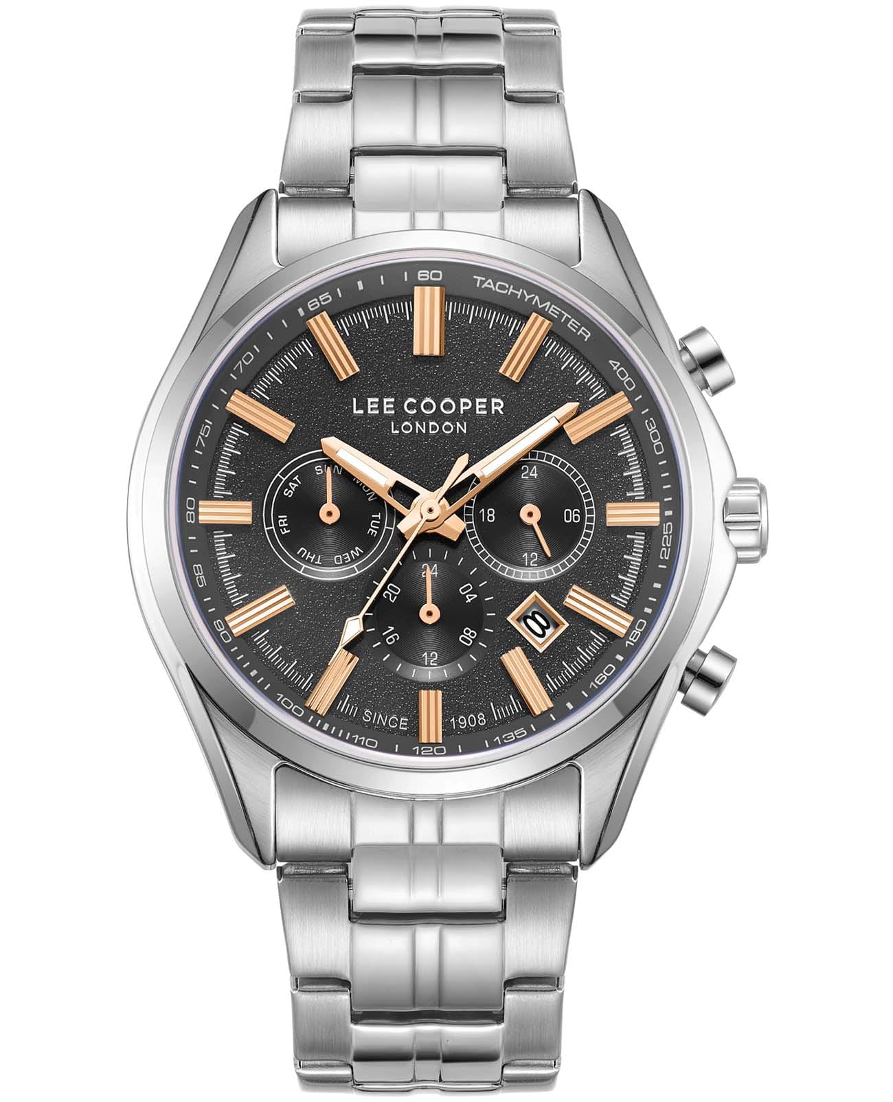 Мужские наручные часы Lee Cooper LC08199.360 оснащены кварцевым механизмом, обеспечивающий высокую точность хода и надежность. Элегантный корпус часов выполнен из суперметалла серебристого цвета, что делает их устойчивыми к внешним воздействиям и придает благородный вид. Циферблат украшен классическими стрелками с люминесцентным покрытиемЛюминесцентное покрытиеПозволяет считывать показания времени в темноте. Производители наносят на стрелки, часовые индексы, безель или поверхность циферблата светонакопительный состав, дающий холодное свечение., гармонично дополняющим общий дизайн модели. Для защиты циферблата используется минеральное стеклоМинеральное стеклоМинеральное стекло представляет собой искусственно выращенный минерал кварца. Такое стекло отличается особой устойчивостью к повреждениям и царапинам. Уступает по некоторым качествам сапфировому стеклу., устойчивое к царапинам и механическим повреждениям, тахиметрТахиметрРазмеченная шкала, располагается на ободке или безеле часов. Тахиметр позволяет рассчитать скорость на определённом участке пути, расстояние измеряется в километрах или милях. по внешнему краю. Корпус имеет круглую форму диаметром 44 мм, что делает часы заметными и подходящими. Браслет из стали оснащен раскладной застёжкойРаскладная застёжкаТакой тип застёжки используется только на браслетах из металла. Она никогда не раскрывается полностью, происходит разделение на 2 и более частей. Раскладывающая застёжка снизит вероятность потери часов к минимуму., обеспечивающим комфортное и безопасное ношение. Вынесенный циферблат с 24-х часовым указателем времени, индикацией даты и дня недели. Окошко даты находится в положении между 4 и 5 часов. Часы обладают водонепроницаемостью до 30 метров (3 АТМ), что позволяет использовать их в повседневной жизни, включая контакт с водой при мытье рук или дожде. Эти часы станут идеальным выбором для мужчин, ценящих стиль, качество и функциональность.