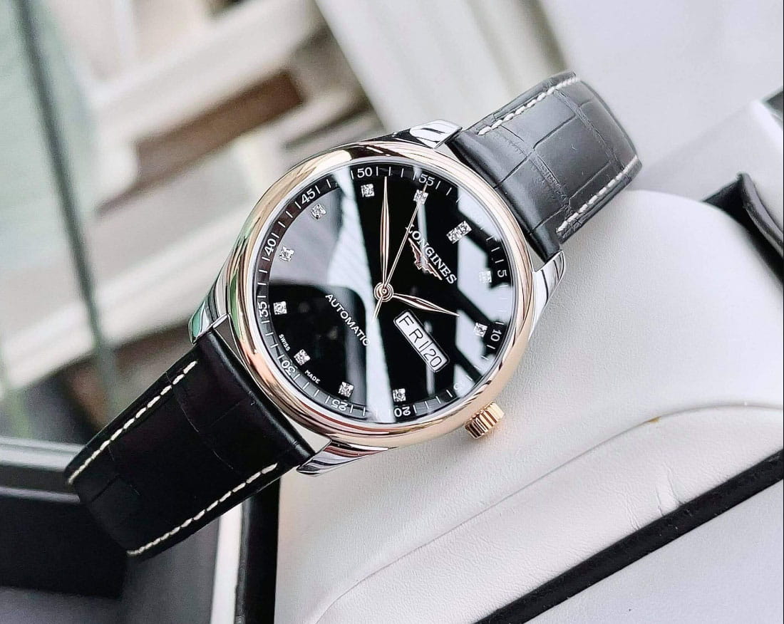 Мужские механические швейцарские часы с автоподзаводом Longines Master Collection L2.755.5.59.2, механический механизм (автоматический калибр) с высокой точностью. Сапфировое стеклоСапфировое стеклоПрочный и надёжный материал из кристалла сапфира синтетического происхождения, характеризующийся особой твёрдостью и устойчивостью к царапинам и повреждениям. устойчивое к появлению царапин, обладающее высокой прозрачностью. Класс водозащиты: 30 метров, позволит защитить корпус от случайных брызг или капель дождя. Корпус часов изготовлен из полированной нержавеющей стали. БезельБезельВнешний ободок, закрепляющий стекло. В спортивных часах так называется поворотное кольцо с делениями на циферблате, выполняет роль таймера – замеряет отрезки времени на шкале. Неподвижный безель – элемент декора. Однонаправленно вращающийся безель на дайверских часах позволяет фиксировать моменты погружения и выныривания на поверхность. из 18-каратного розового золота18-каратное золотоОбозначение по каратной системе пробирования, оно показывает, сколько драгоценного металла содержится в изделии. 18 карат - в составе 75% чистого золота, соответствует 750 пробе.