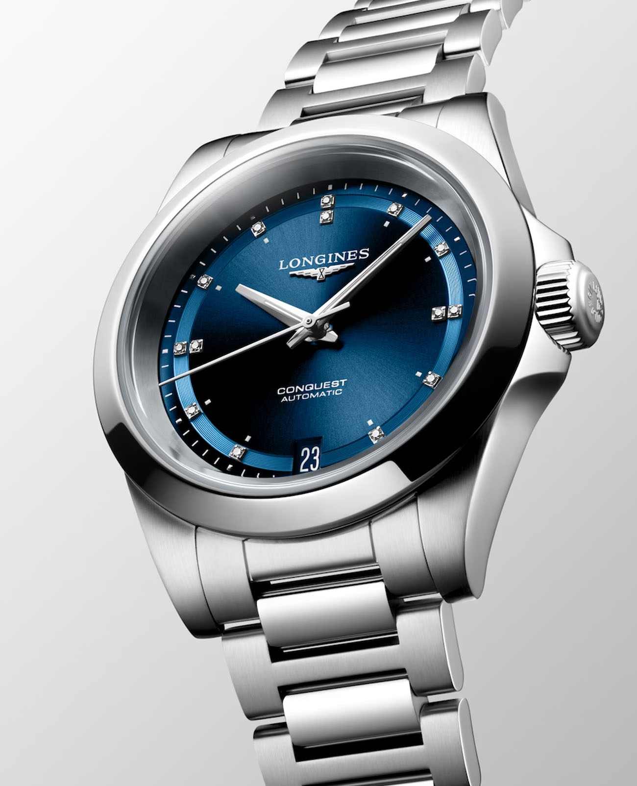 Женские швейцарские механические часы с автоподзаводом Longines Conquest L3.430.4.97.6. Сапфировое стеклоСапфировое стеклоПрочный и надёжный материал из кристалла сапфира синтетического происхождения, характеризующийся особой твёрдостью и устойчивостью к царапинам и повреждениям. устойчивое к появлению царапин, обладающее высокой прозрачностью. Корпус часов изготовлен из нержавеющей стали. Циферблат выполнен по технологии Sunray (солнечные лучи). Циферблат с 14 бриллиантами группы Top Wesselton VS-SI общим весом 0.035 карата. Стрелки с люминесцентным покрытиемЛюминесцентное покрытиеПозволяет считывать показания времени в темноте. Производители наносят на стрелки, часовые индексы, безель или поверхность циферблата светонакопительный состав, дающий холодное свечение.. Окошко даты в положении 6 часов. Прозрачная задняя крышка. Класс водозащиты: 100 метров, позволит плавать, нырять и заниматься другими водными видами спорта. Стальной браслет на раскладной застёжкеРаскладная застёжкаТакой тип застёжки используется только на браслетах из металла. Она никогда не раскрывается полностью, происходит разделение на 2 и более частей. Раскладывающая застёжка снизит вероятность потери часов к минимуму..