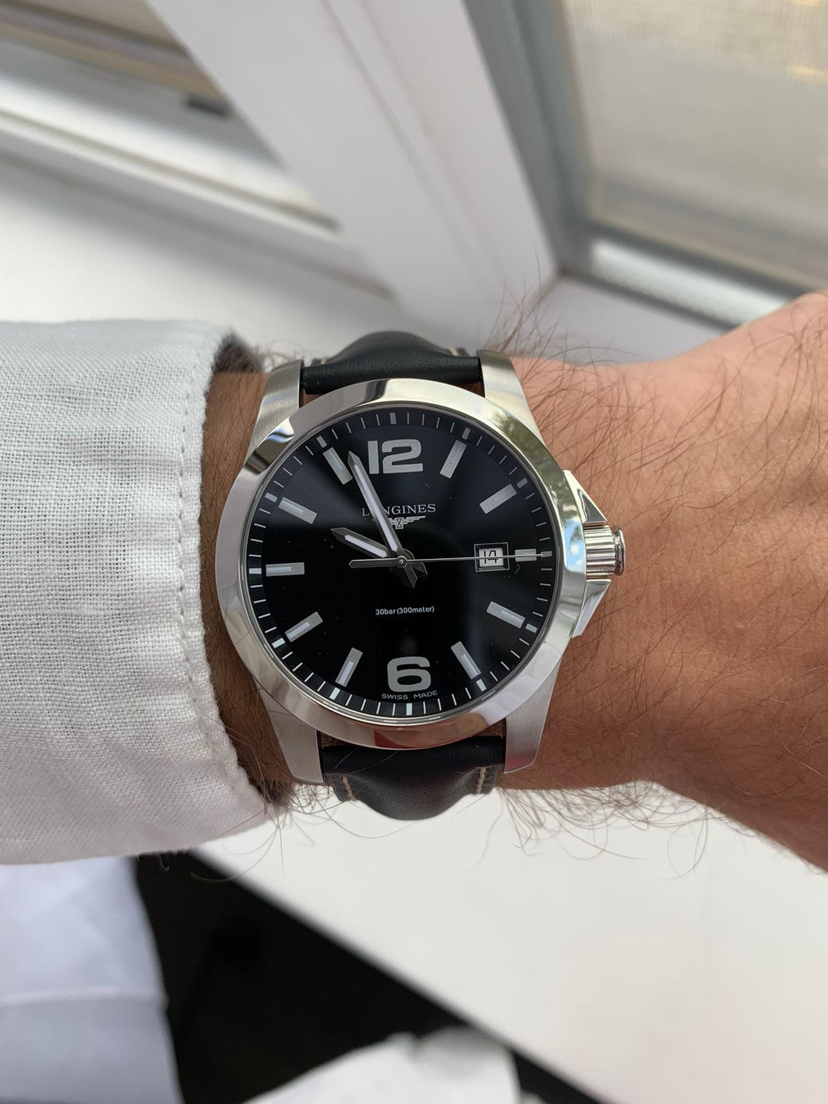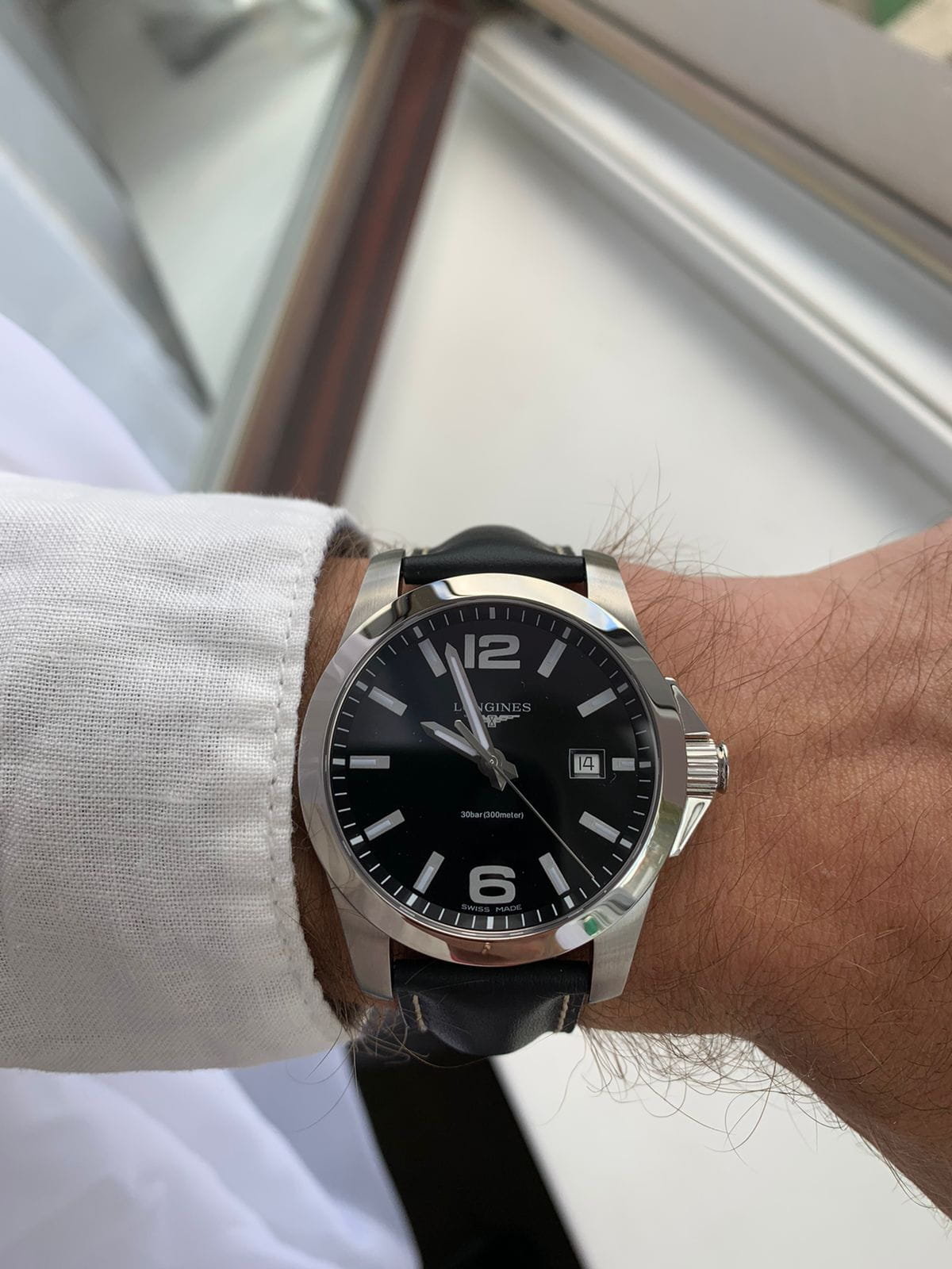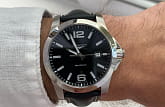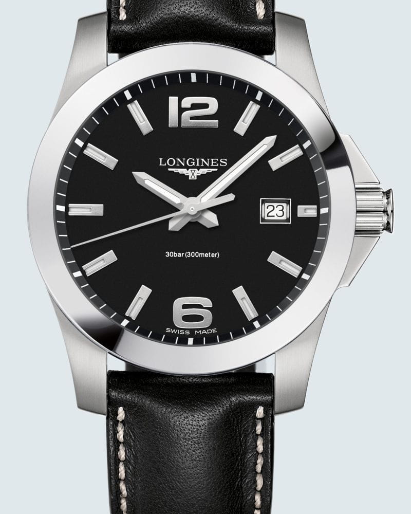 Часы Longines Conquest (артикул L37594583) сочетают спортивную элегантность и высокую функциональность, характерные для коллекции Conquest. Корпус диаметром 41 мм выполнен из нержавеющей стали с водозащитой до 30 бар (300 метров). Завинчивающаяся заводная головка и задняя крышка подчёркивают практичность. Чёрный лакированный циферблат с полированной отделкой оснащён накладными арабскими цифрами и индексами, стрелками с люминесцентным покрытием Swiss Super-LumiNova®Люминесцентное покрытиеПозволяет считывать показания времени в темноте. Производители наносят на стрелки, часовые индексы, безель или поверхность циферблата светонакопительный состав, дающий холодное свечение., а также окошком даты в положении «3 часа». Циферблат защищён сапфировым стекломСапфировое стеклоПрочный и надёжный материал из кристалла сапфира синтетического происхождения, характеризующийся особой твёрдостью и устойчивостью к царапинам и повреждениям. с антибликовым покрытием.